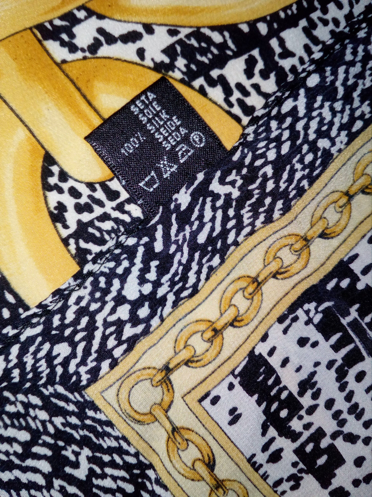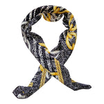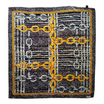 Prix unitaire parFoulard de soie, imprimé chaines, couleur noir et jaune, à nouer autour du cou ou dans les cheveux. Made in Italy. Pièce unique vintage des années 90, une pièce qui ne vous quittera plus cet hiver.