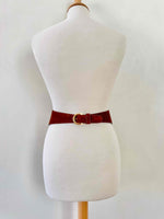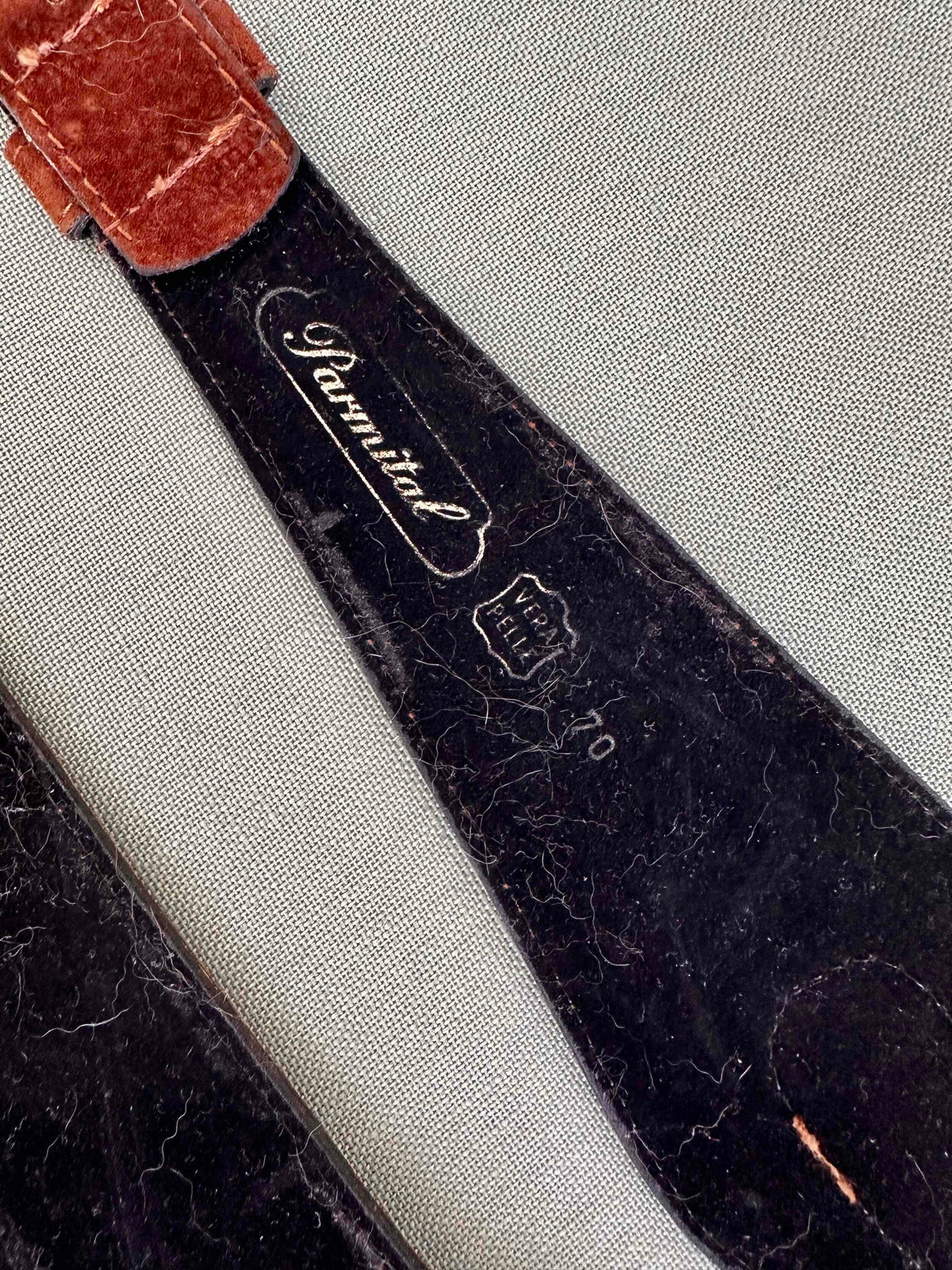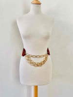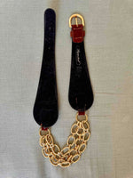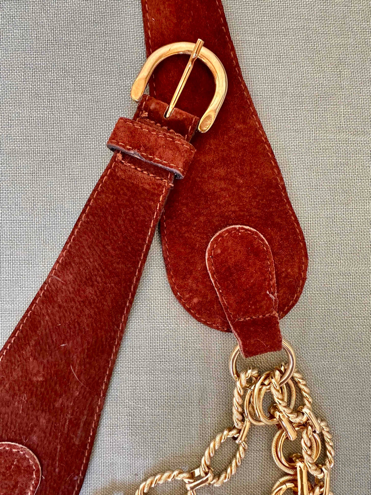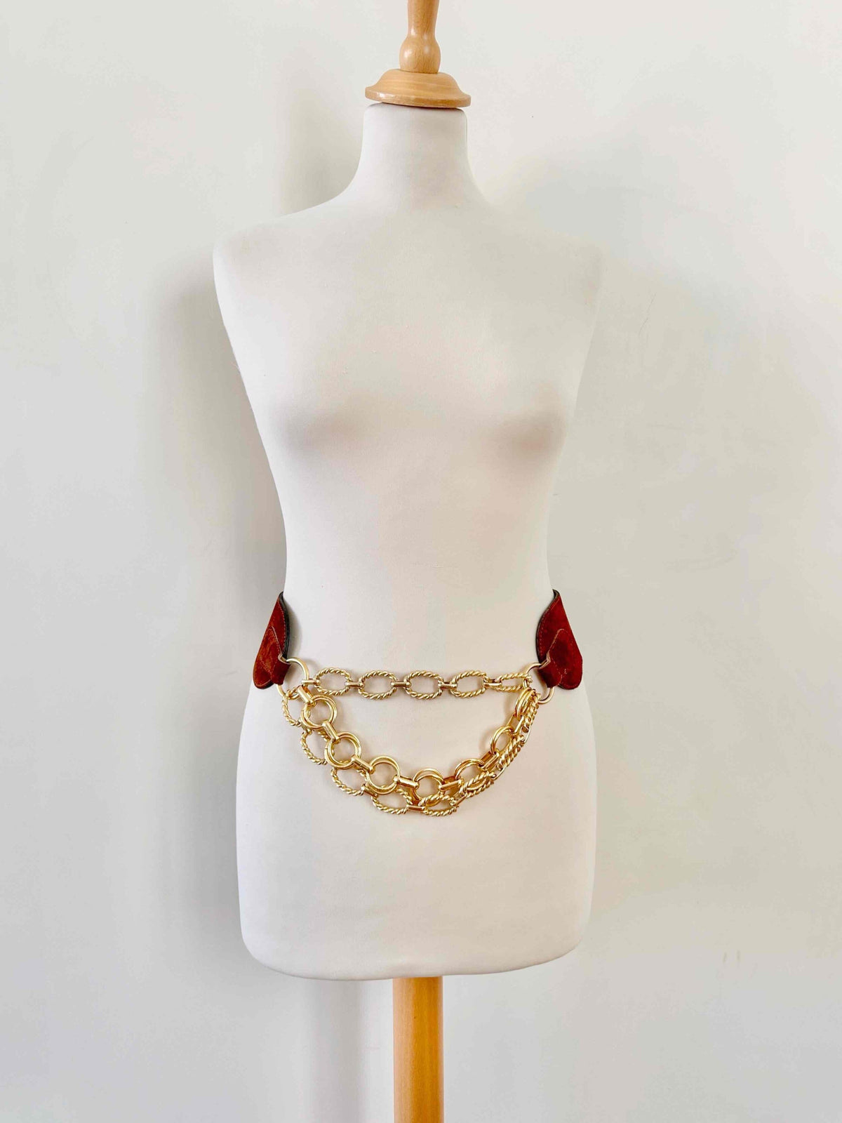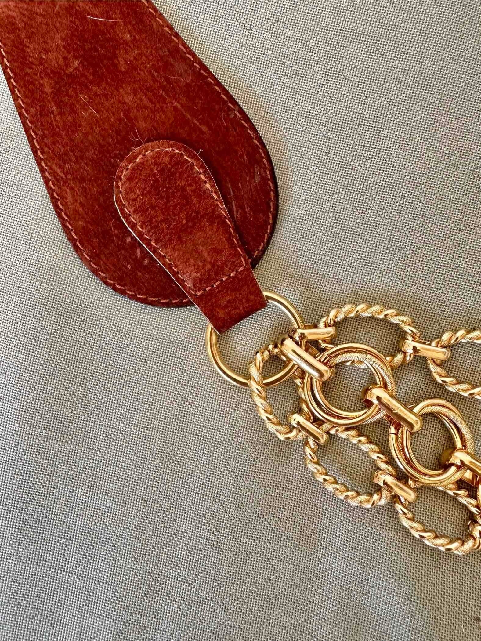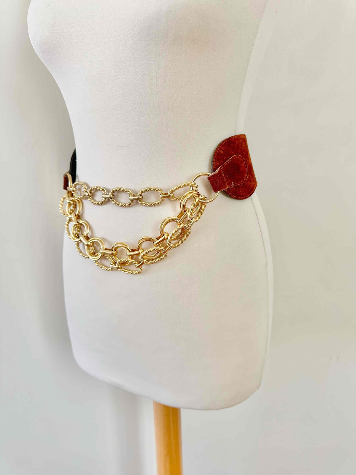 Prix unitaire parCeinture en cuir et chaîne 80s, daim caramel cognac et devant à trois rangs de chaînes dorées fantaisie, boucle dorée au dos, fabriquée en Italie, porté taille et petites hanches, convient aux tailles 34 et 36, portée ici sur un mannequin T36, longueur min 67cm, longueur max 72cm.