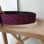 Prix unitaire parCeinture en tissu bleu marine à motif de pois rose fuchsia. Intérieur simili cuir. Taille 40. Années 90s.