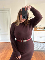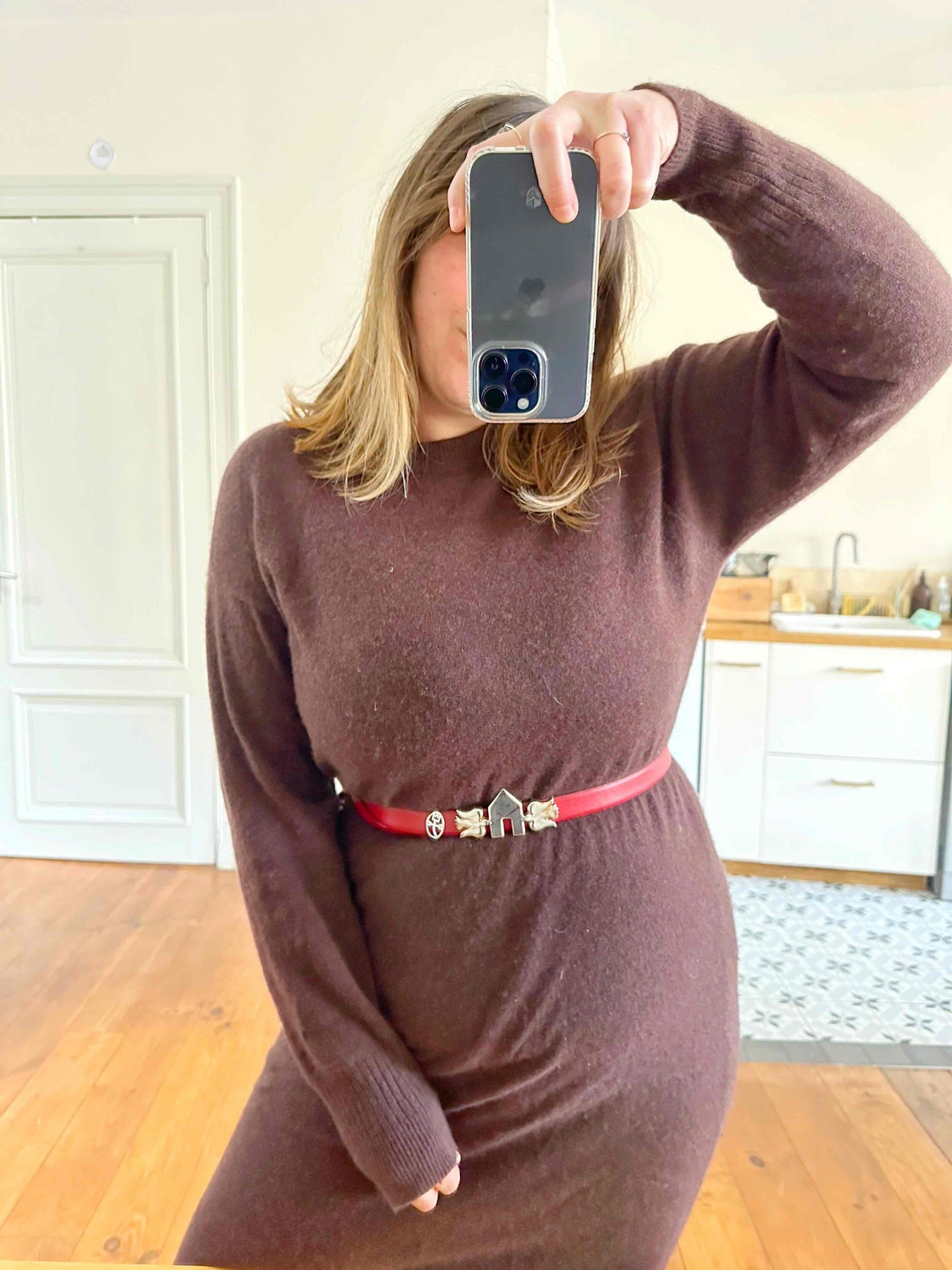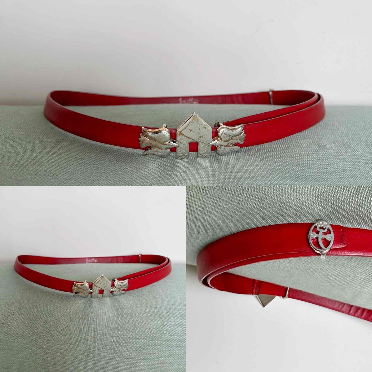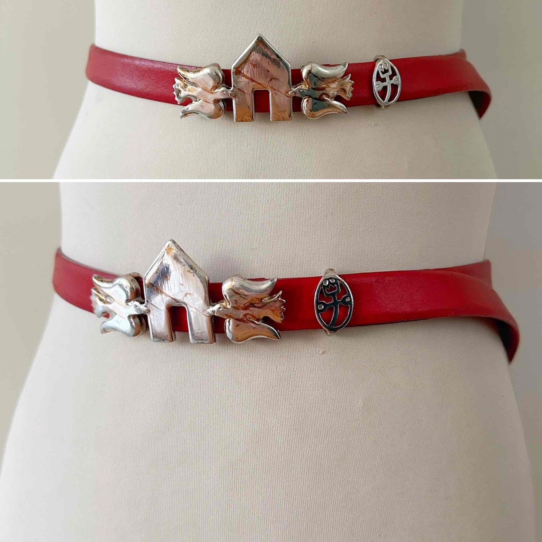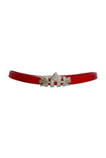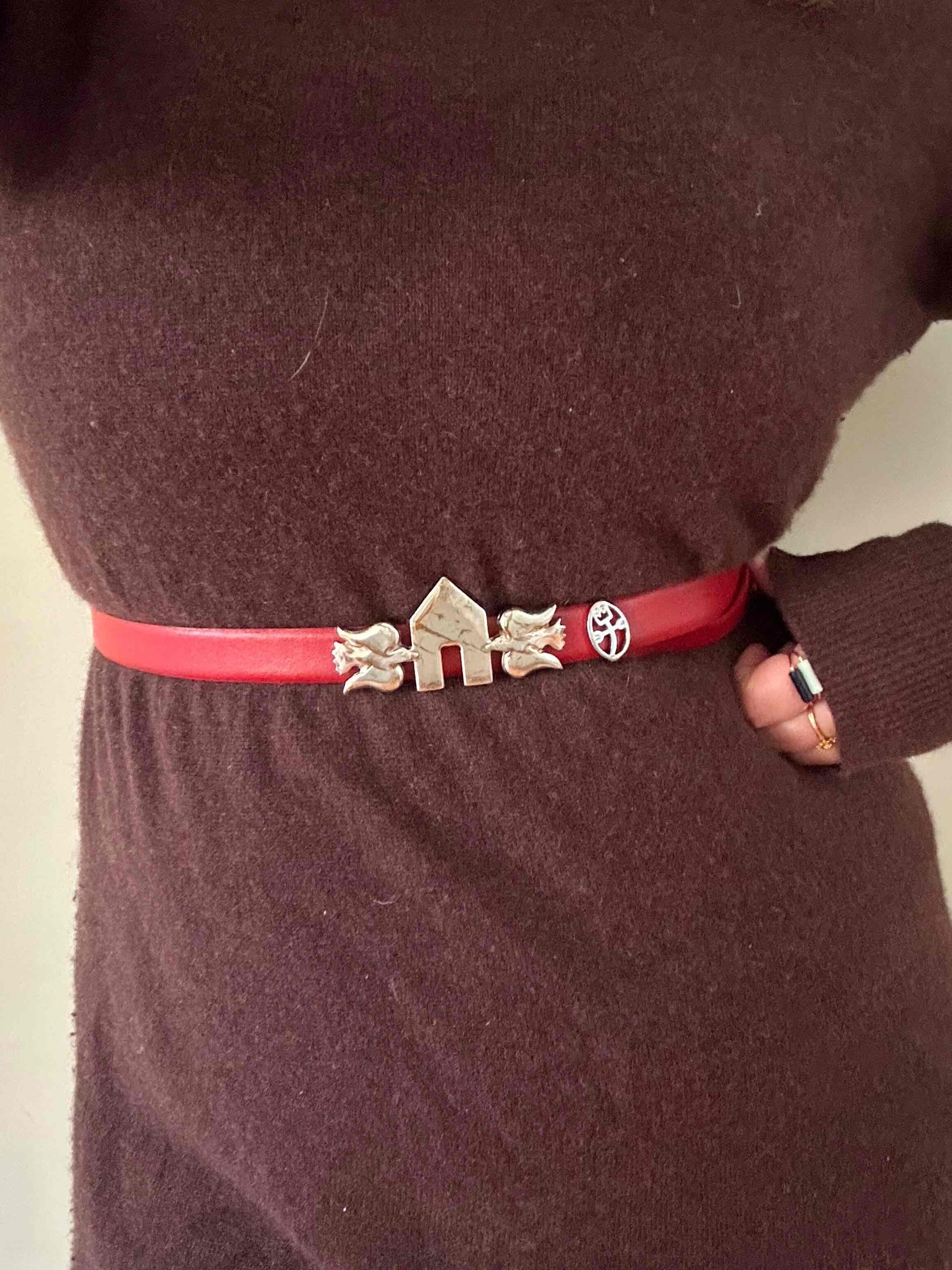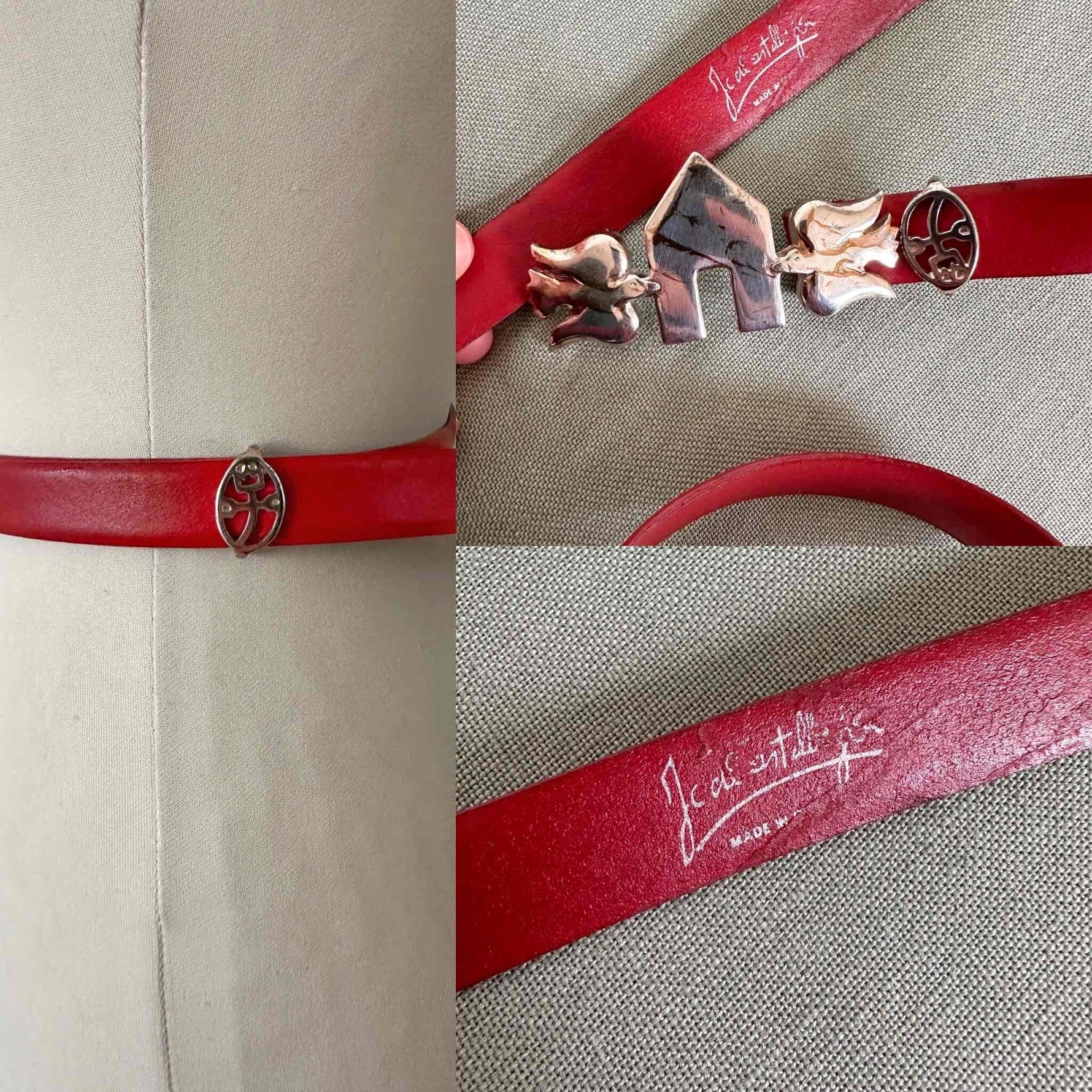 Prix unitaire parCeinture JC de Castelbajac, en cuir rouge, boucle iconique de l’univers Castelbajac en forme de deux oiseaux qui entourent une maisonette, en métal argenté marbré de filaments cuivrés, boucle à glissière avec un passant en metal logo du créateur, convient aux tailles 36/38/40 car pas de trous de serrage, fabriquée en France. Portée ici sur un mannequin T36 et une personne T40.