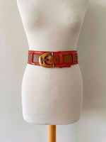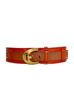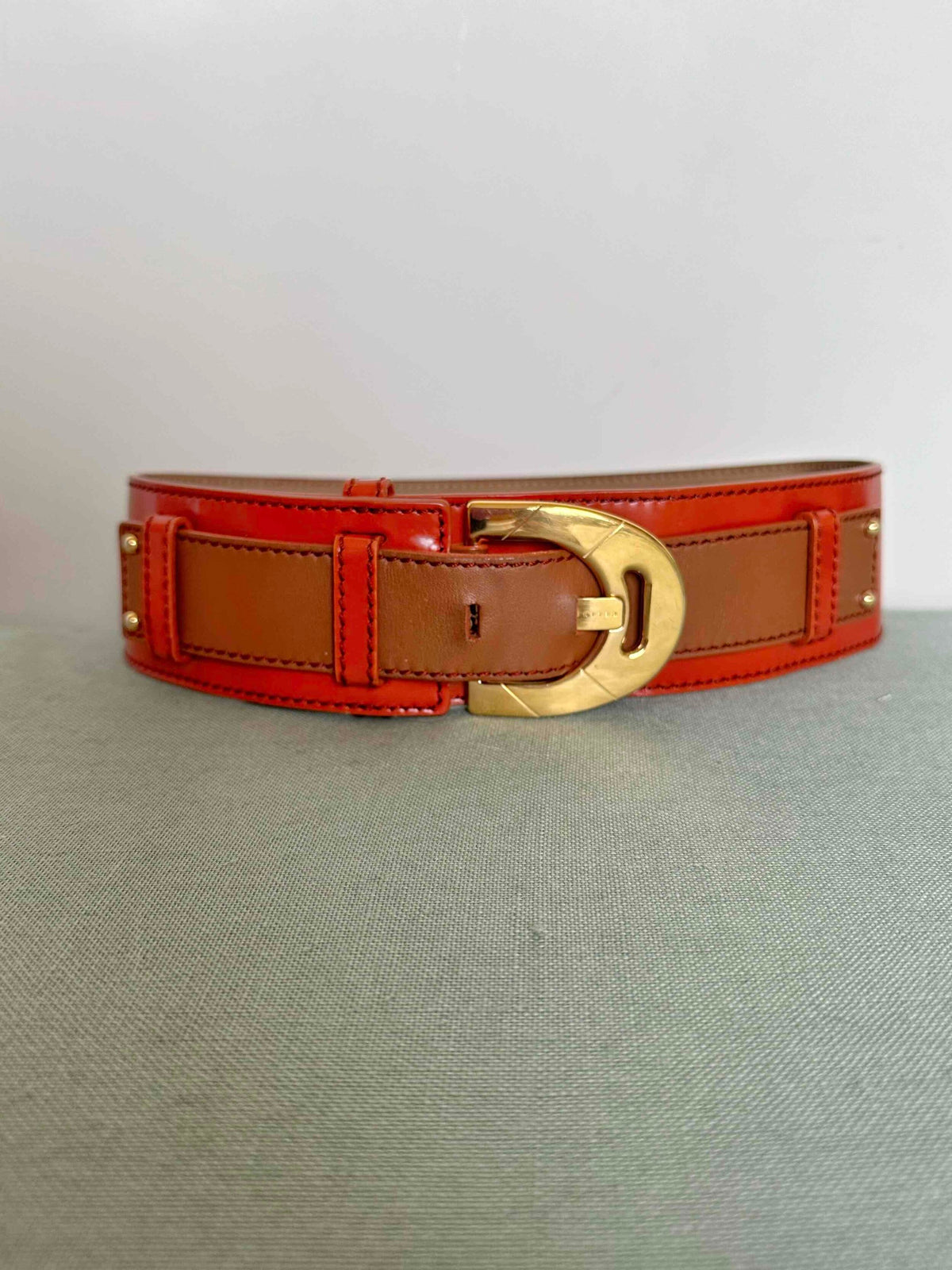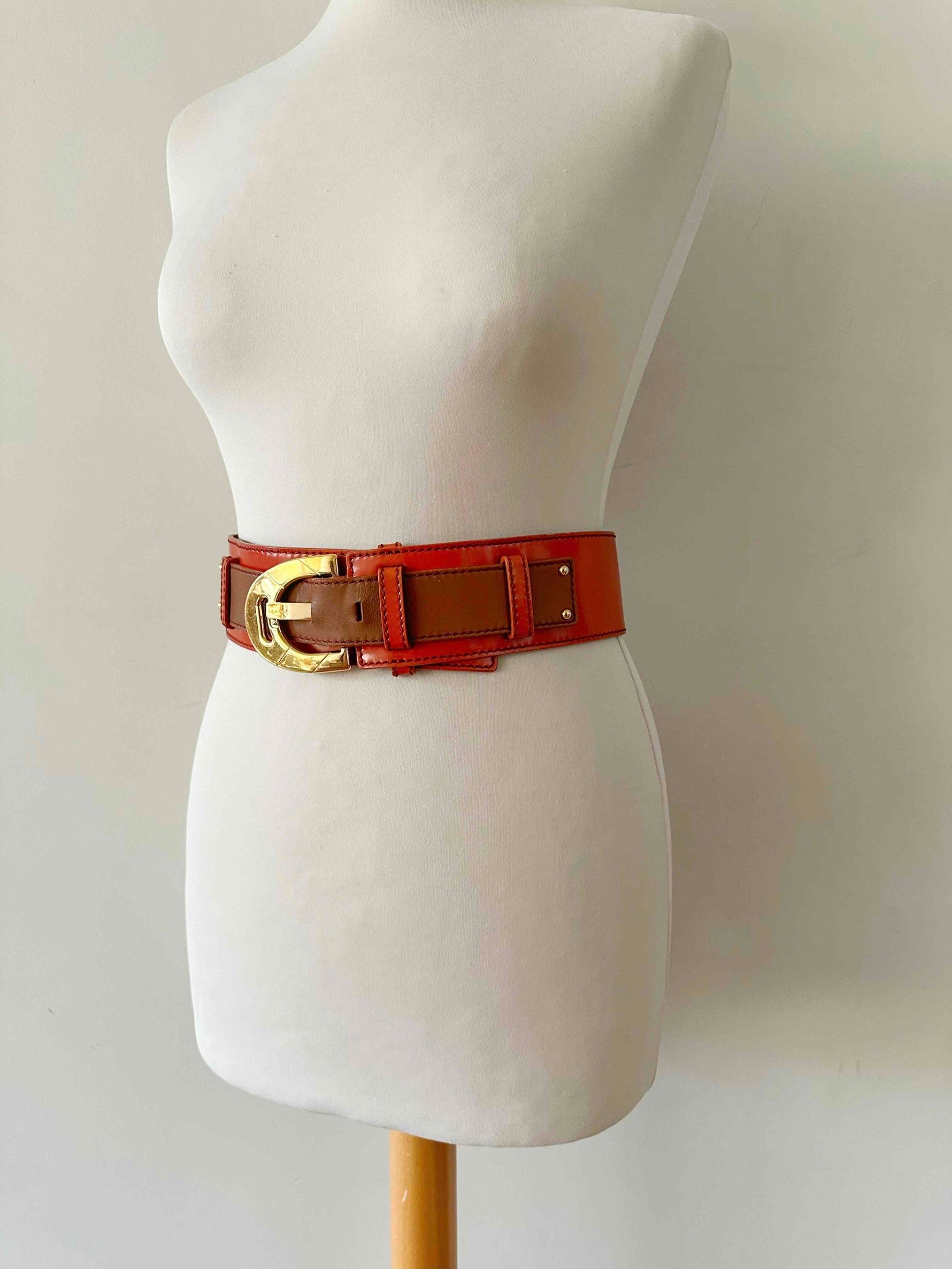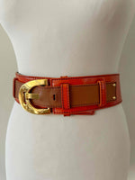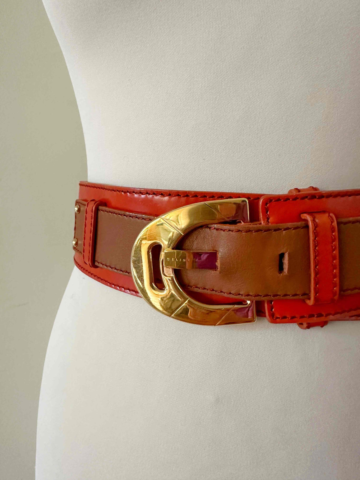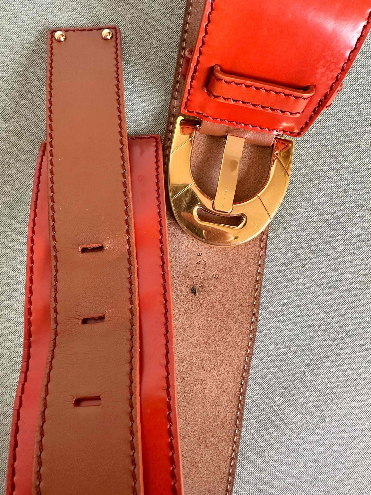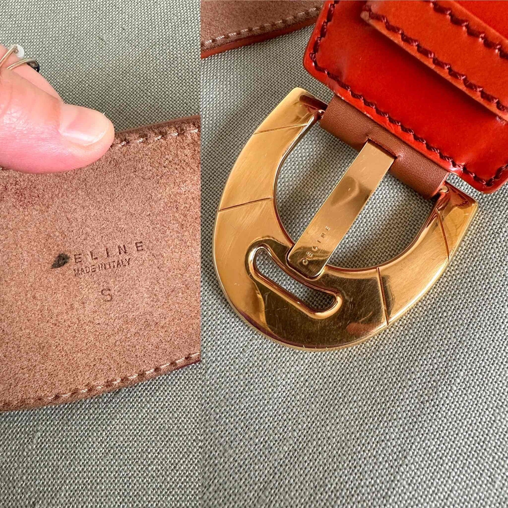 Ceinture en cuir Céline, cuir vernis orange et cuir camel, boucle doré gravé Céline, ceinture taille, fabriquée en Italie, taille 36 portée ici sur un mannequin T36.