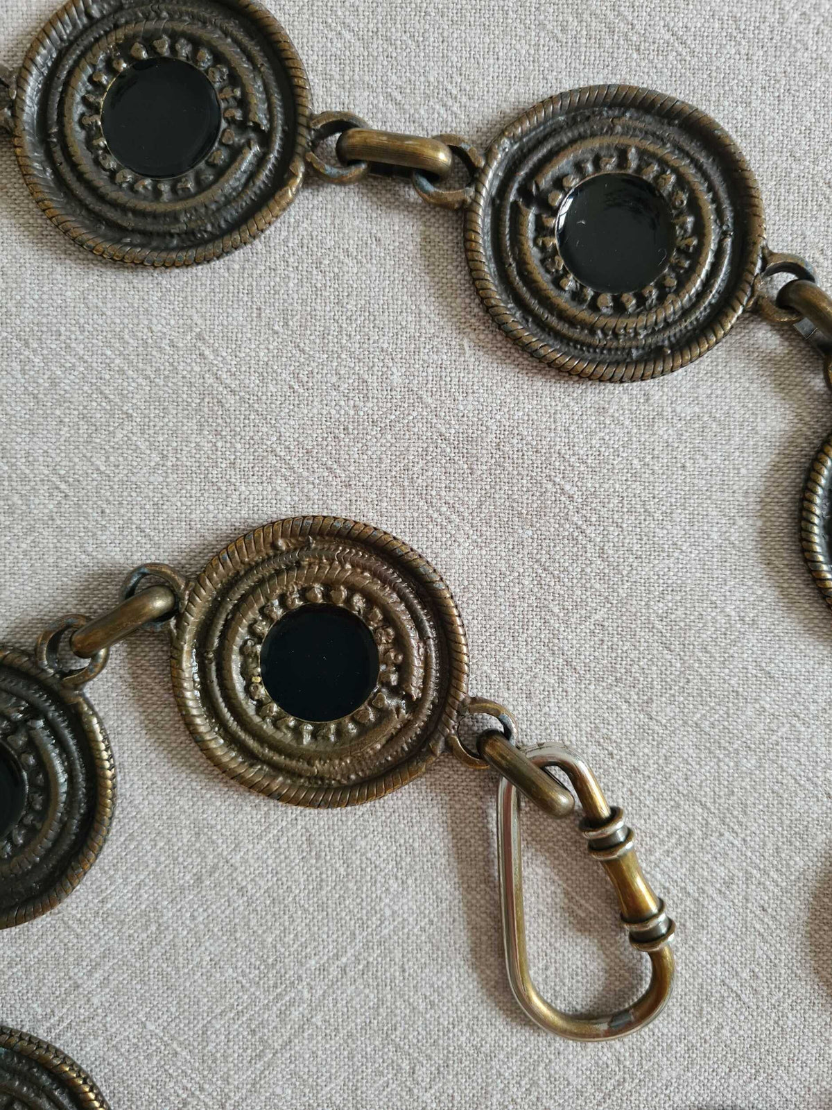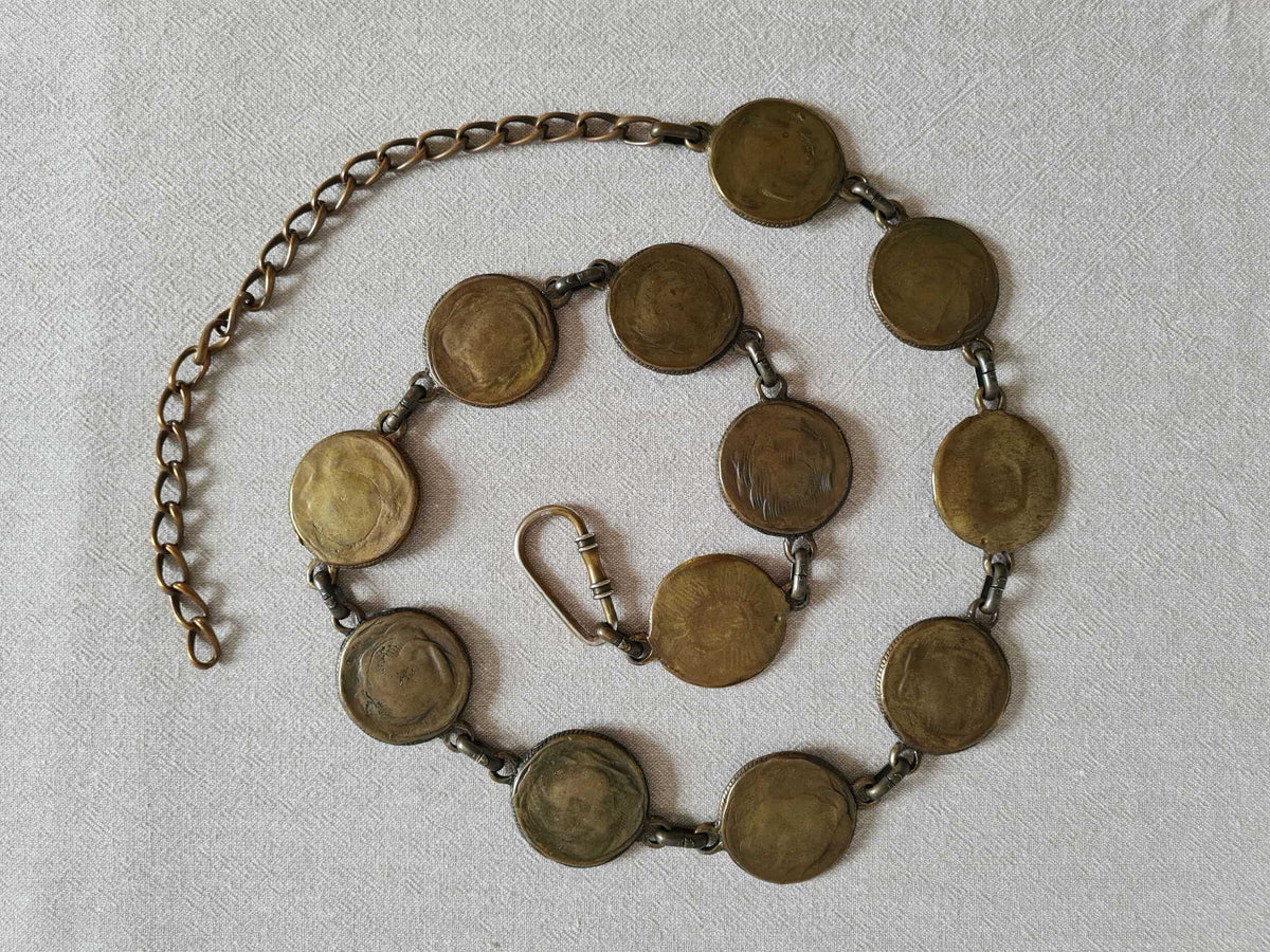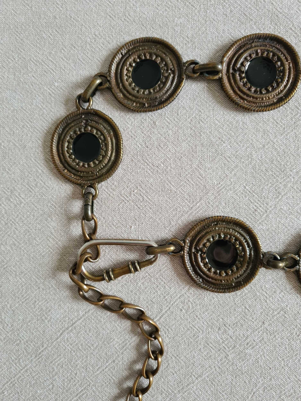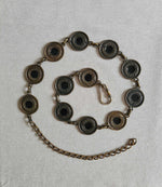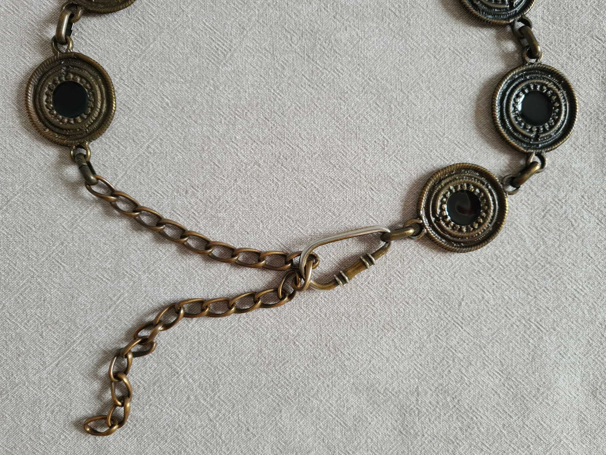 Prix unitaire parCeinture chaîne à motifs métalliques circulaires. Le centre de chaque cercle est émaillé (noir). Doré ancien du métal légèrement irregulier. Fermoir mousqueton.
