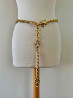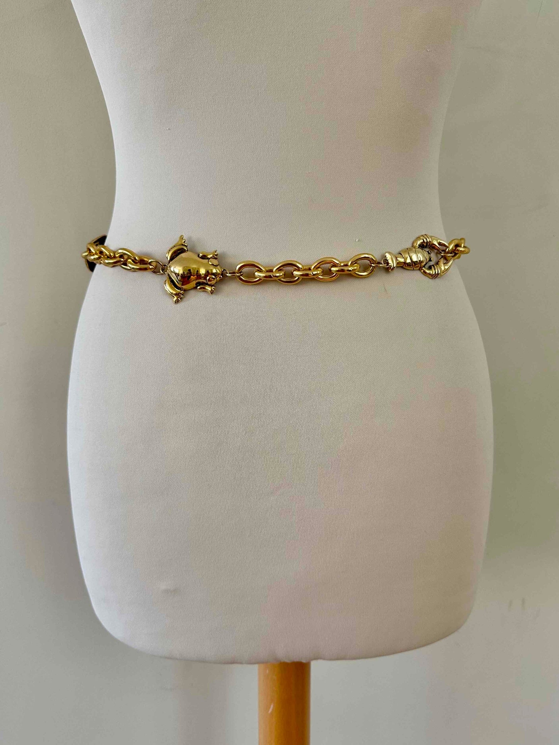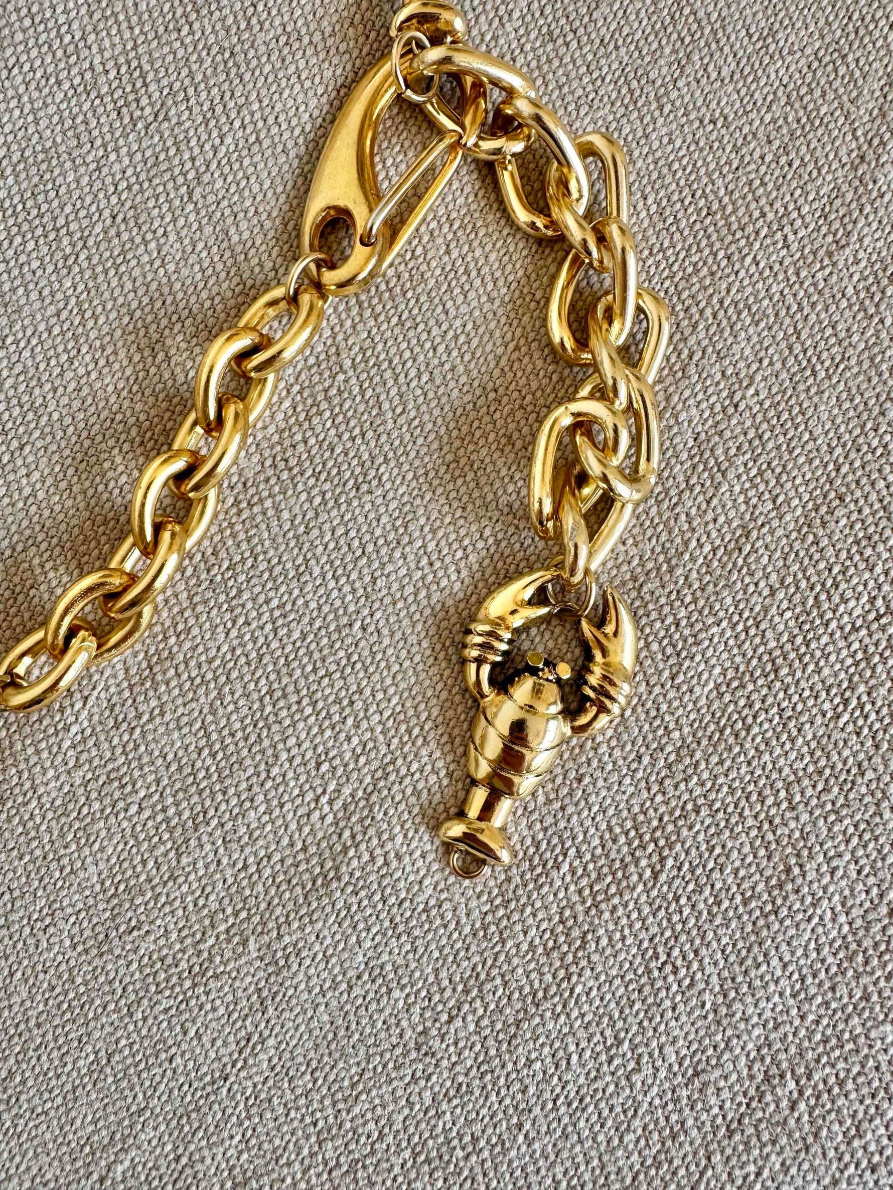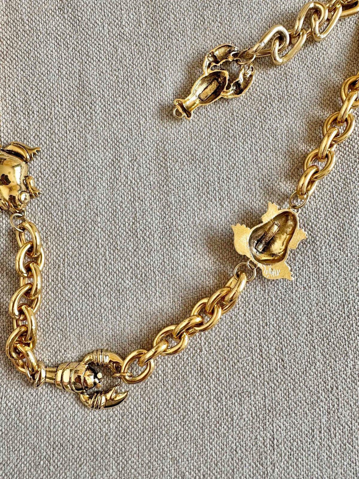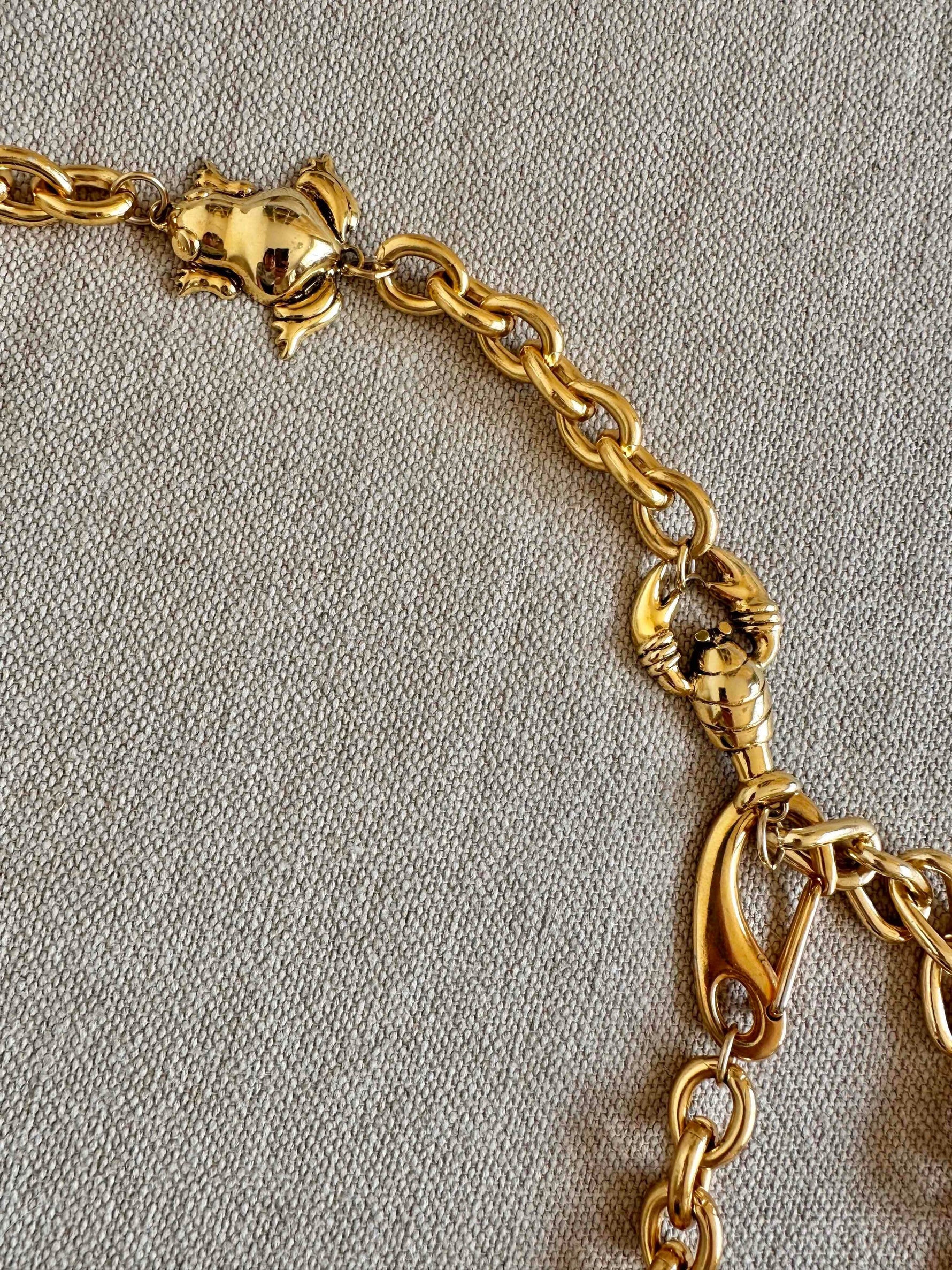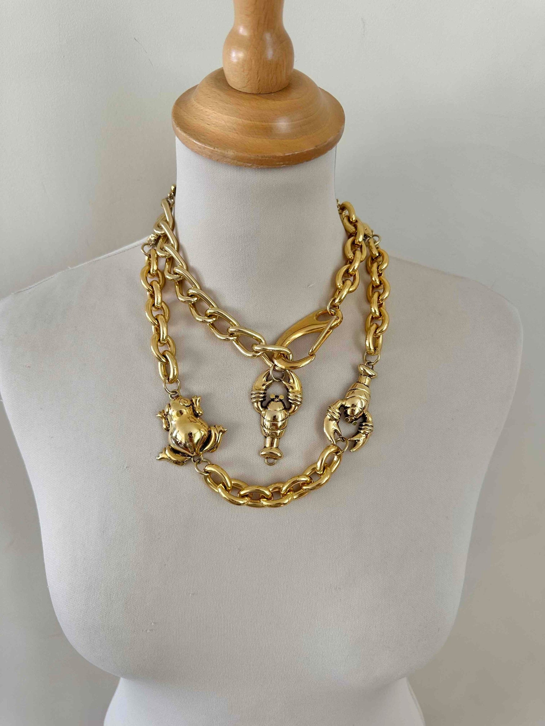 Ceinture chaîne homards, en laiton doré, avec pendentifs grenouilles et homards, fermoir par un grand mousqueton doré, se porte également en sautoir ou collier double rang, pièce des années 80s, longueur 98cm.