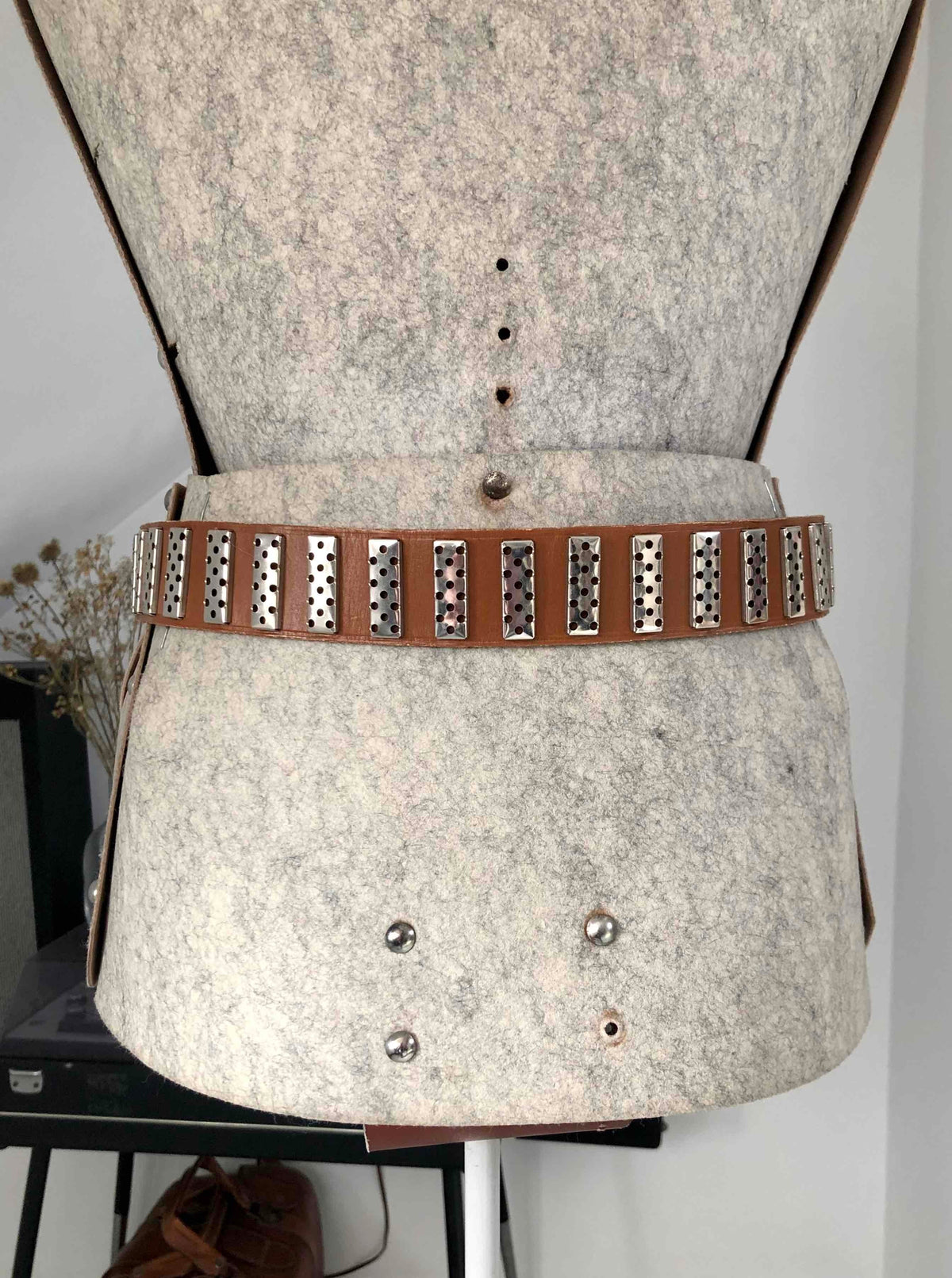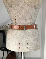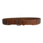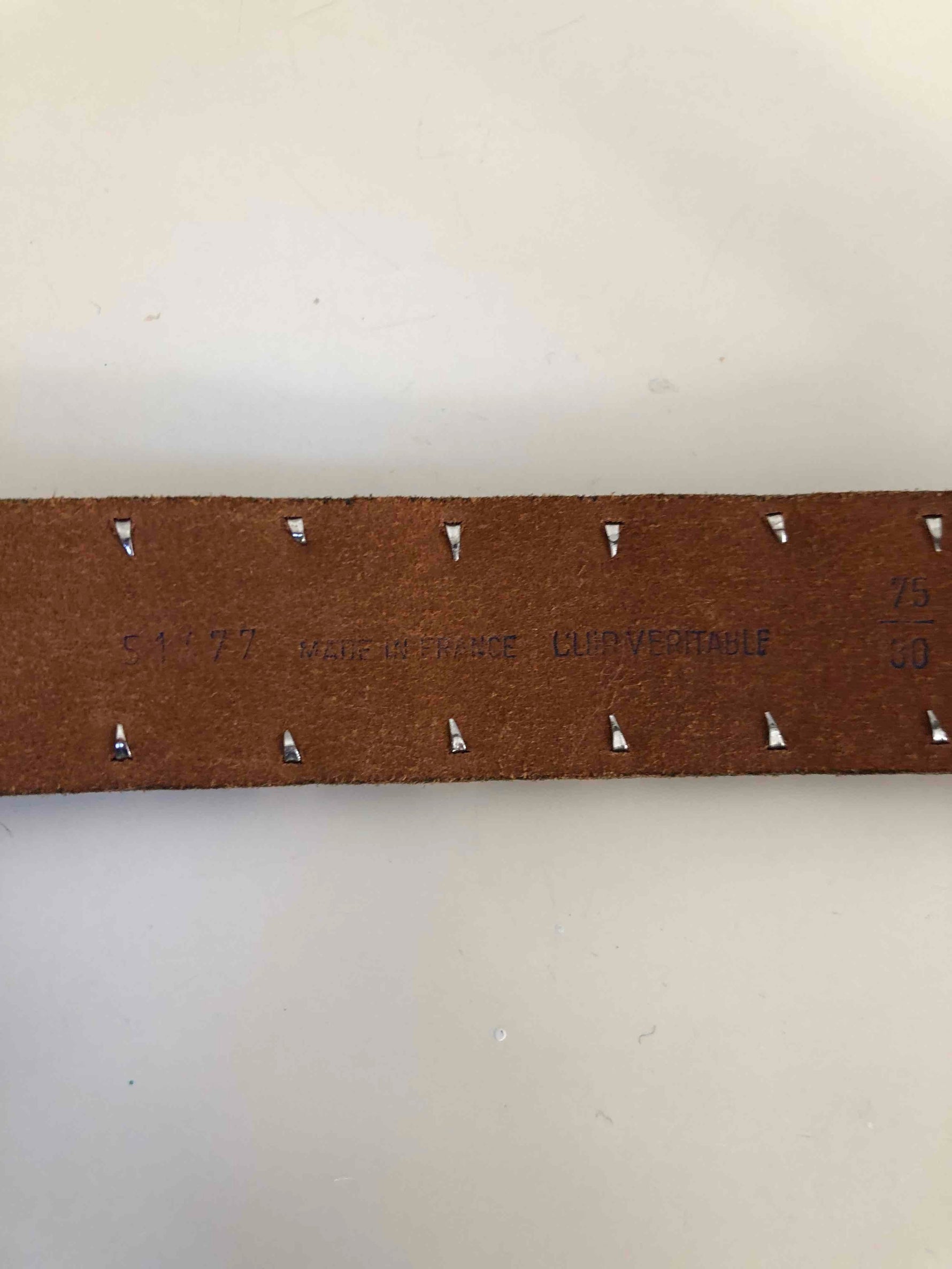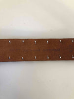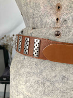 Prix unitaire parCeinture en cuir. Couleur camel, détails métalliques ajourés. Taille 75, fabriquée en France.