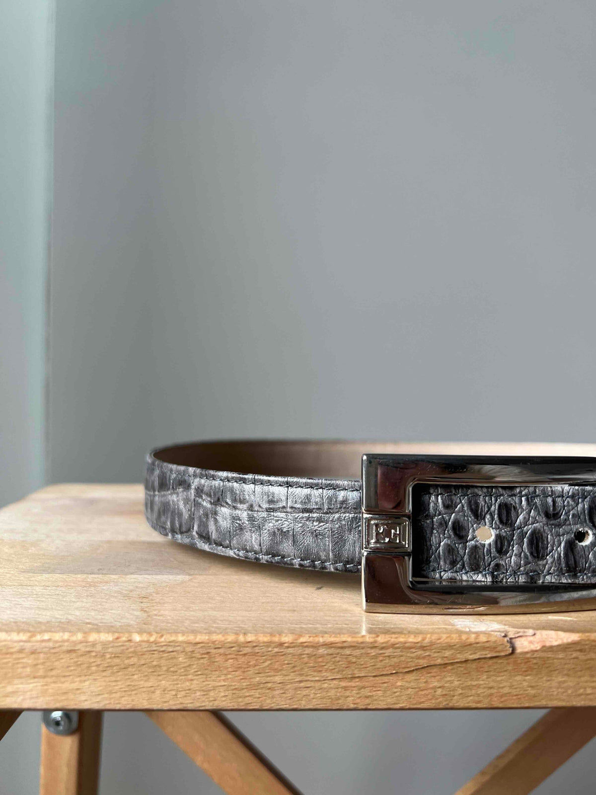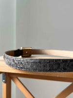 Prix unitaire parCeinture en cuir gris de la marque de luxe Escada. Ceinture effet croco gris avec une boucle signée de la marque. État neuf. Fabriquée en Italie.