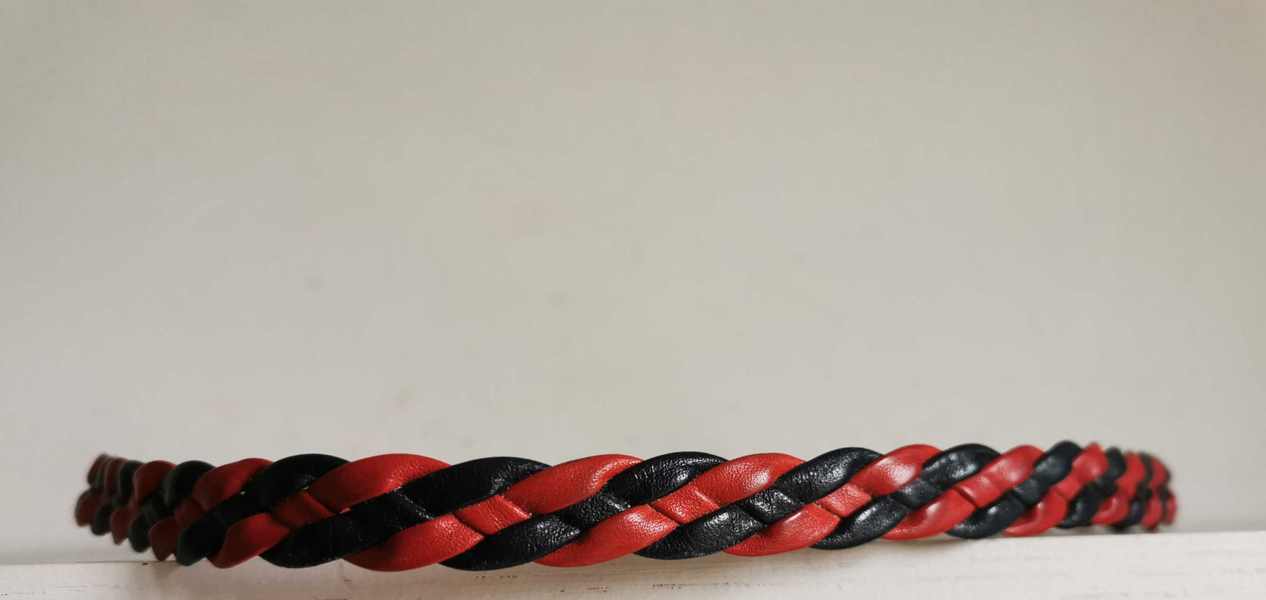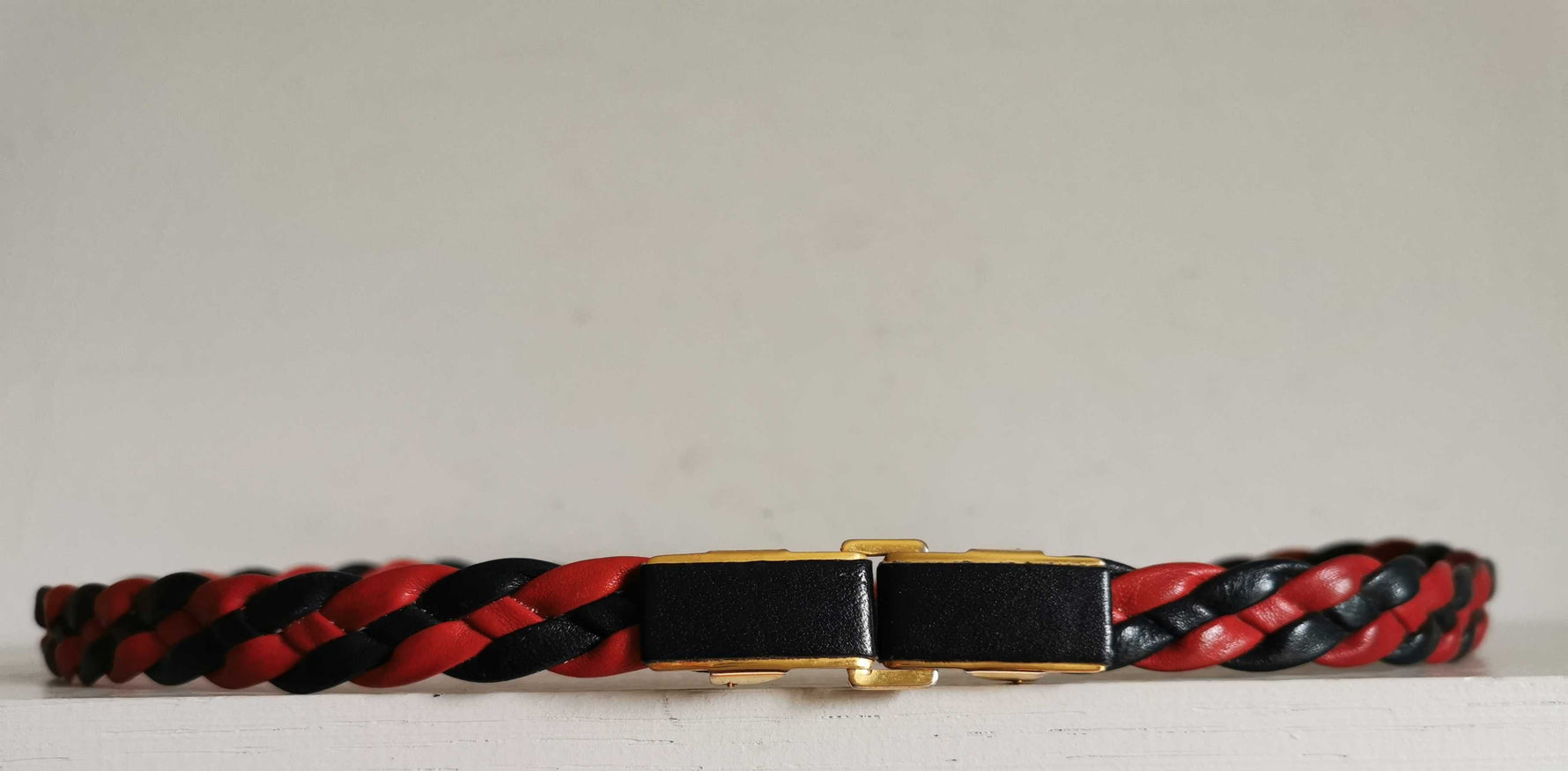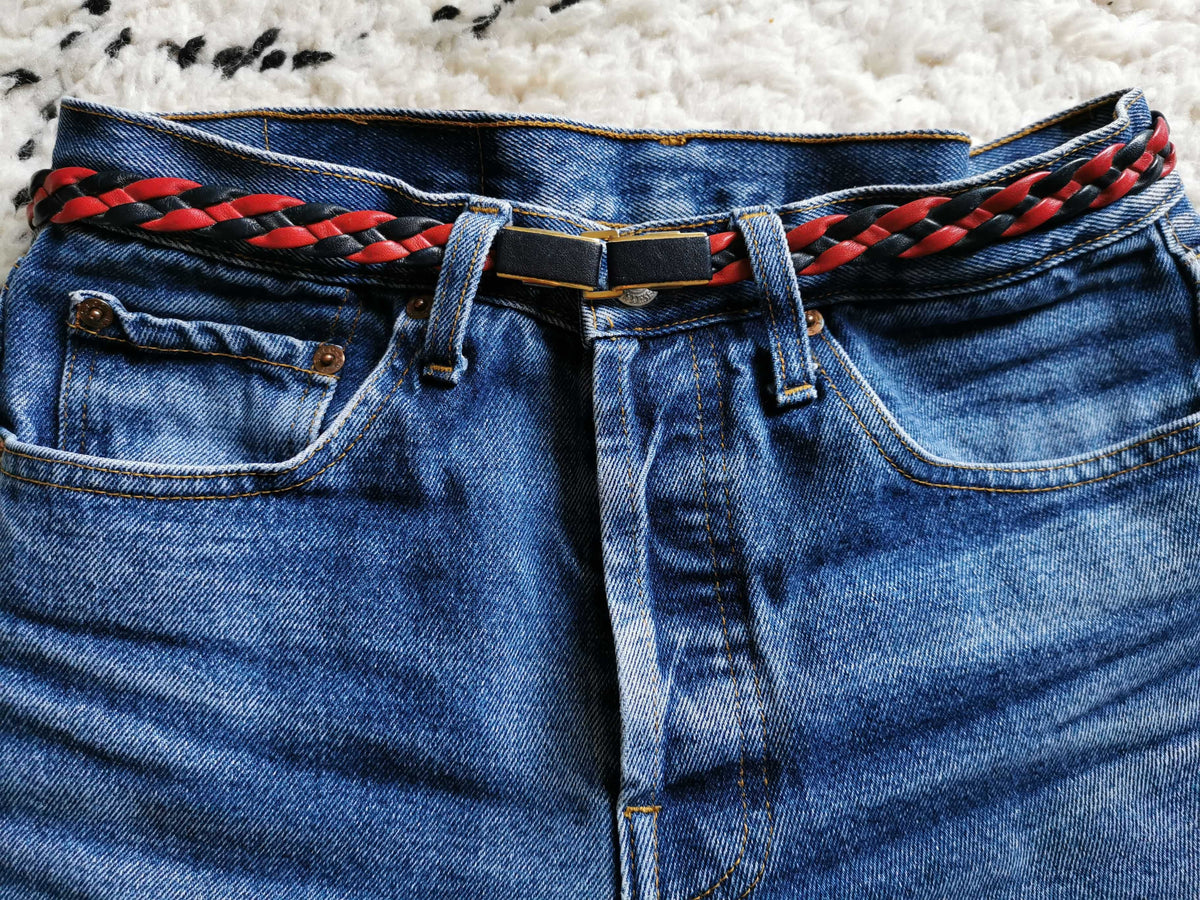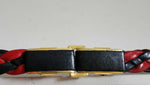Prix unitaire parCeinture en cuir tressé noir et rouge. Système doré pour la boucle sertie de cuir noir. Taille 36/38.