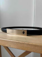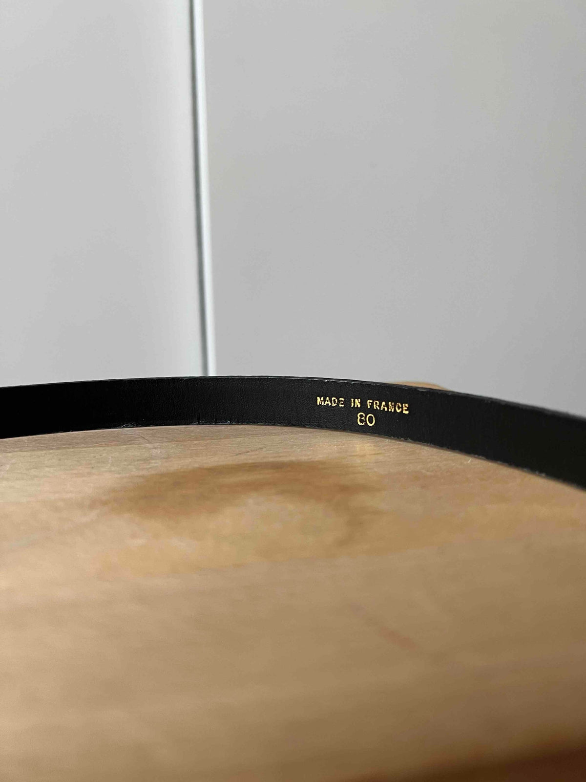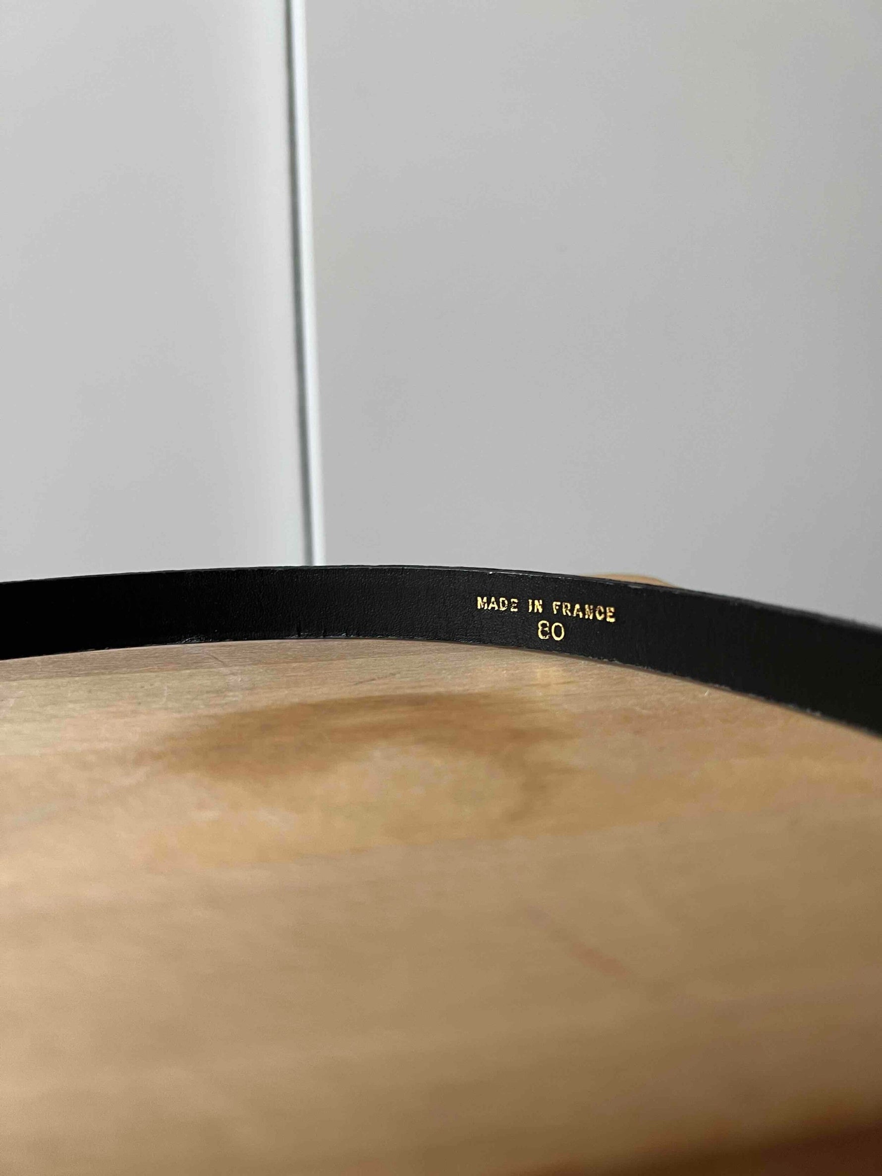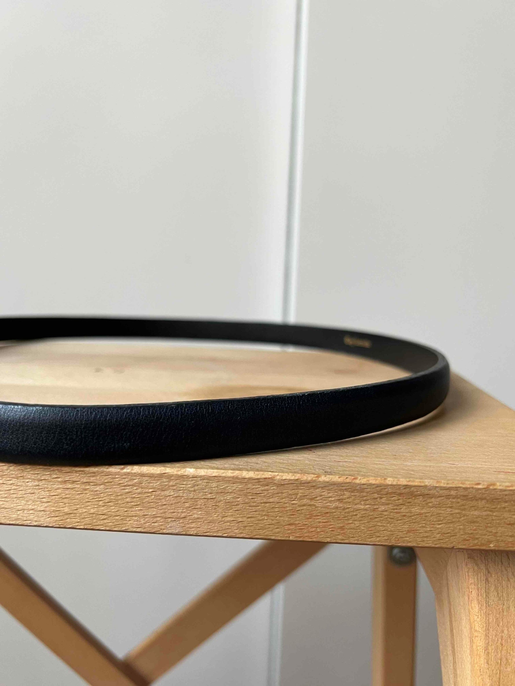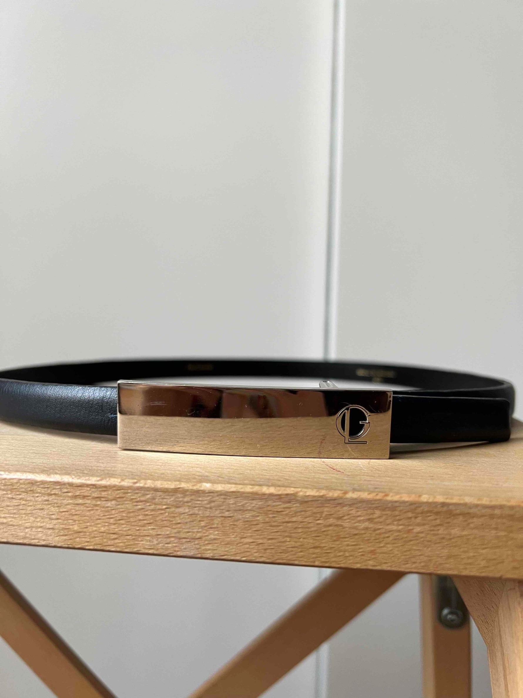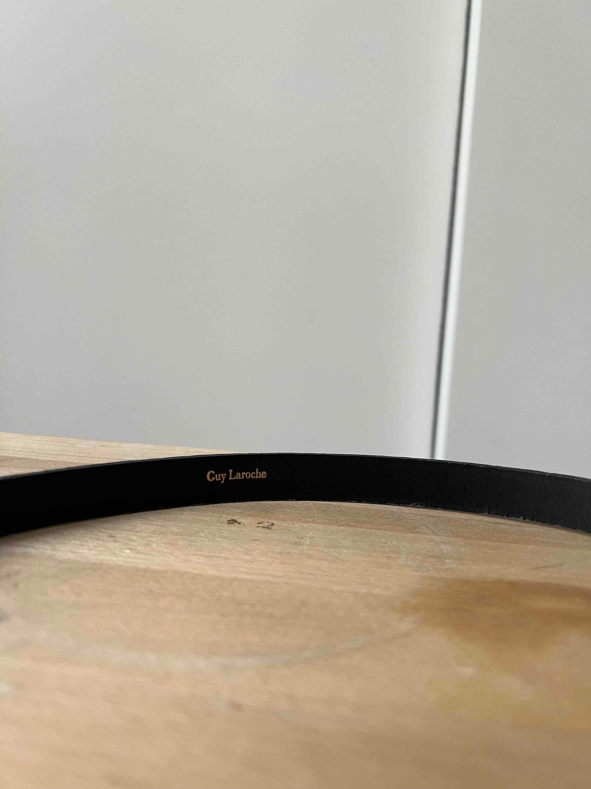 Prix unitaire parCeinture fine en cuir de la marque Guy Laroche. Cuir noir et boucle en métal argenté. Fabrication française. Excellent état, aucun défaut, idéale sur une robe ou un blazer.