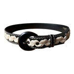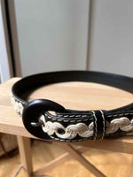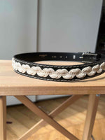 Prix unitaire parCeinture de la marque Yves Saint-Laurent, made in France en cuir noir avec des détails de macramé en coton beige tisser. Excellent état aucun défaut. Pièce des années 70.