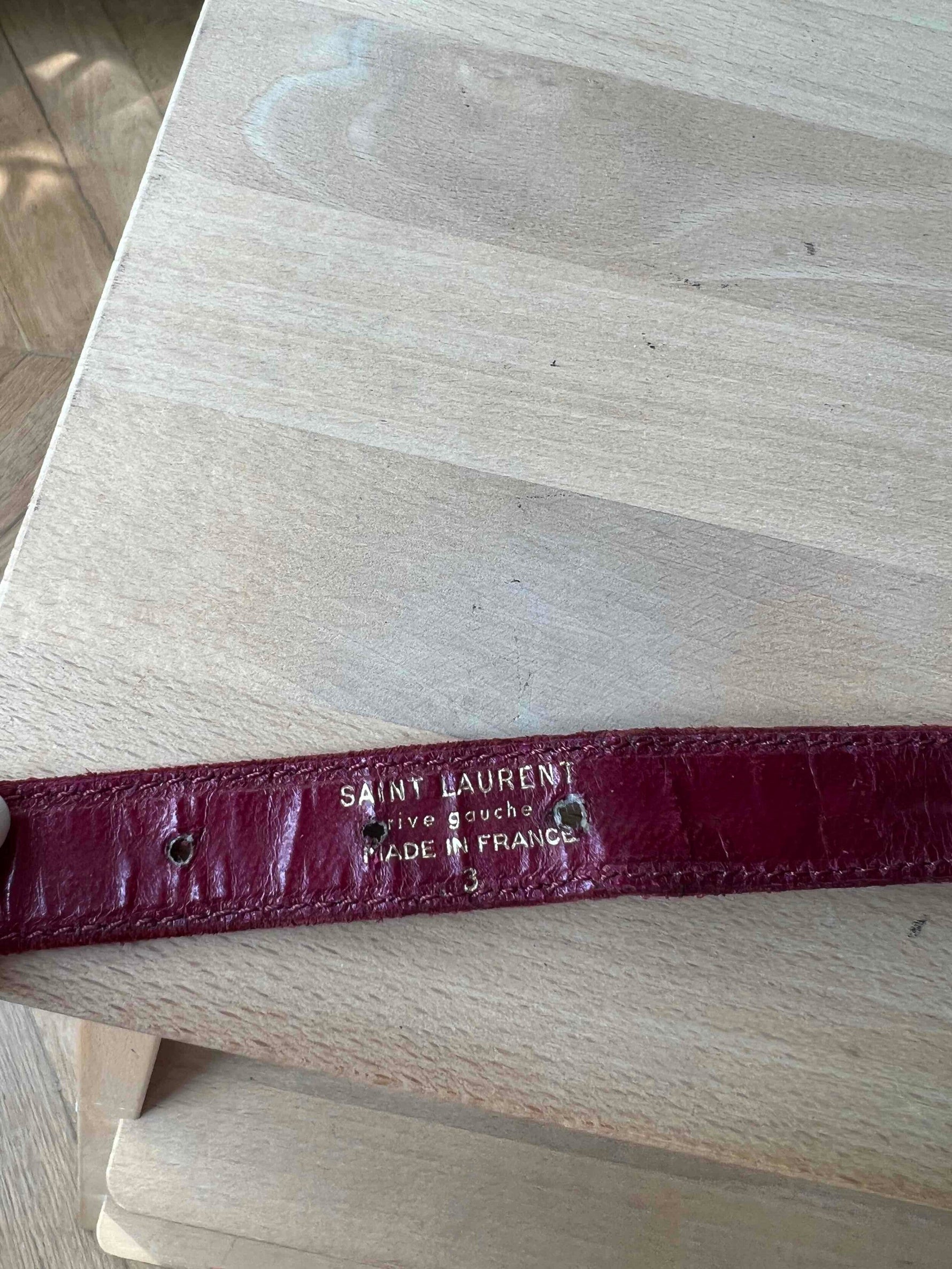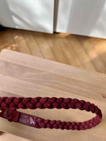 Ceinture fine en cuir tressé, rouge foncée/bordeaux. Petit boucle dorées. Signé Saint-Laurent Rive Gauche. Made in France taille 34 à 38. Excellent état, aucun défaut. Daim / cuir velours.
