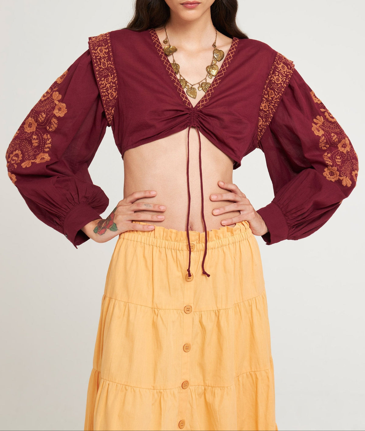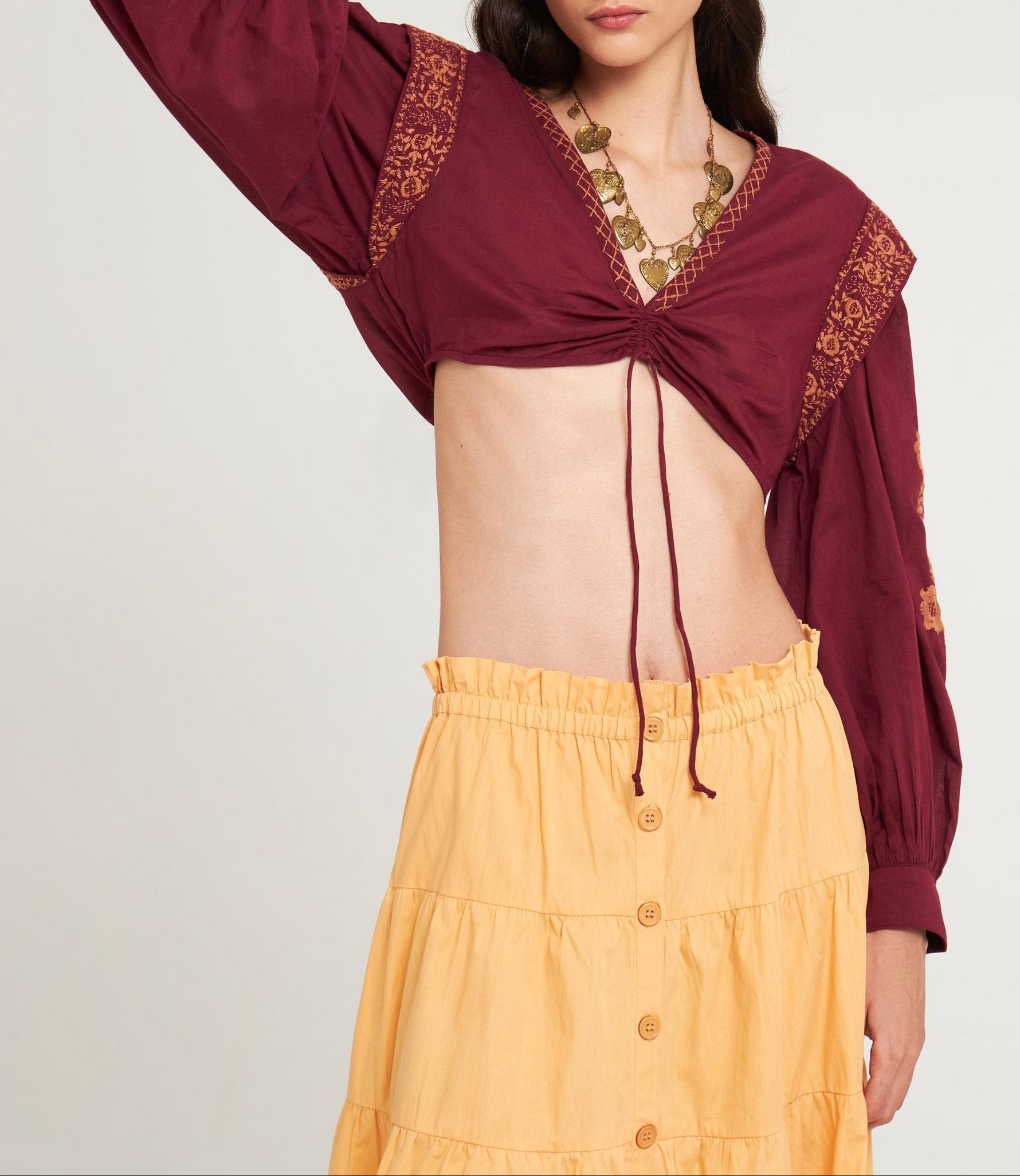 Crop top ample en voile de coton brodé. Détails floraux brodés à la main. Col en V. Lien coulissant sur le devant. Manches bouffantes boutonnées aux poignets. Fronces à l'encolure, aux épaules et aux poignets. Boutons en nacre naturelle.