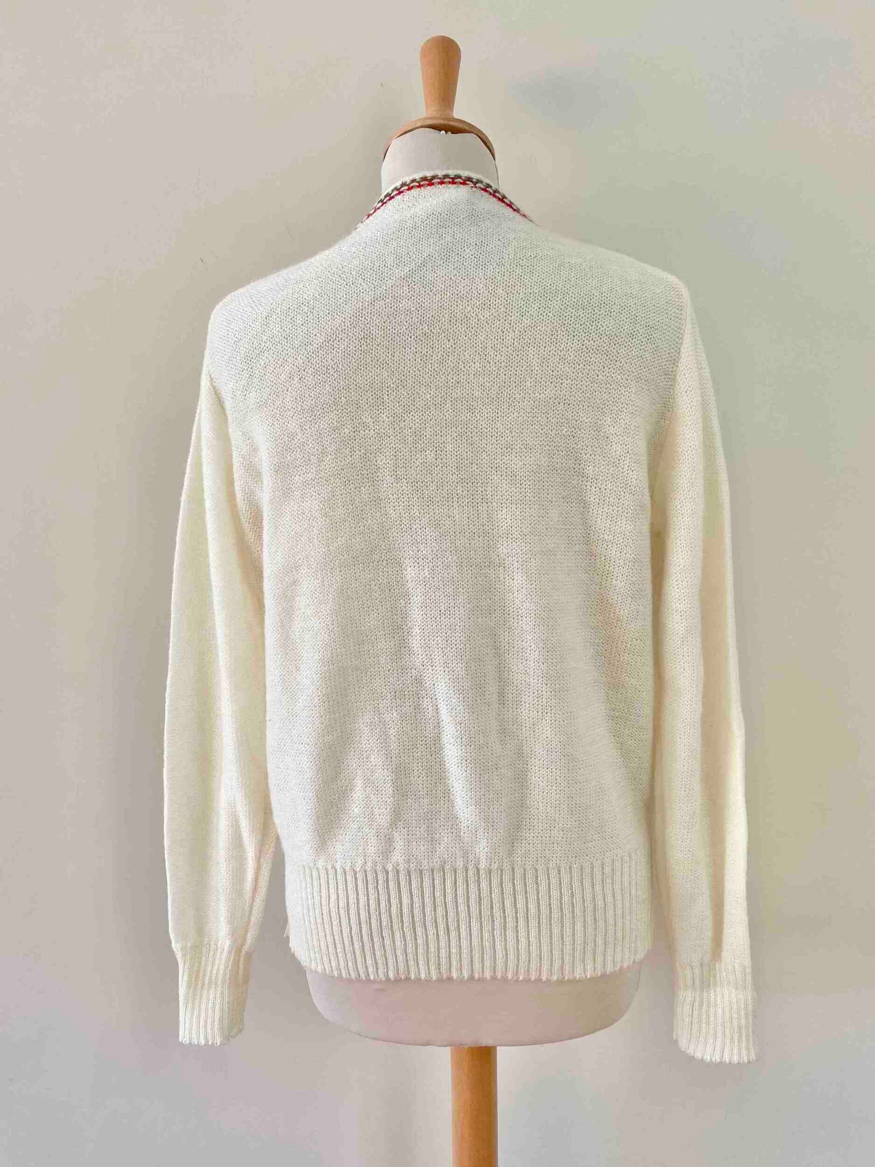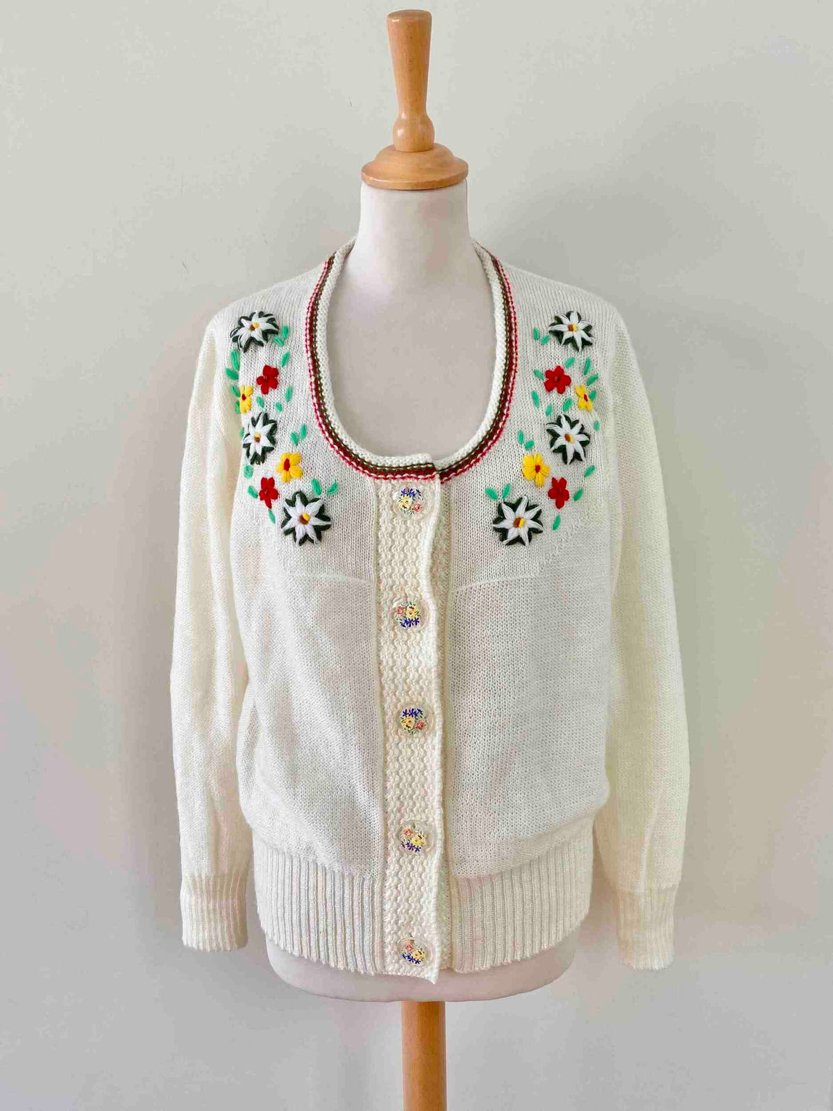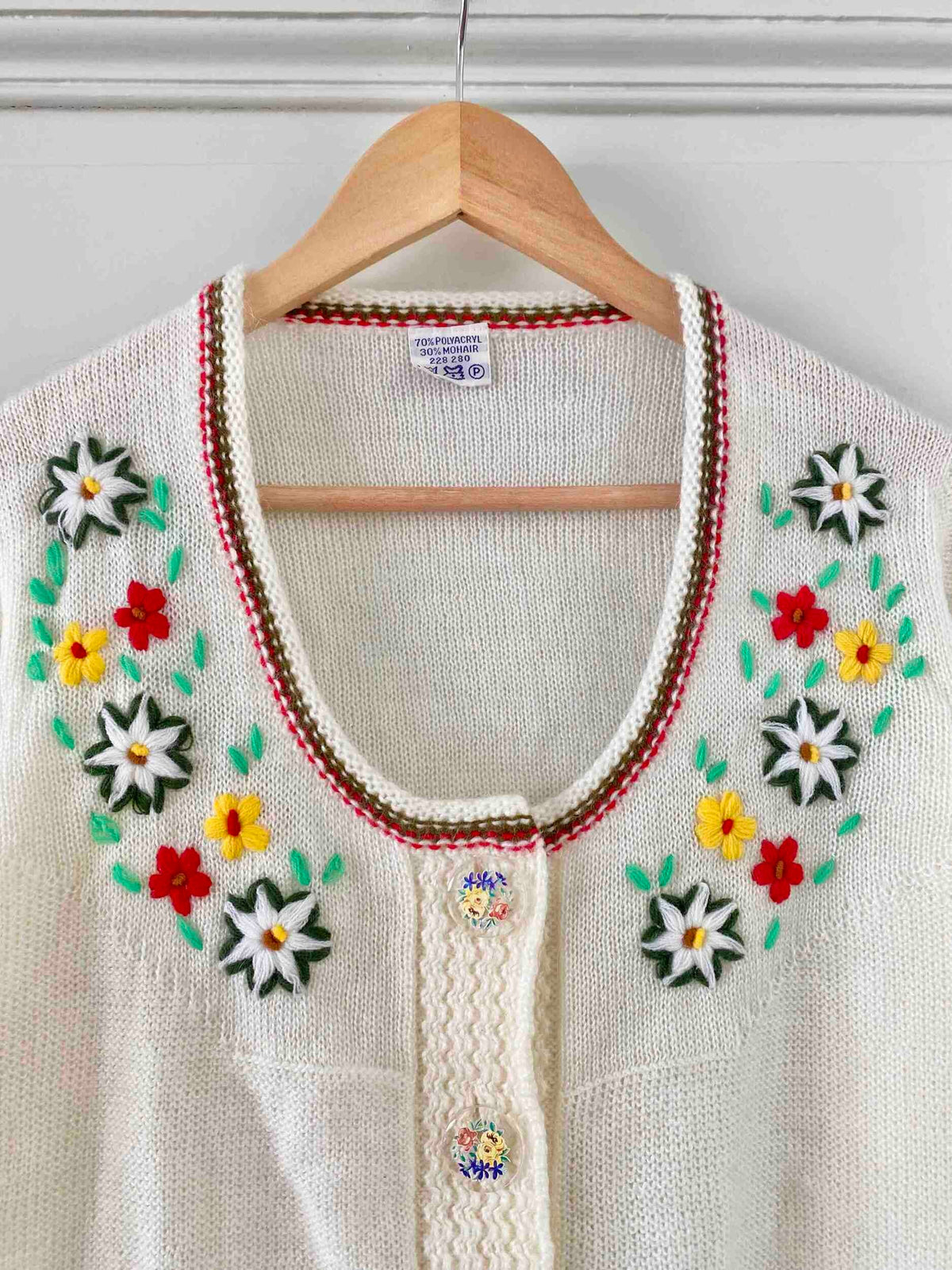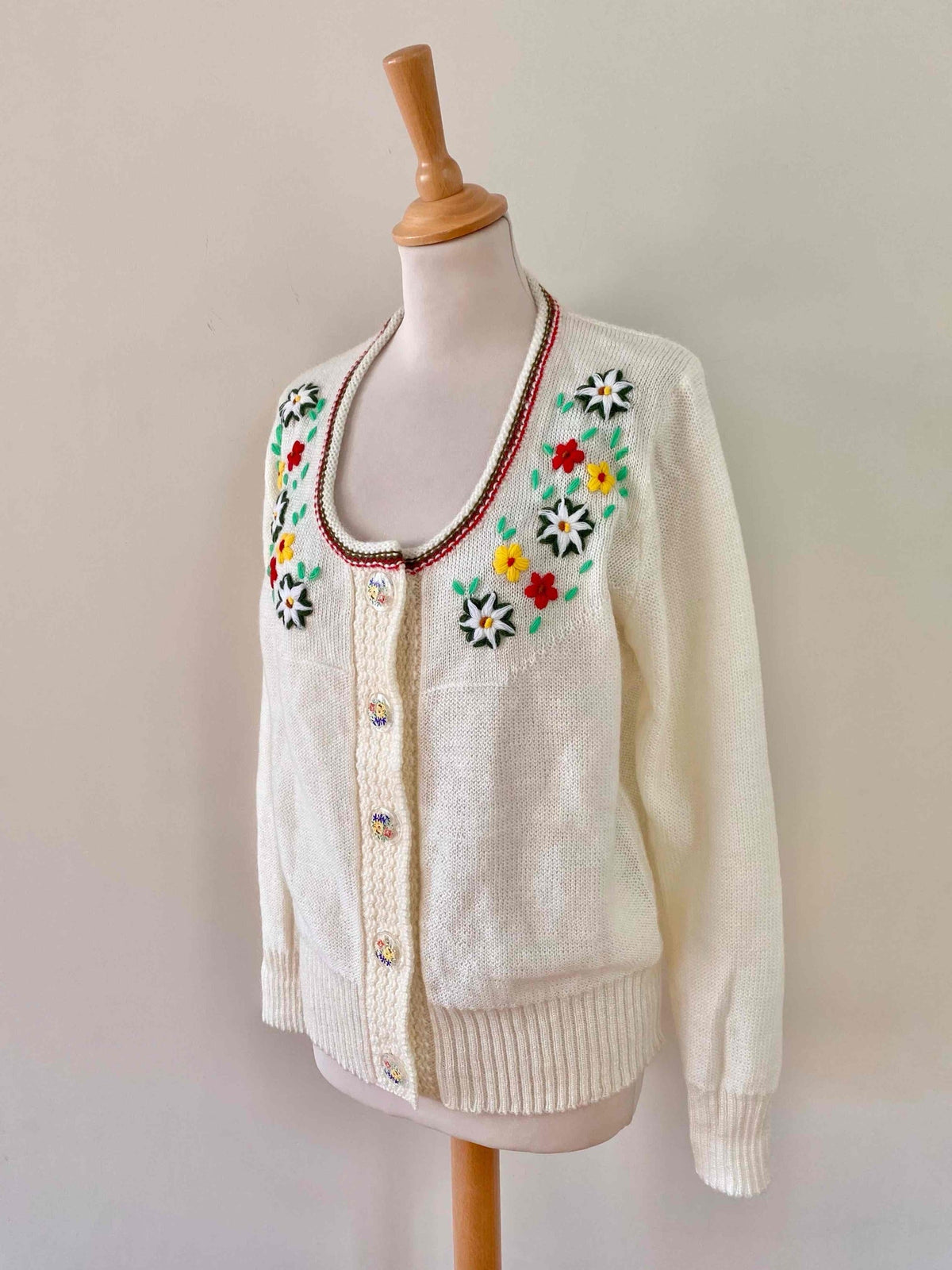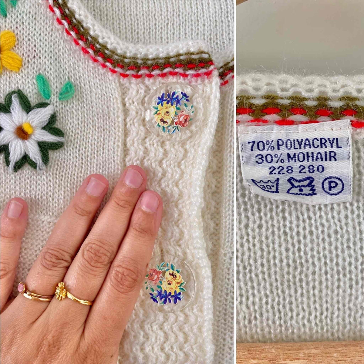 Prix unitaire parCardigan Autrichien en Mohair et Polyacrylique écru, brodé de fleurs multicolores, gros boutons transparents à motifs bouquets de fleurs, fabriqué en Autriche.