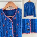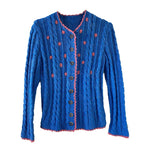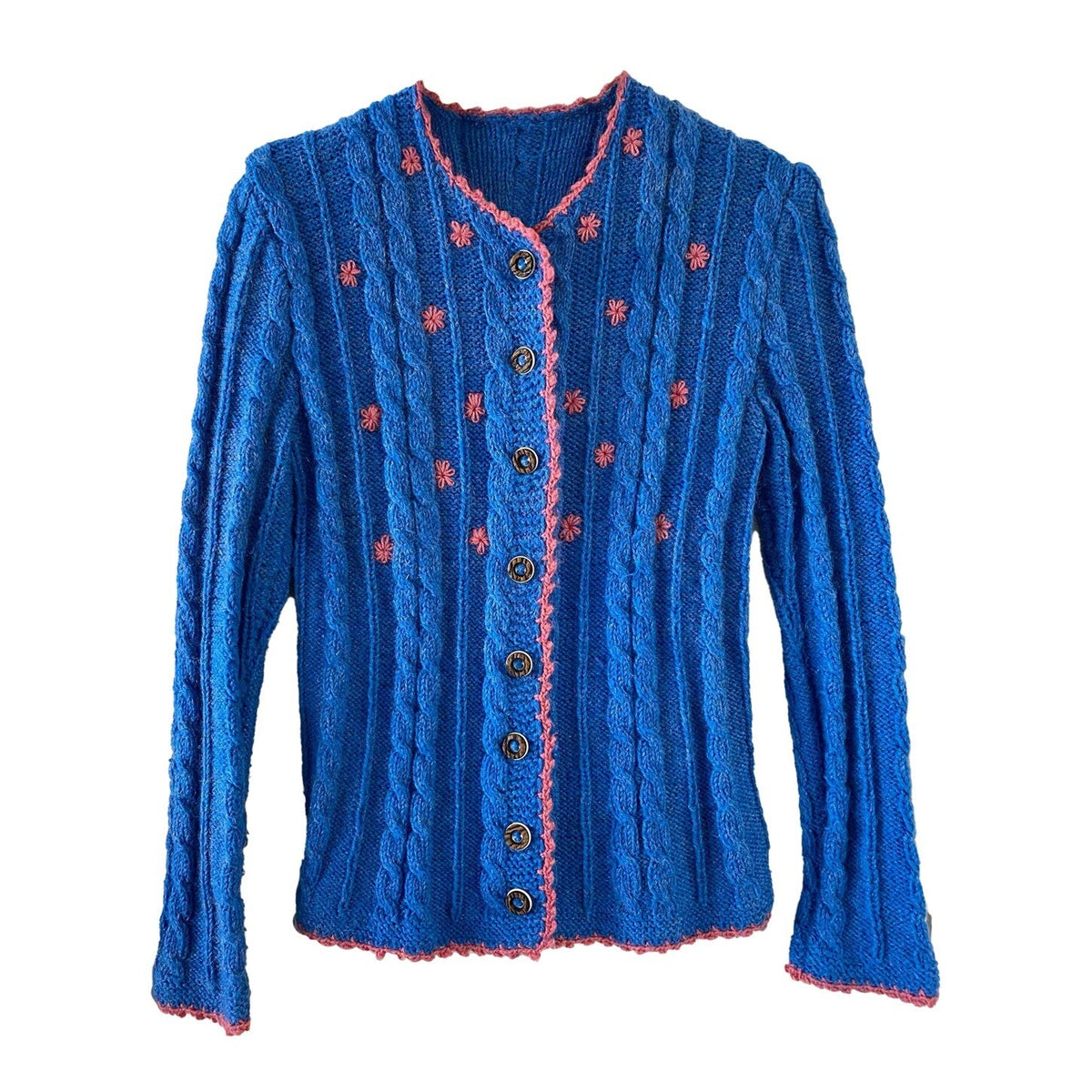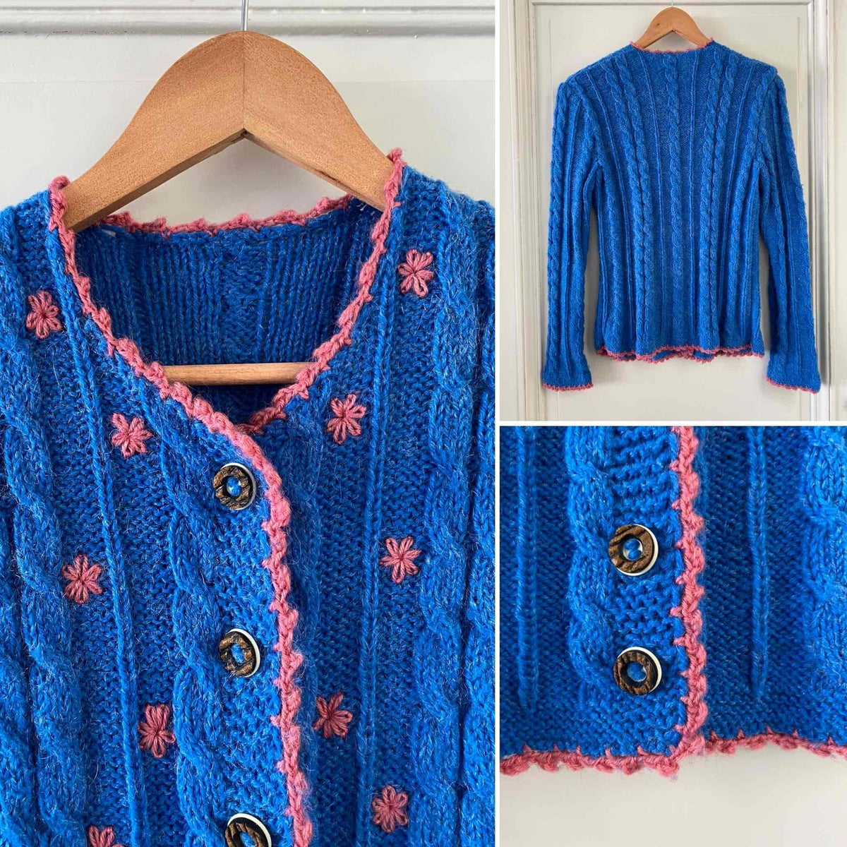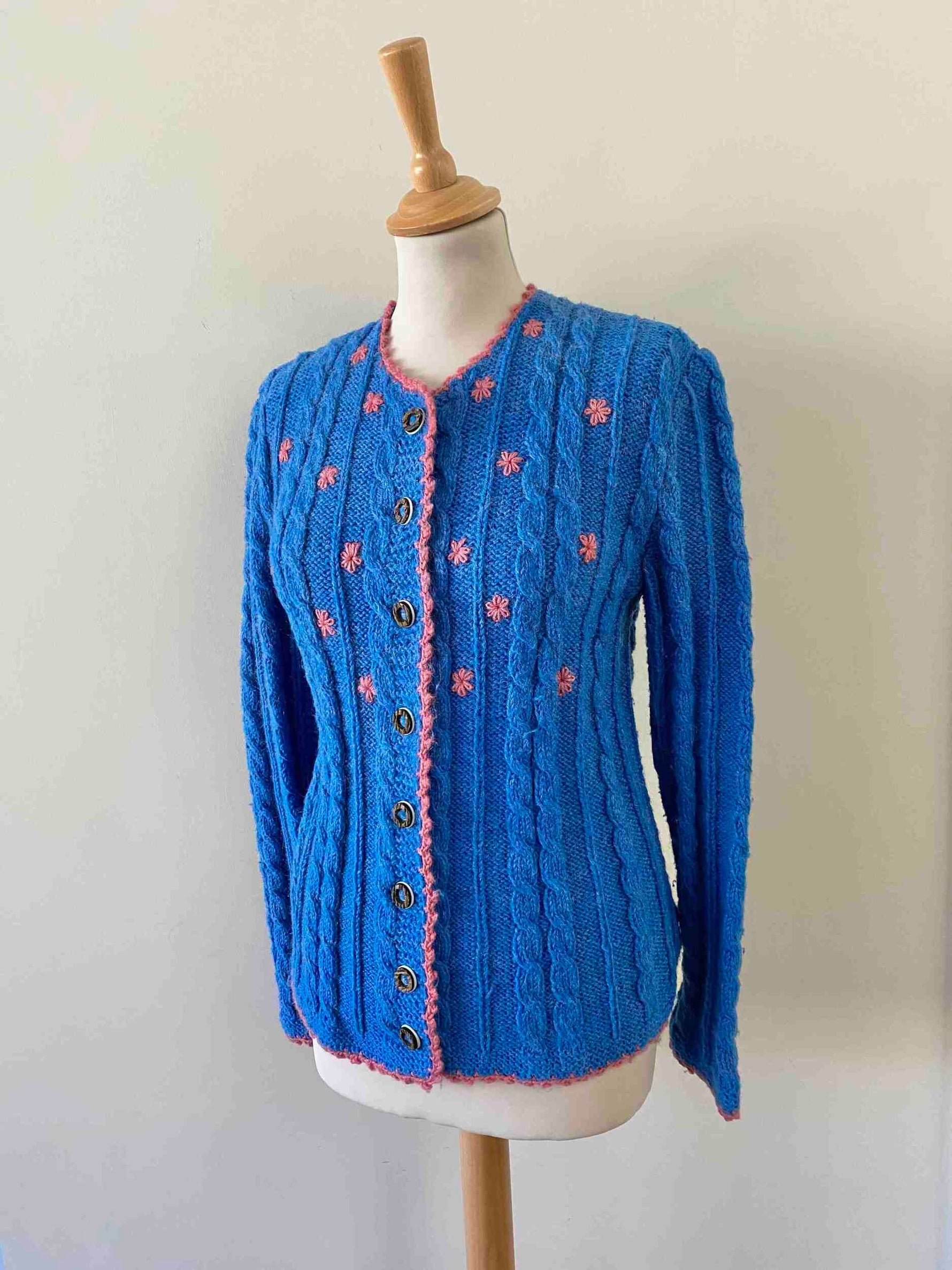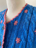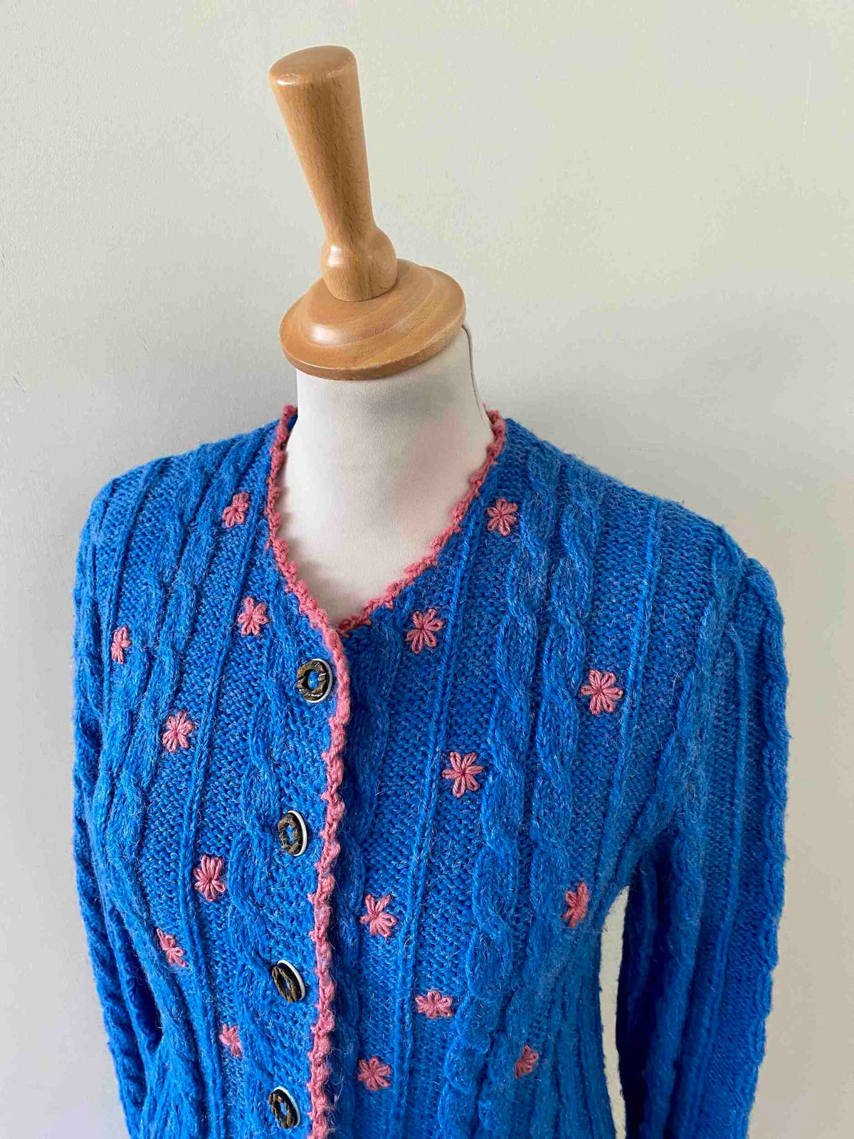 Prix unitaire parCardigan Autrichien en laine et mohair bleu roi, brodé de fleurs roses pastels, boutons bois, maille torsadée, tricoté mains, années 70’s.