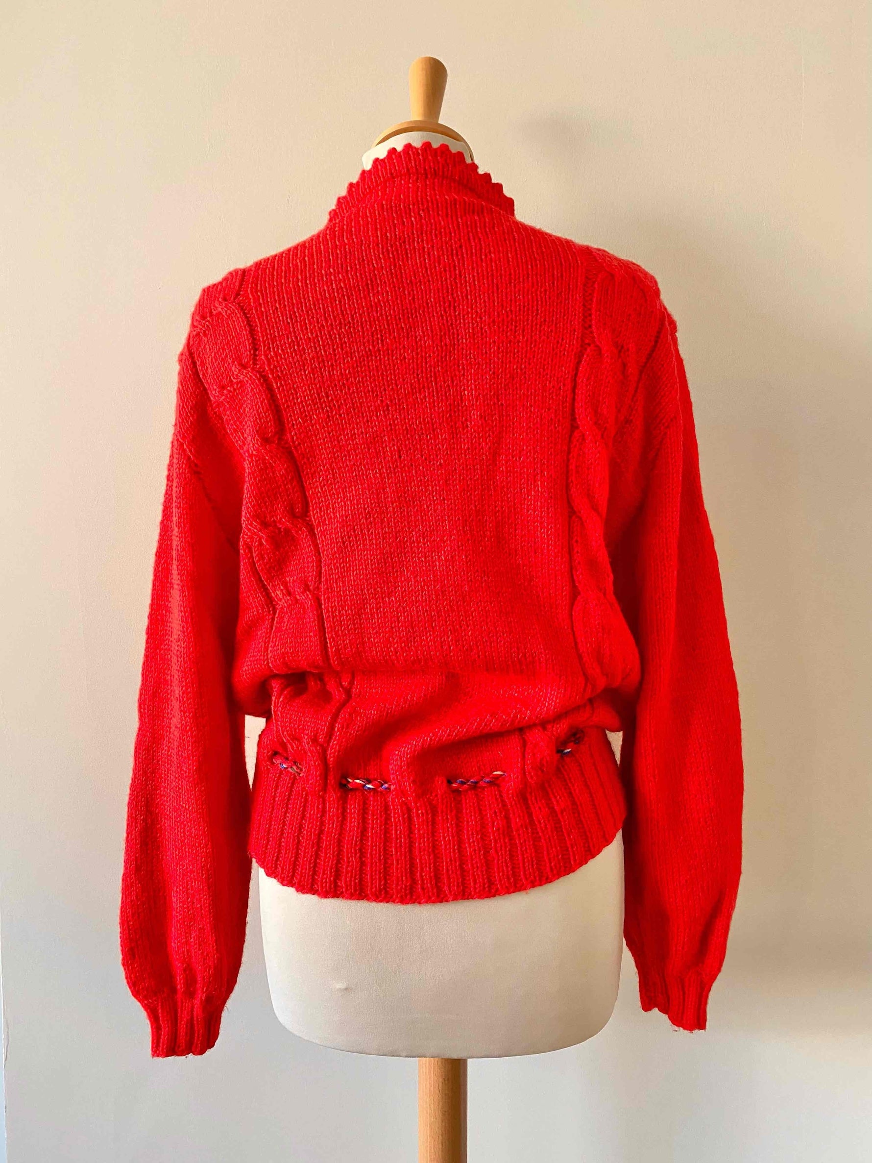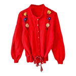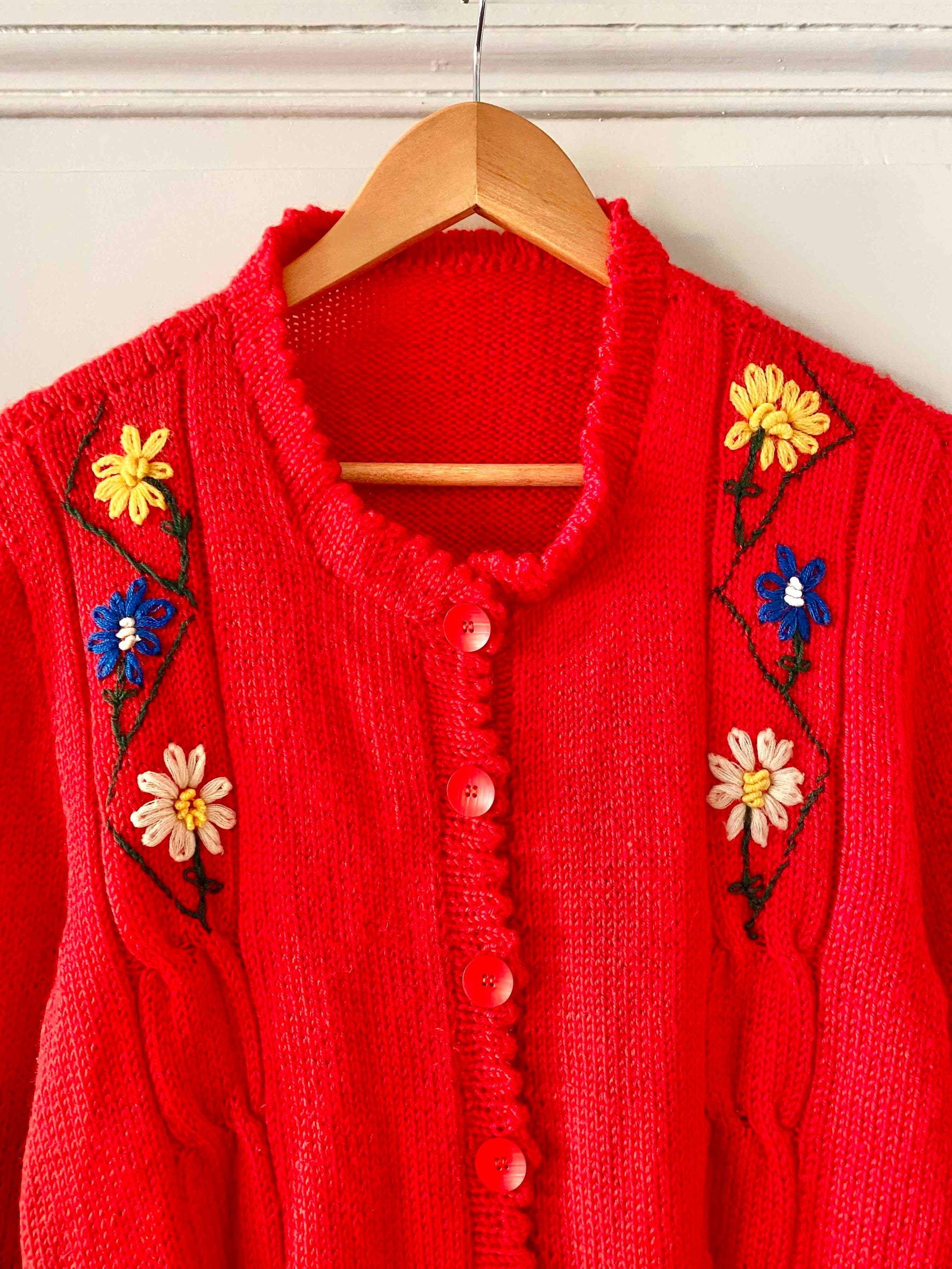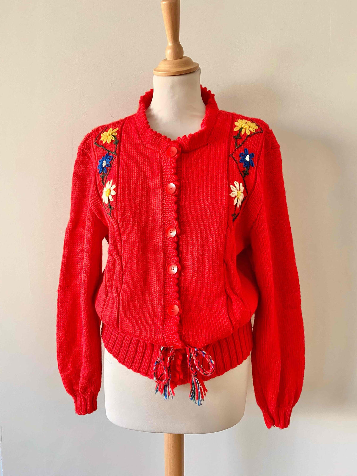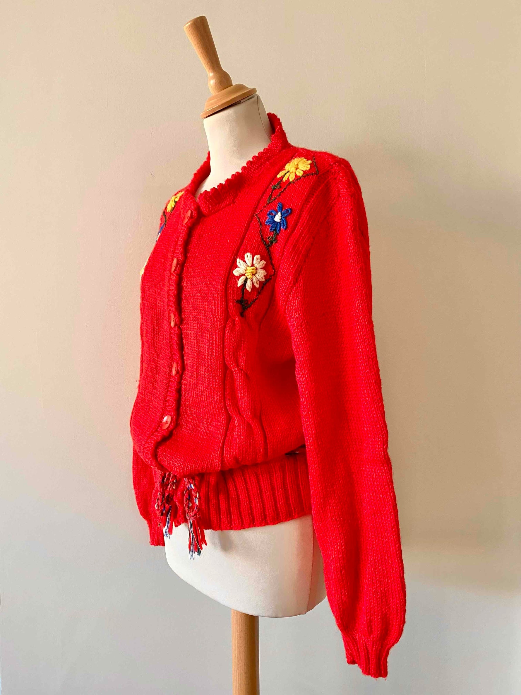 Prix unitaire parCardigan autrichien en laine mélangée rouge vermillon, brodé de fleurs marguerites blanches, bleues et jaunes, maille torsadée, manches ballon, cordons de serrage taille torsadé multicolore. Tricoté main en Autriche.