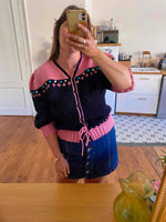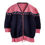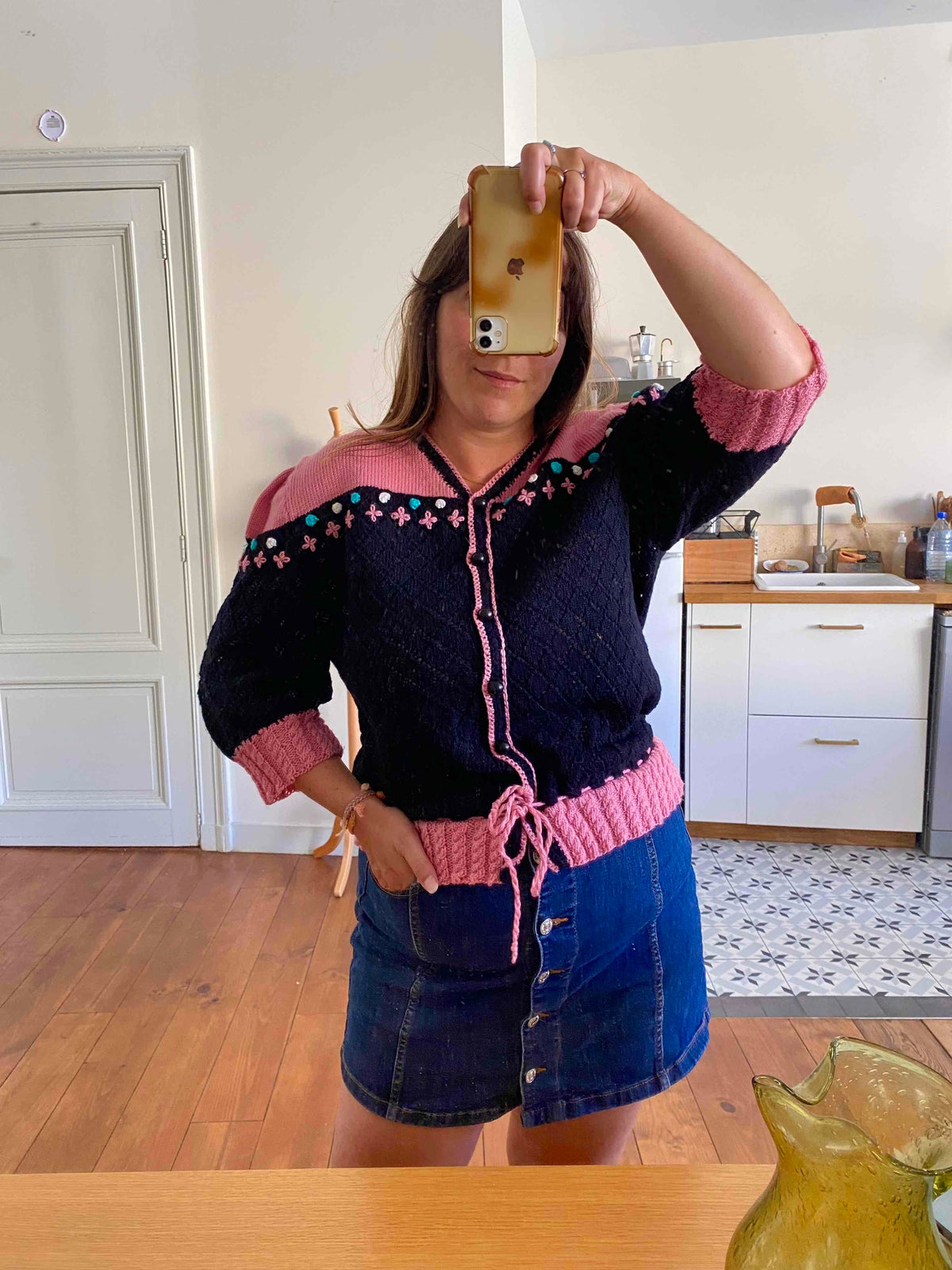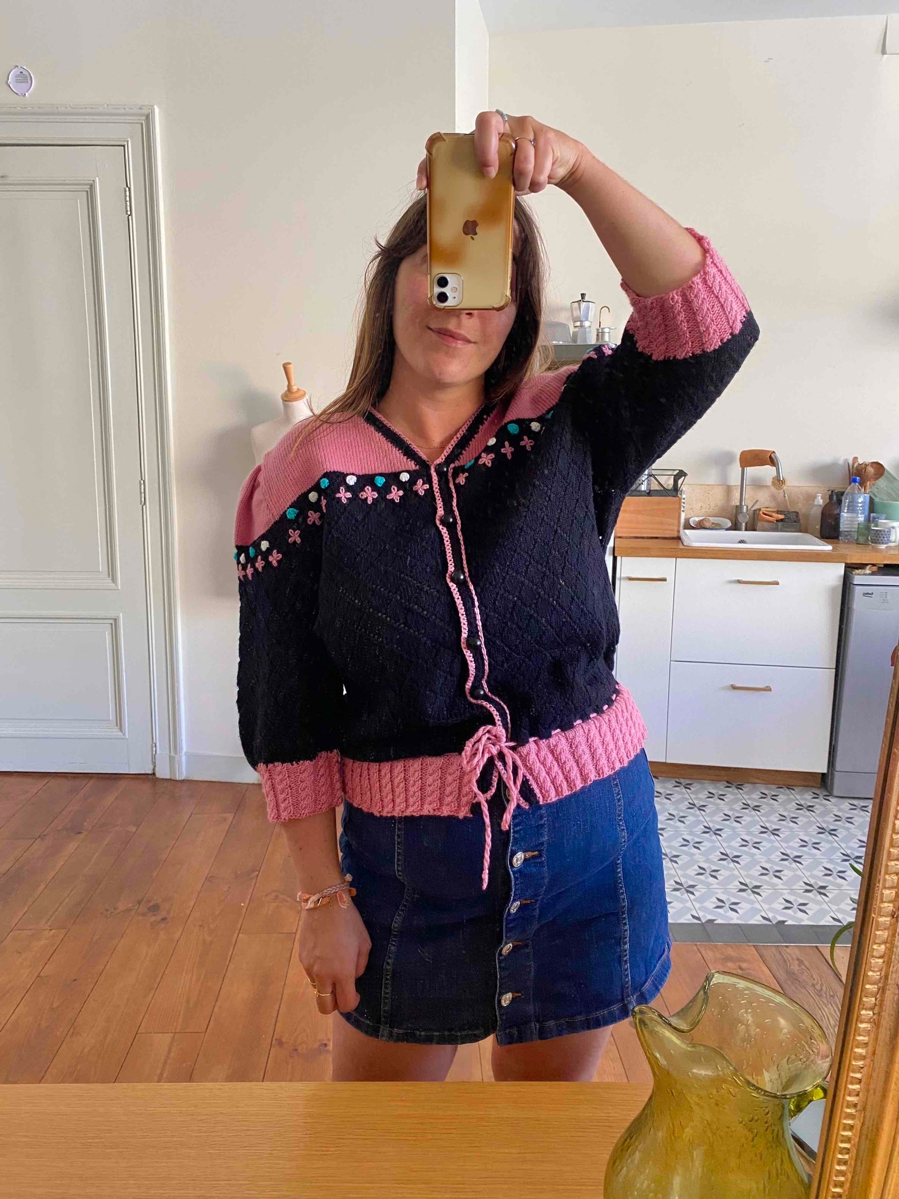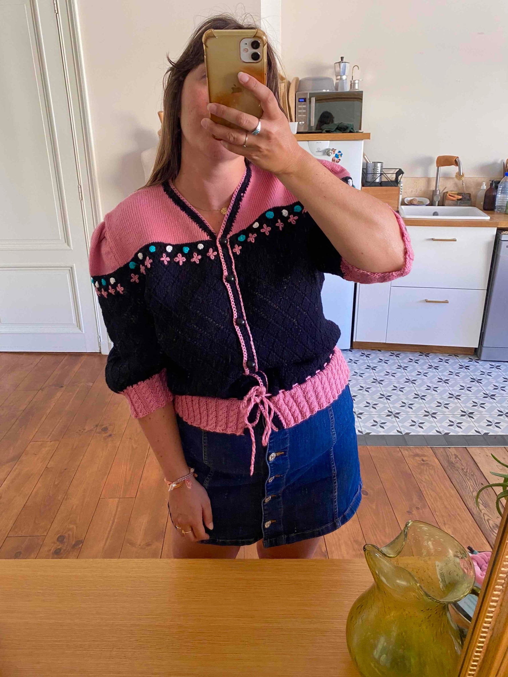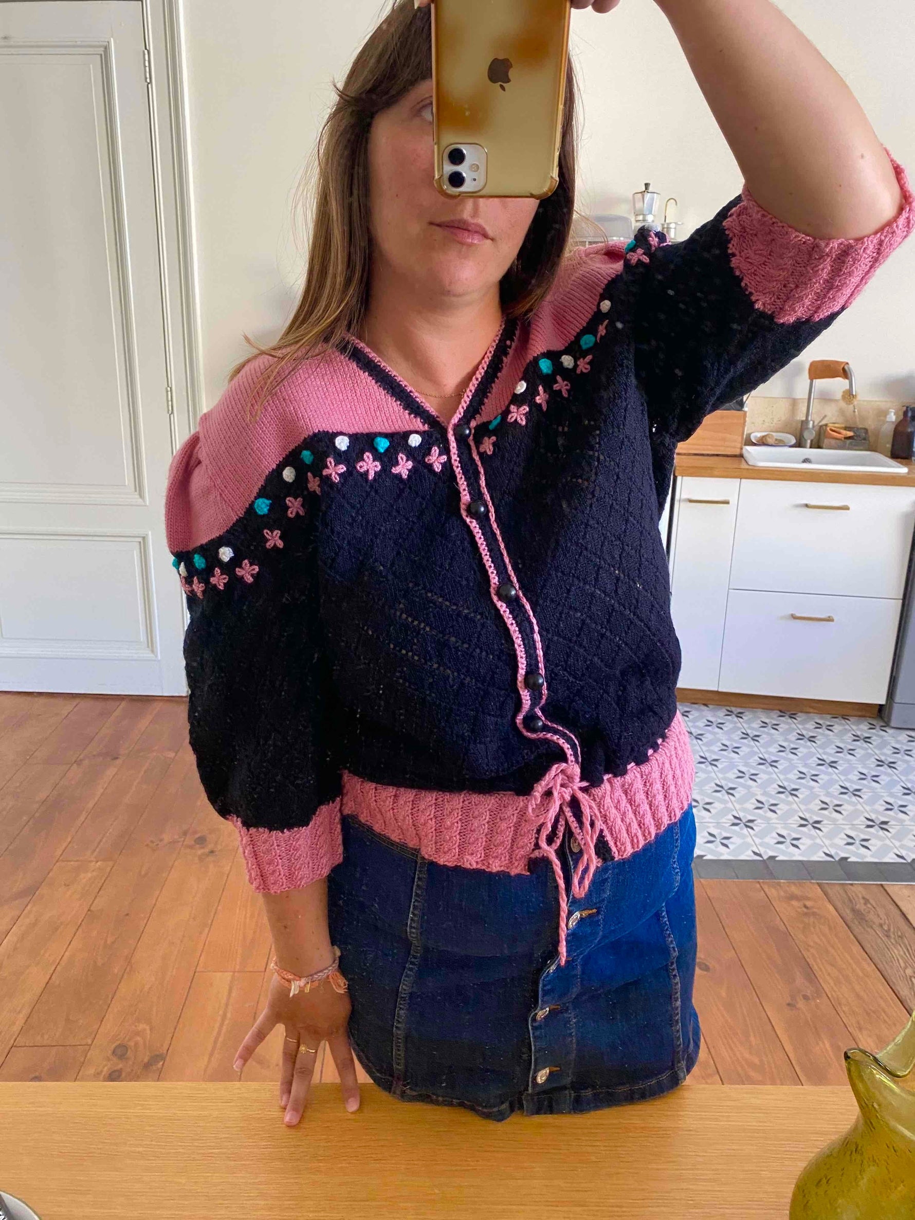 Prix unitaire parCardigan autrichien manches ballons 3/4 en laine, maille noire ajourée losanges, et rose poudré, brodé de fleurs roses, blanches et menthe, cordon à nouer taille, tricoté et brodé mains en Autriche, taille 40 porté ici sur une personne T40.