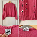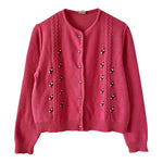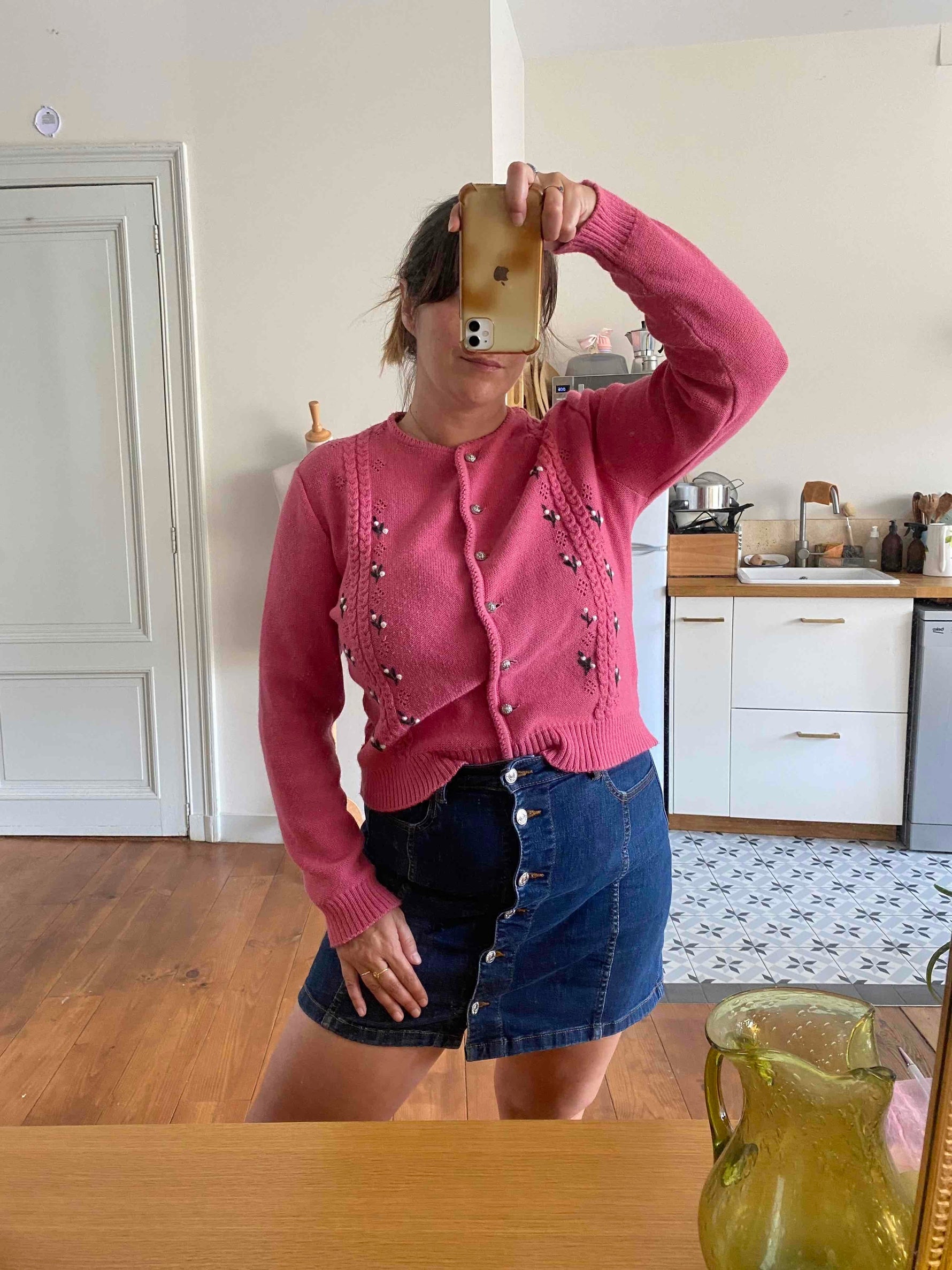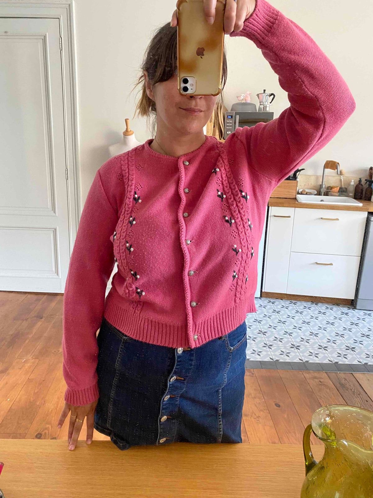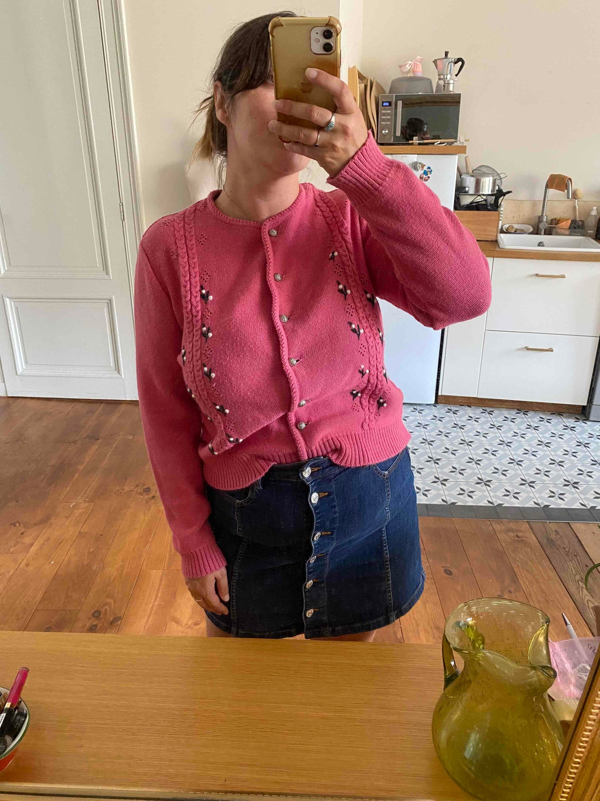 Cardigan autrichien en laine mélangée bois de rose brodé de petites fleurs blanches et vertes, maille ajourée pointelle, boutons bijoux argentés fleuris, taille 38 et 40 porté ici sur une personne T40.