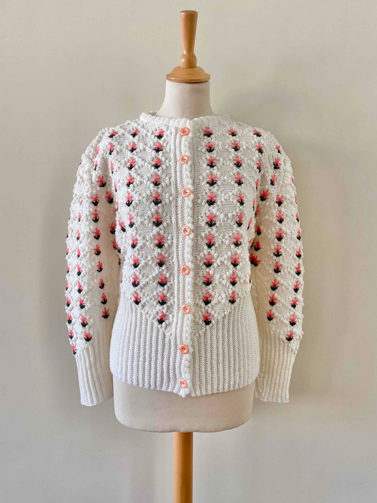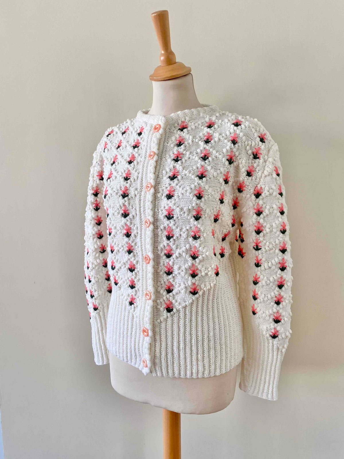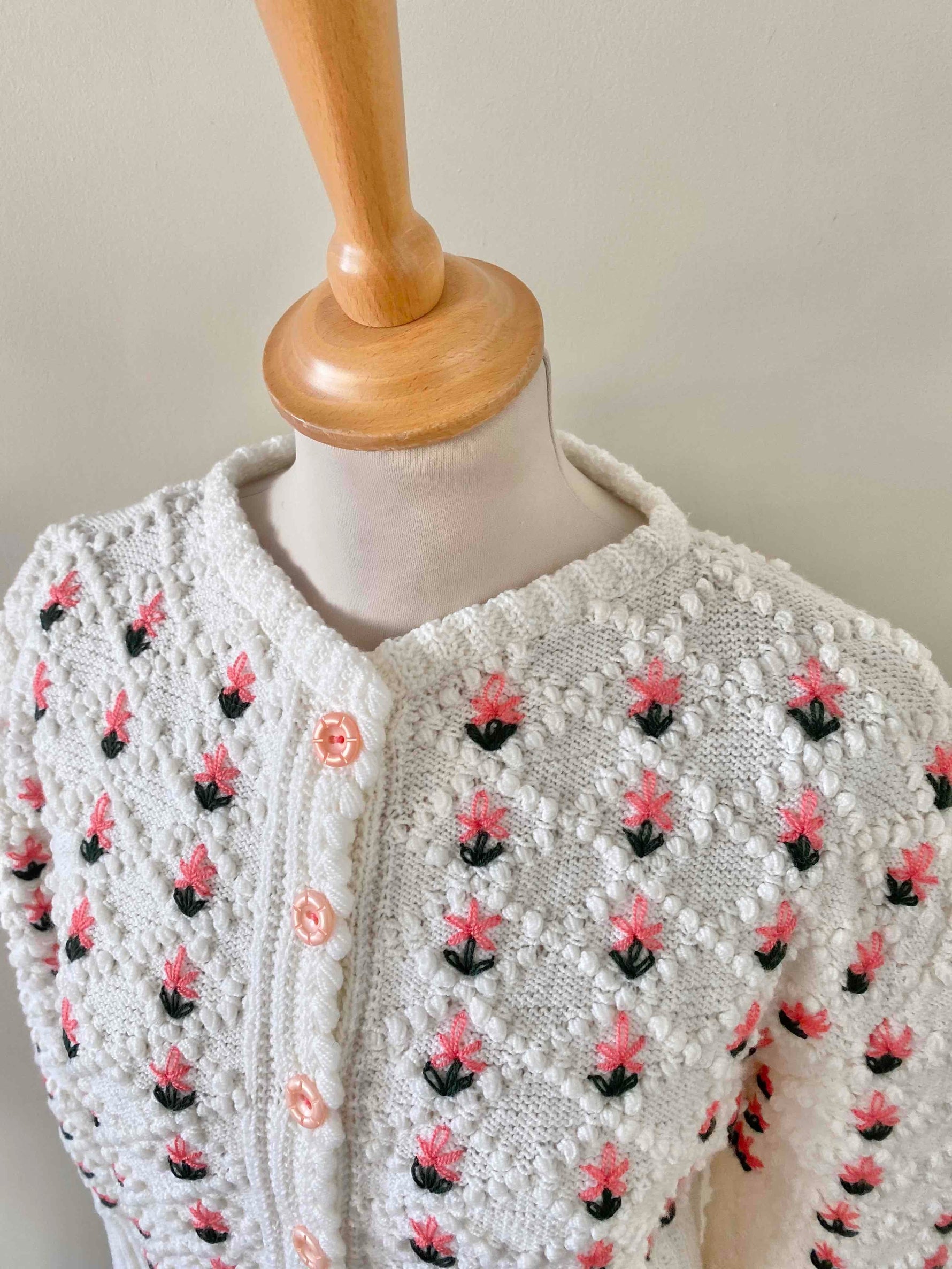 Prix unitaire parCardigan Autrichien en laine mélangée blanche, entièrement brodé de fleurs roses et vertes, maille fine pompons brodés, boutons roses, taille 36 porté ici sur un mannequin T36, tricotté et brodé mains en Autriche.