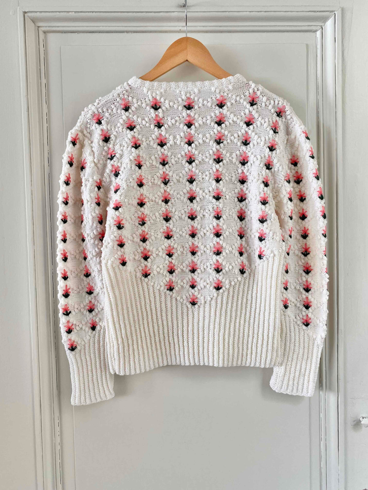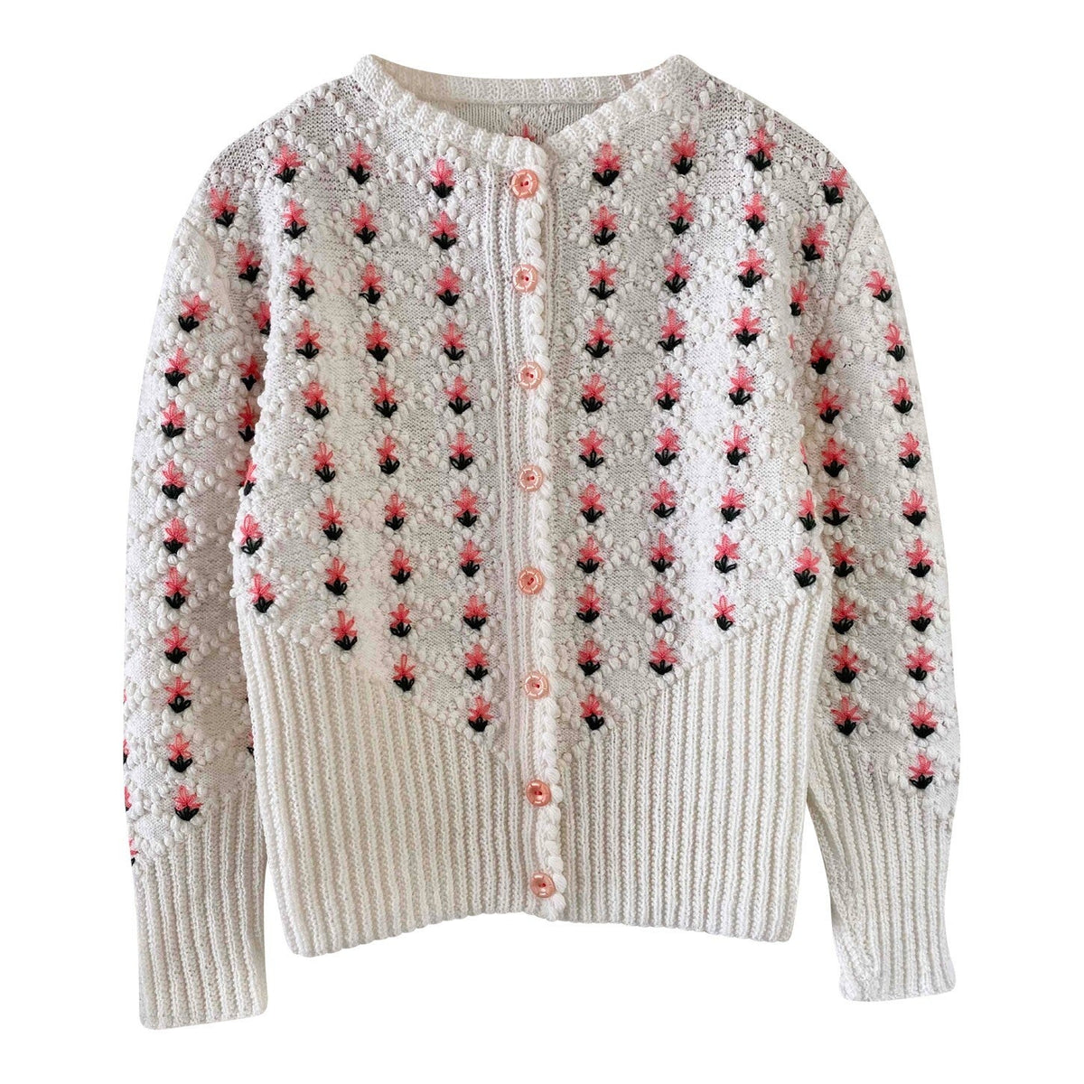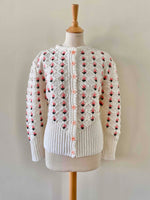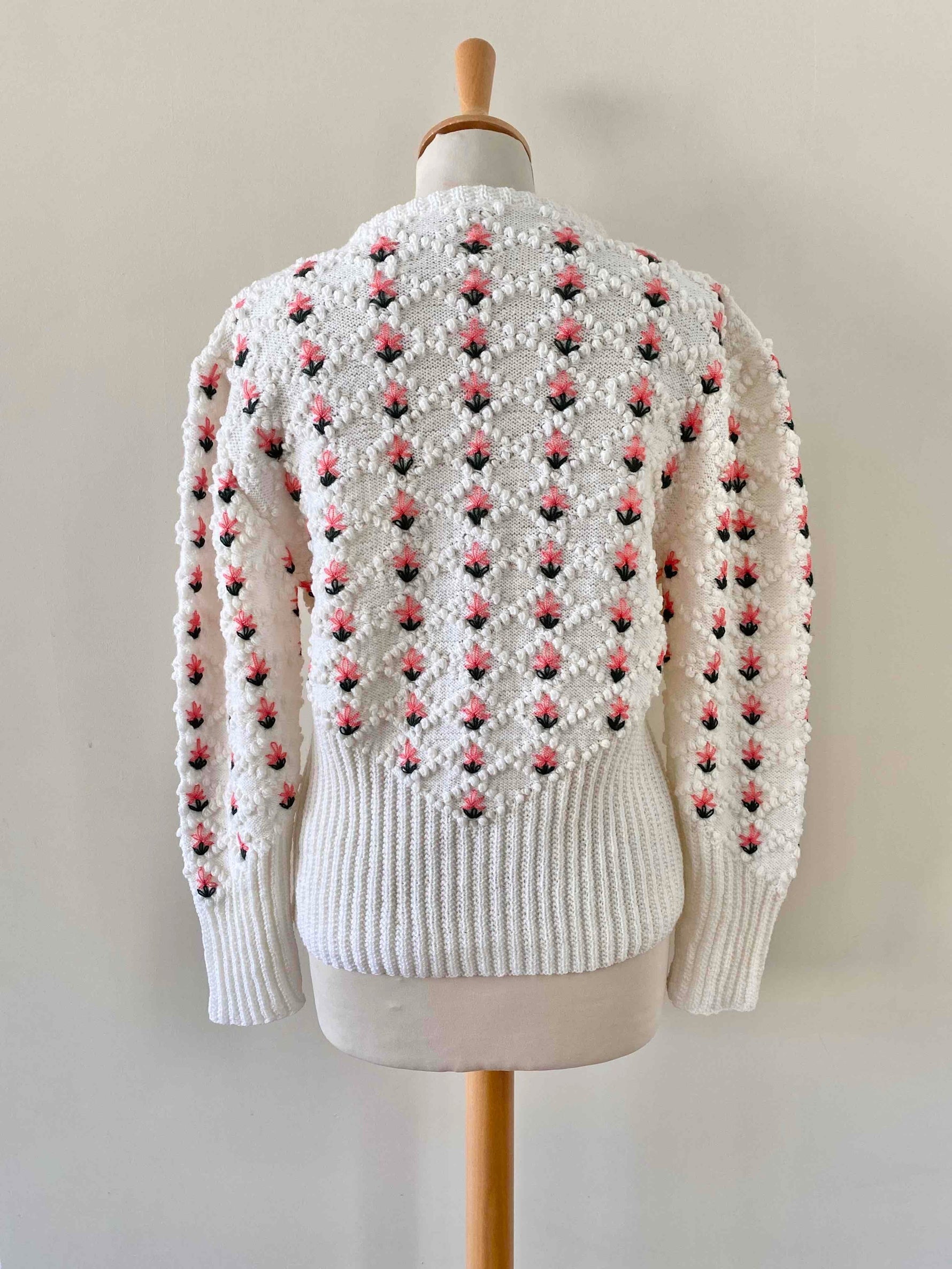 Prix unitaire parCardigan Autrichien en laine mélangée blanche, entièrement brodé de fleurs roses et vertes, maille fine pompons brodés, boutons roses, taille 36 porté ici sur un mannequin T36, tricotté et brodé mains en Autriche.
