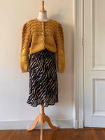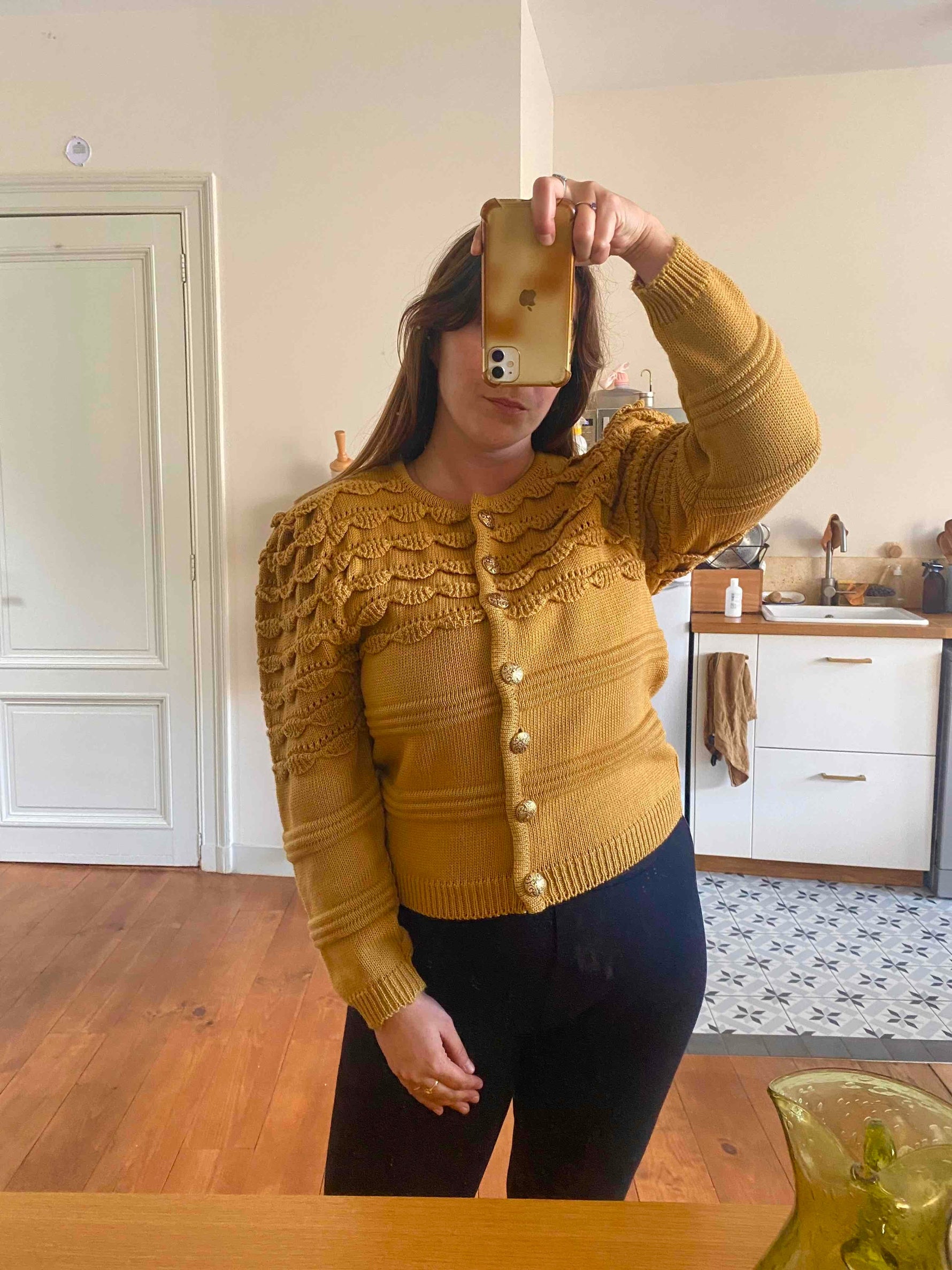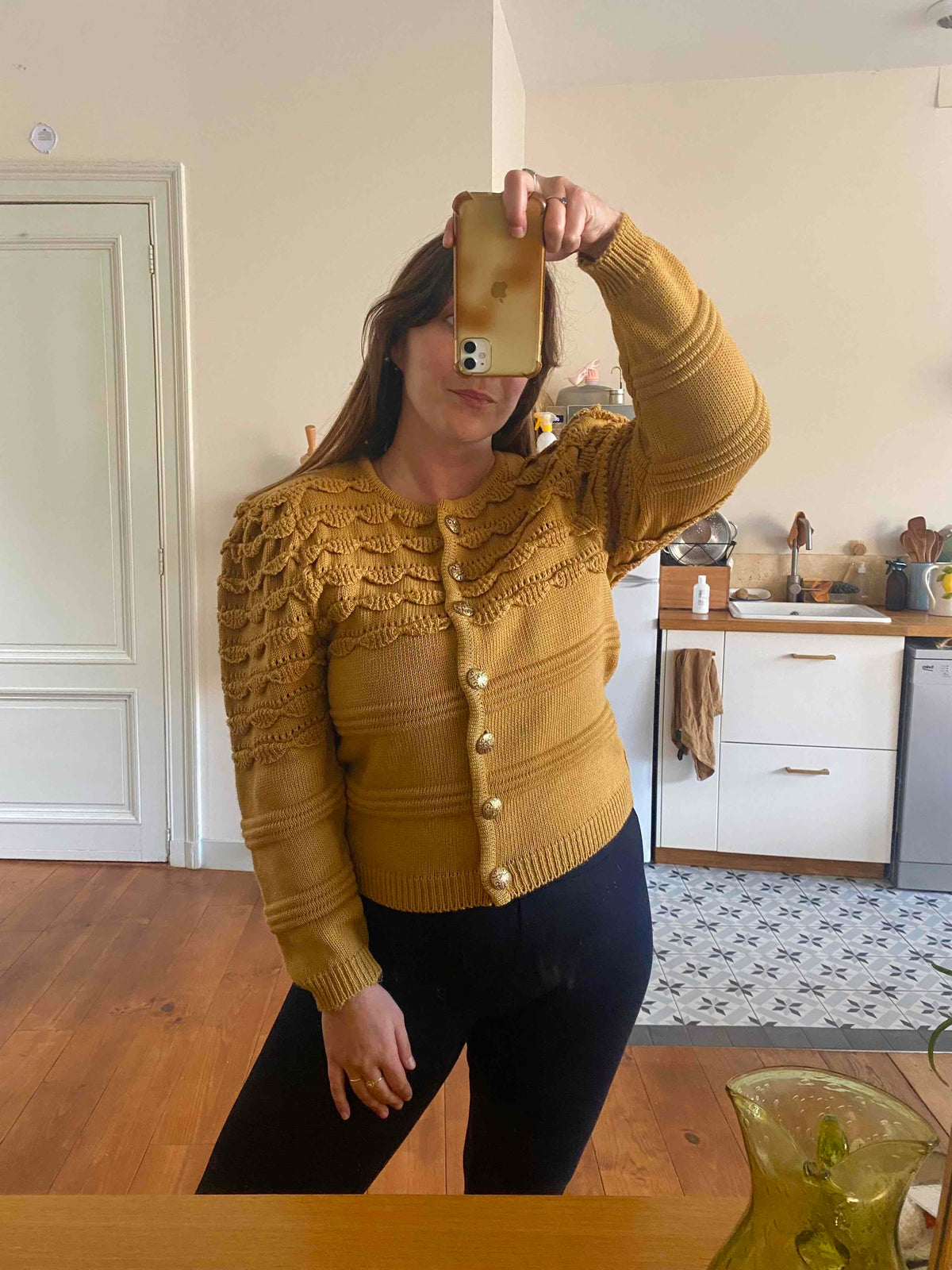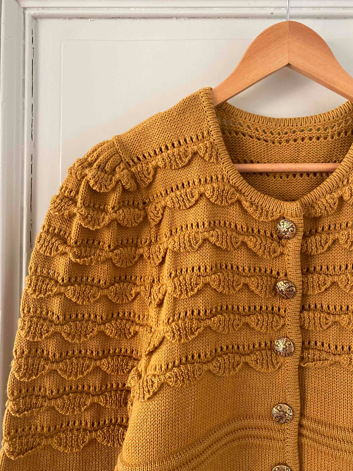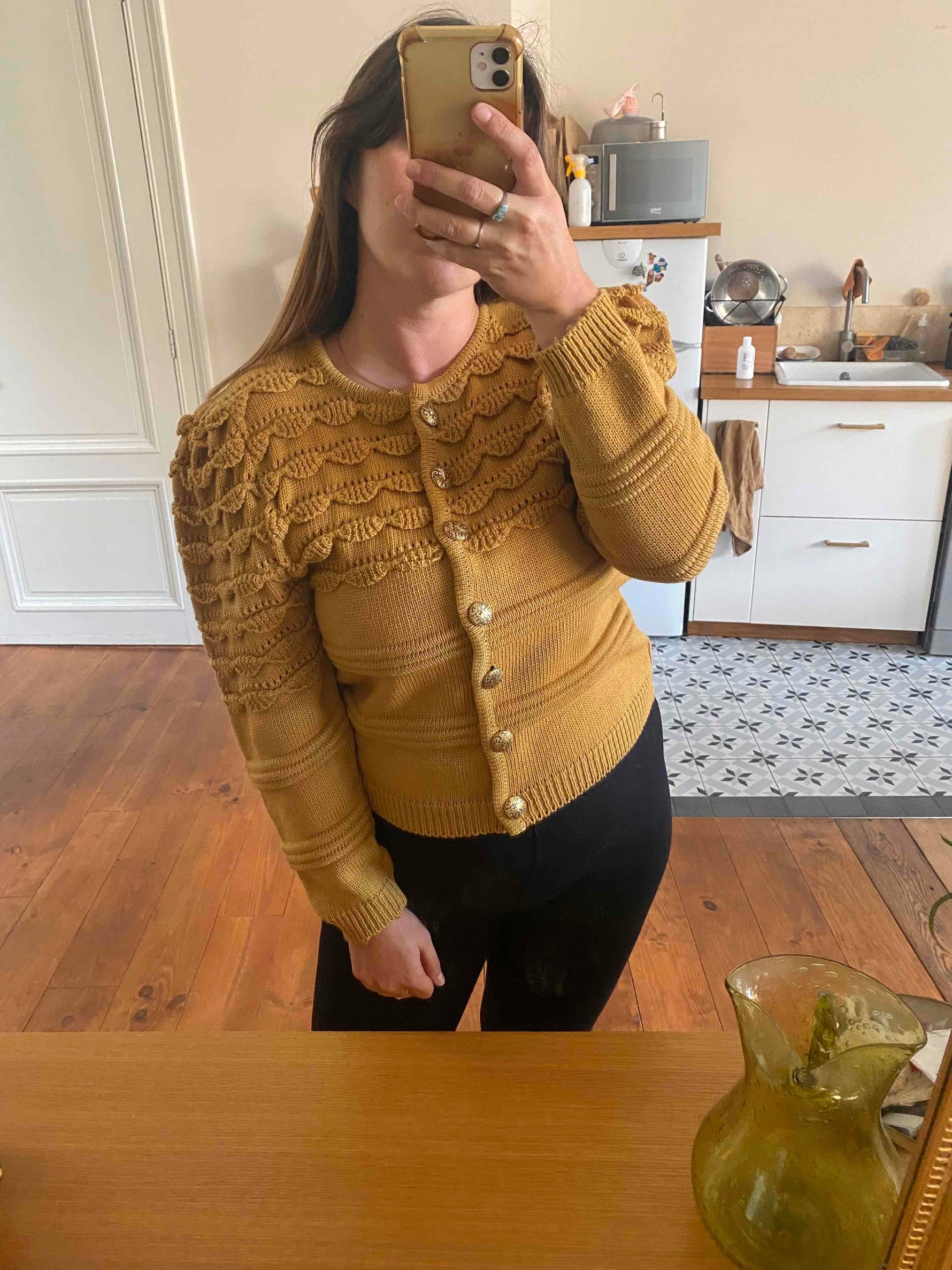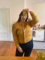 Prix unitaire parCardigan Autrichien en pure laine camel jaune ocre, volants brodés au crochet vaguelettes, gros boutons bijoux dorés fleuris, manches ballons, forme courte, fabriqué en Autriche, taille 38 et 40 porté ici sur un mannequin T36 et une personne T40.