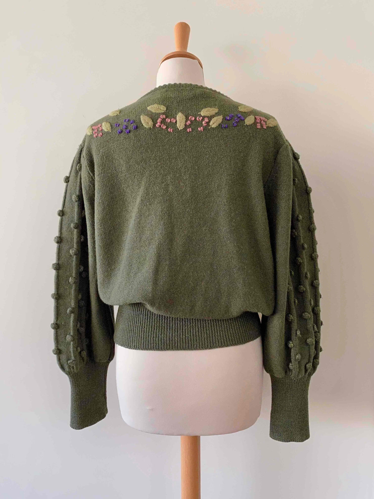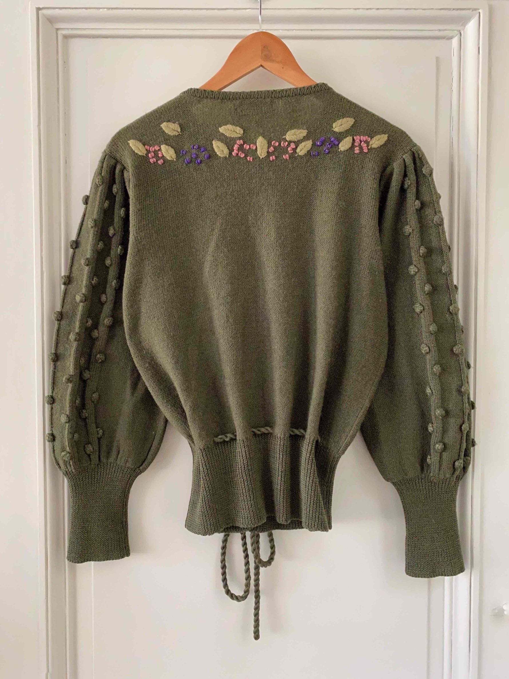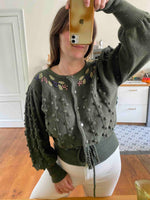 Maille popcorn pompons brodés, brodé de fleurs roses et lilas.