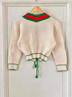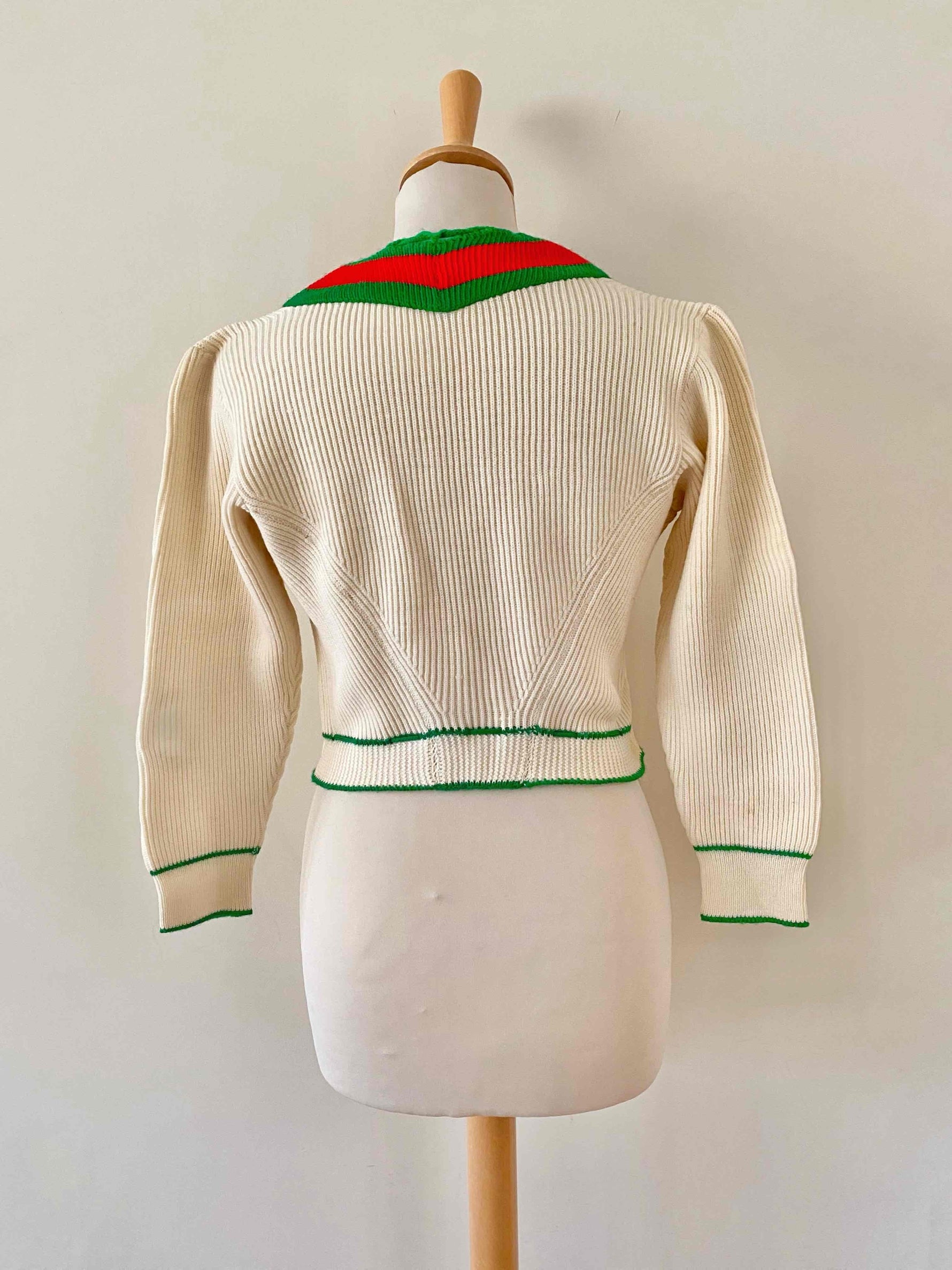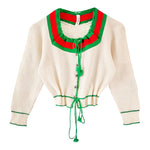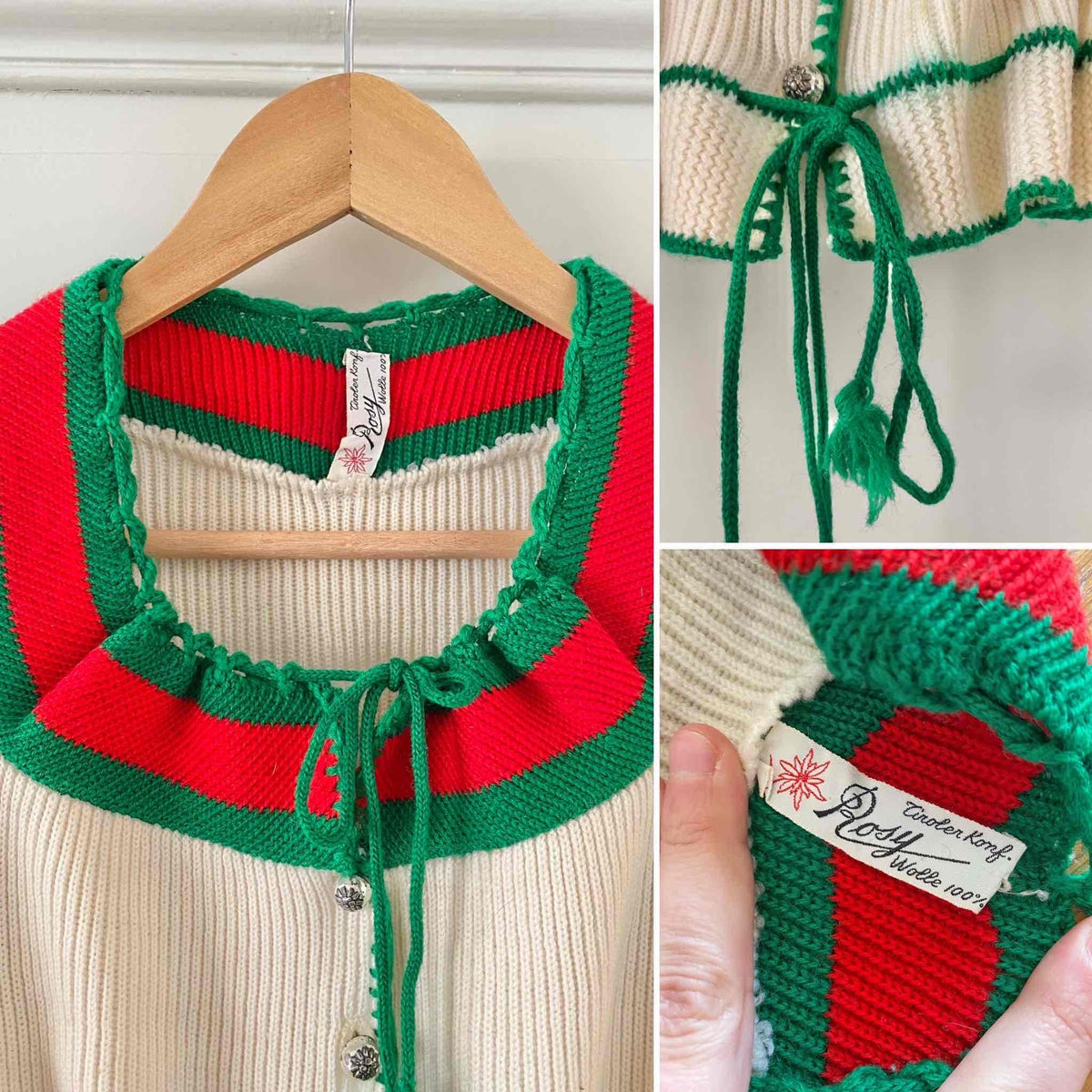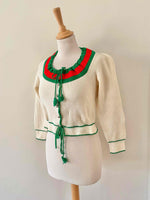 Prix unitaire parCardigan Autrichien en pure laine côtelée écrue, vert et rouge, forme cropped corsage, manches ballons, boutons bijoux argentés, col et taille à basque à nouer, fabriqué en Autriche.