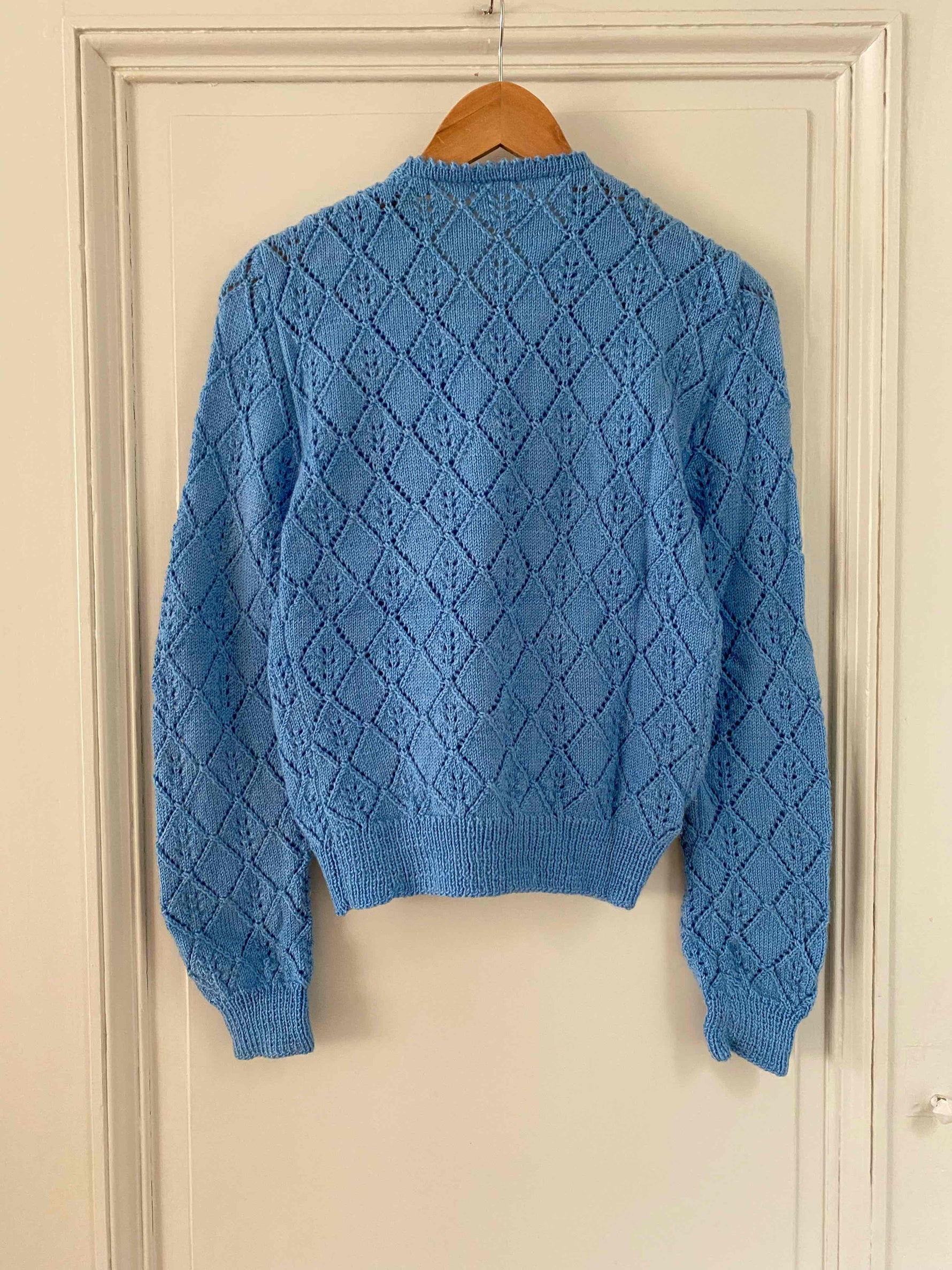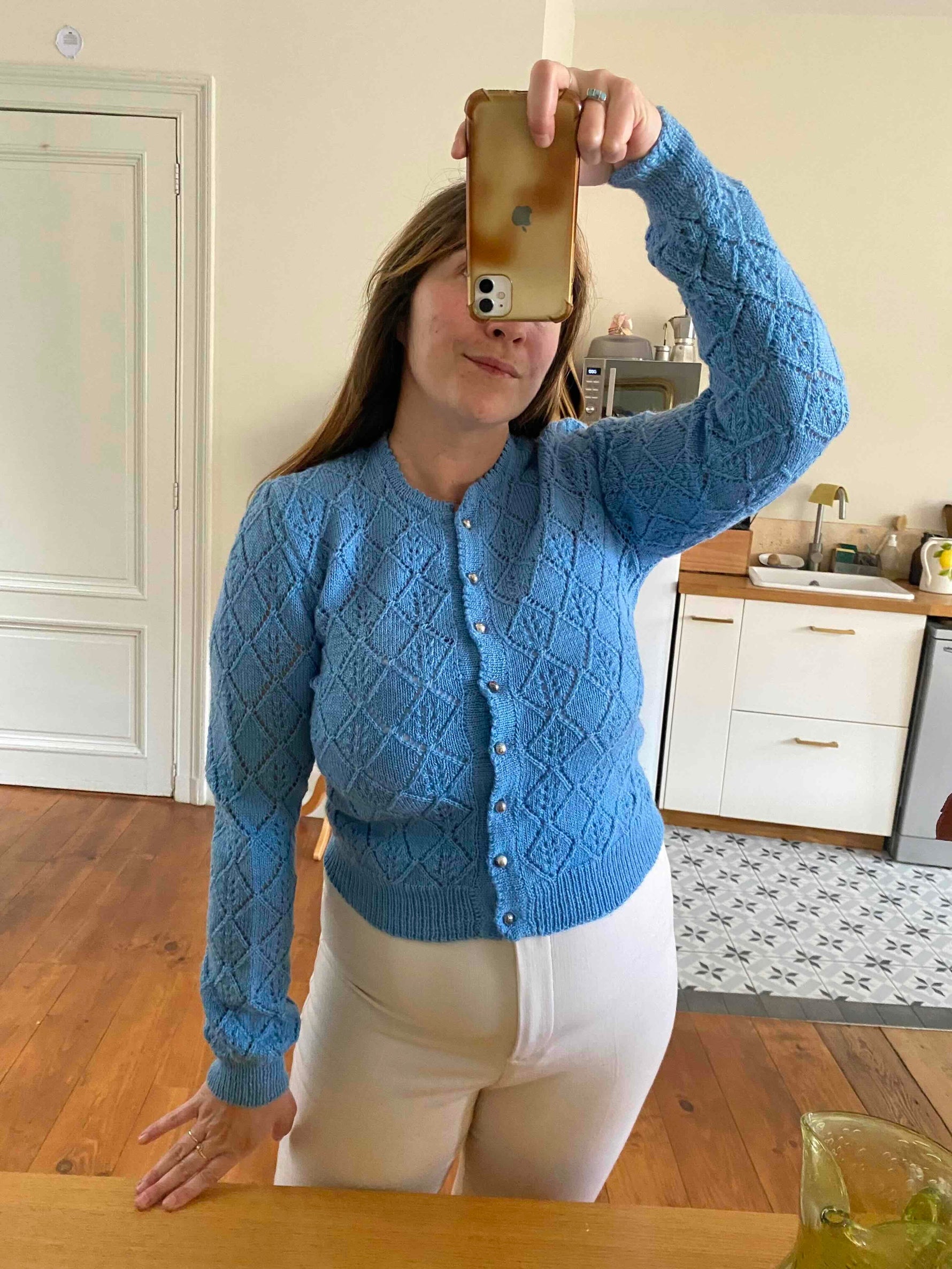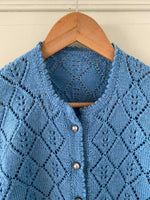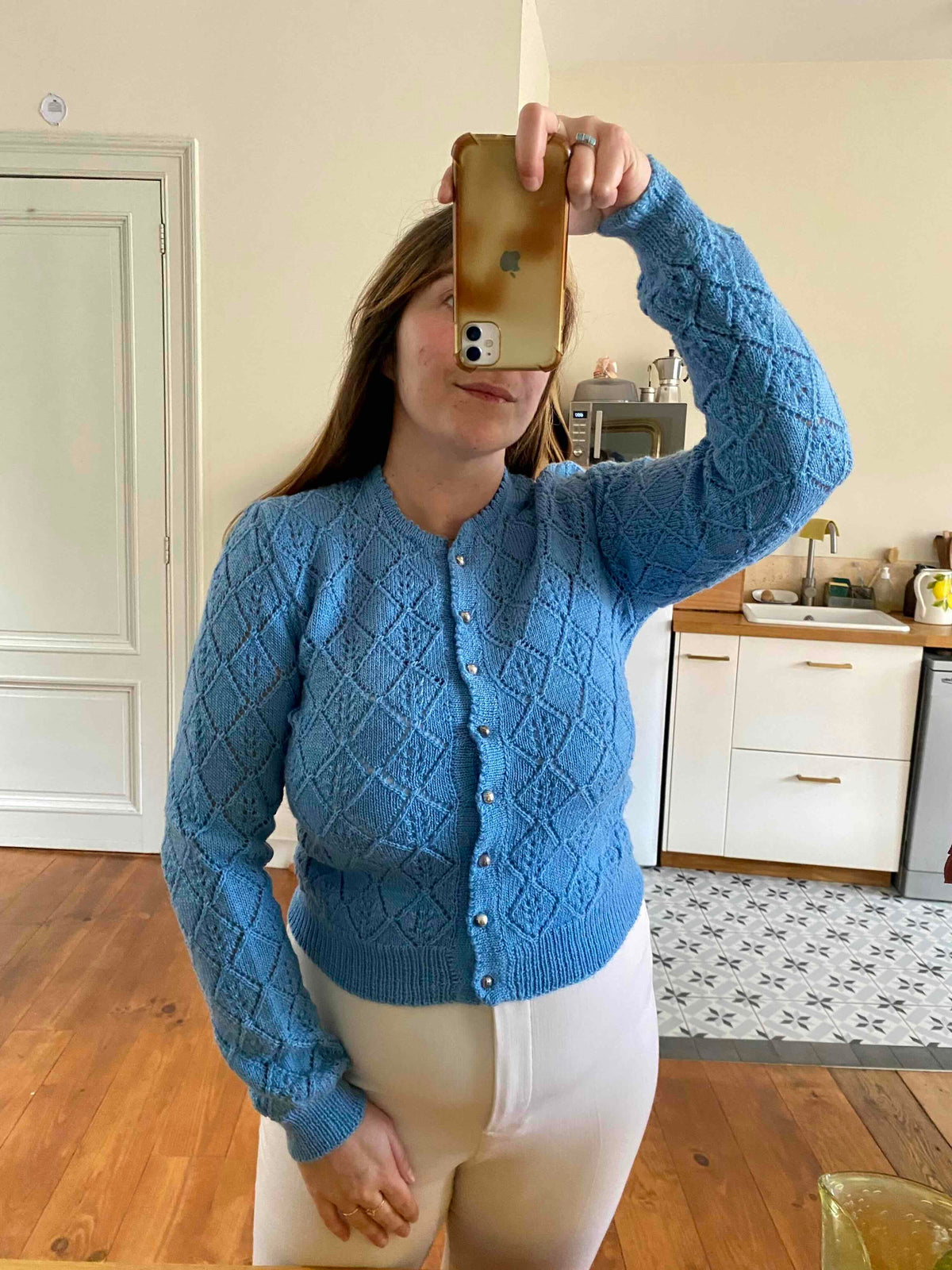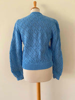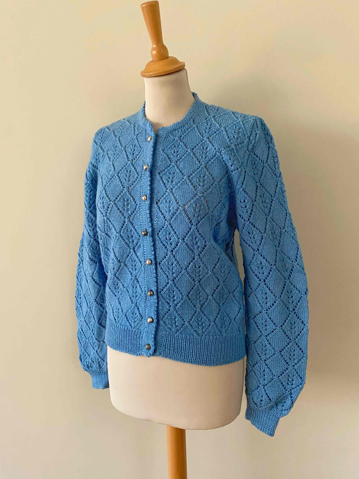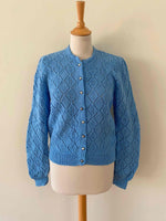 Cardigan Autrichien en pure laine bleue ciel, tricot ajouré dentelle croisillons, boutons bijoux argentés, manches ballons, tricotté mains en Autriche, taille 36 et 38 porté ici sur un mannequin T36 et une personne T40.