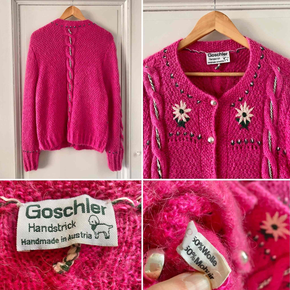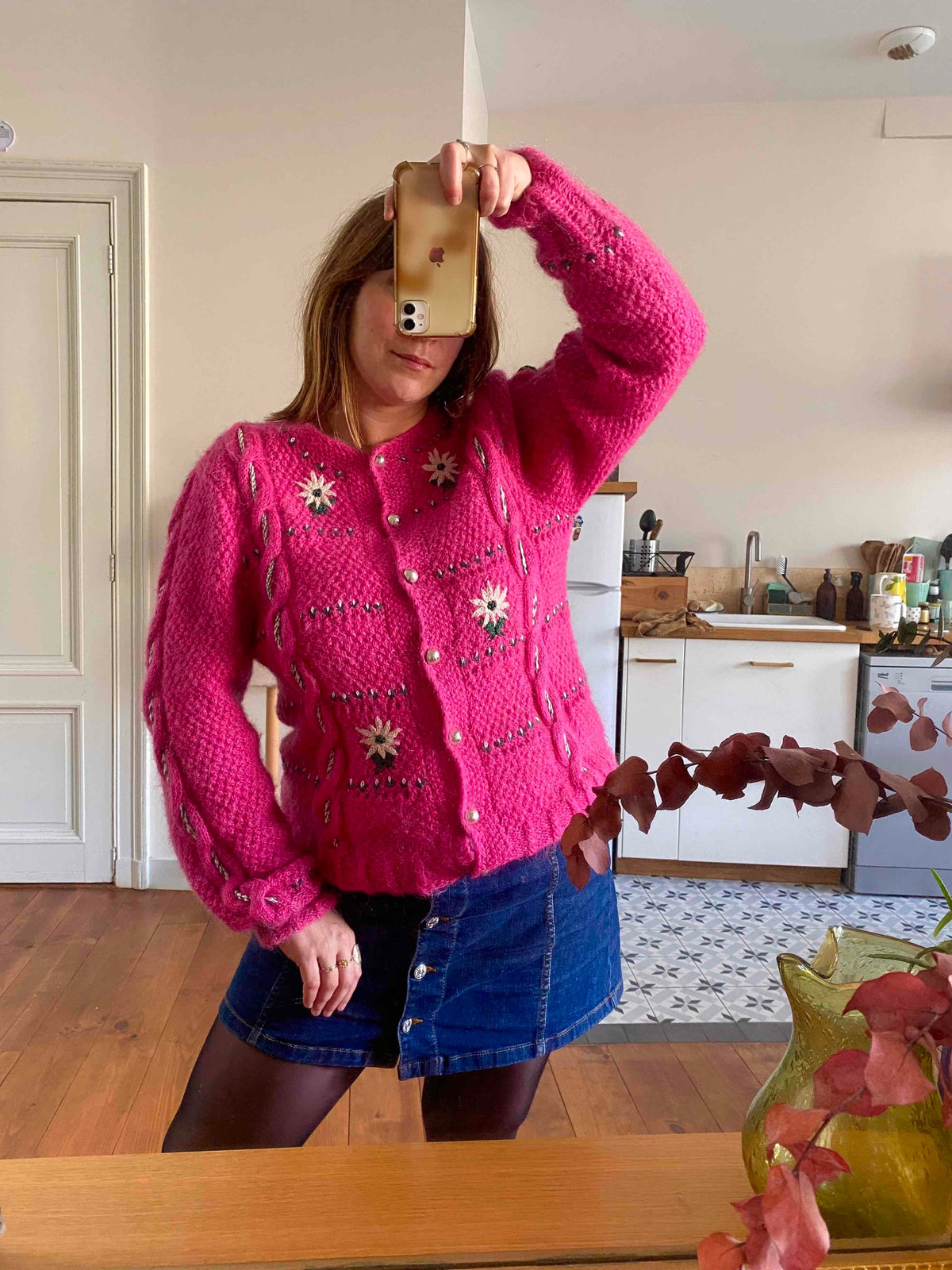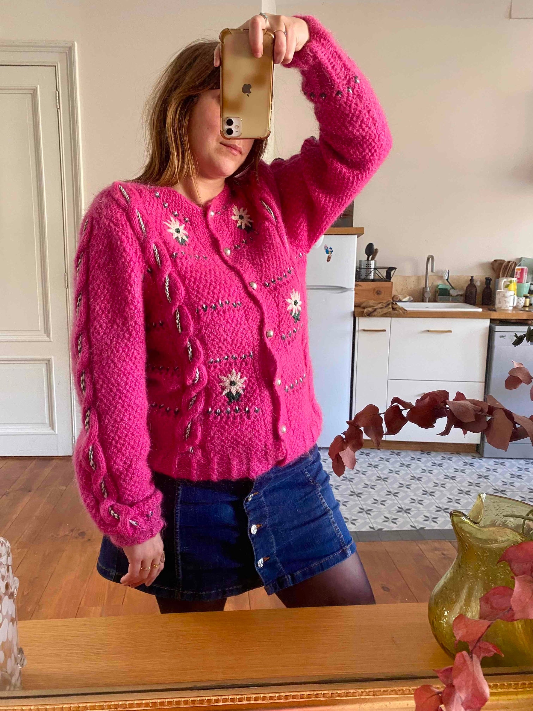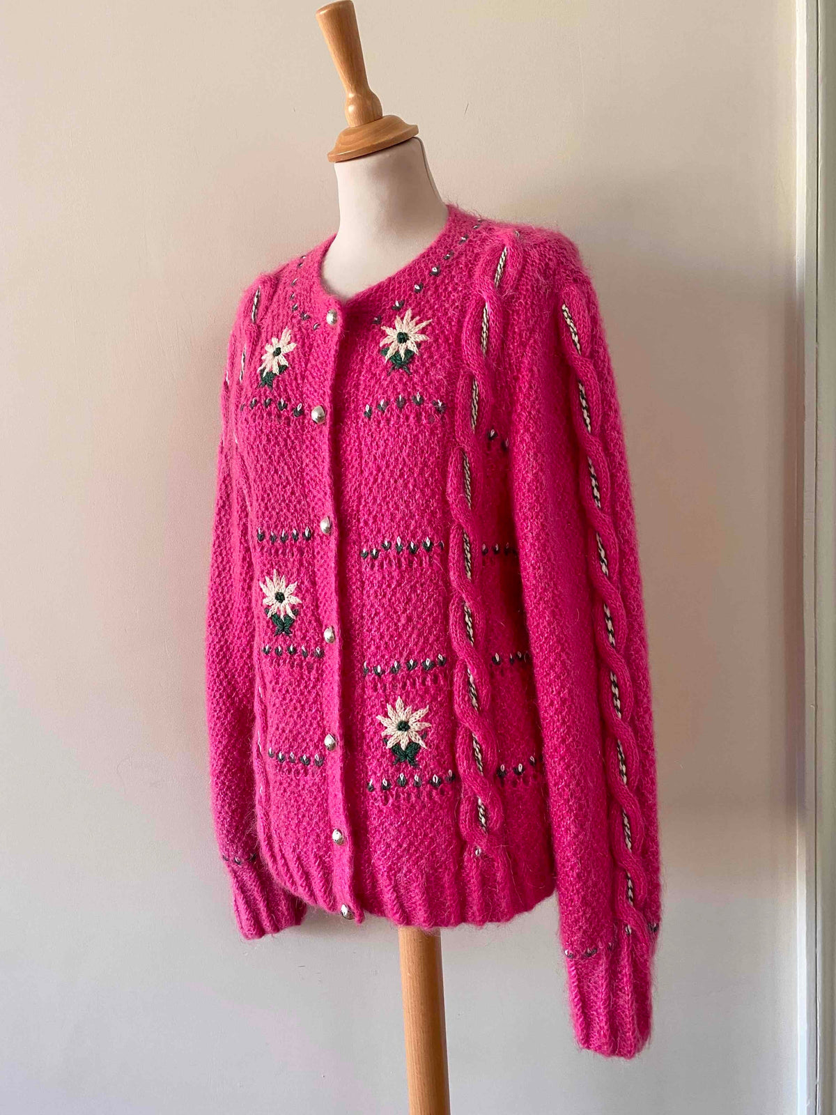Prix unitaire parCardigan autrichien en Laine et Mohair rose fuchsia brodé de fleurs et torsades vert et blanc, boutons bijoux argentés, tricoté et brodé mains en Autriche, Taille 40 porté ici sur un mannequin T36 et une personne T40.