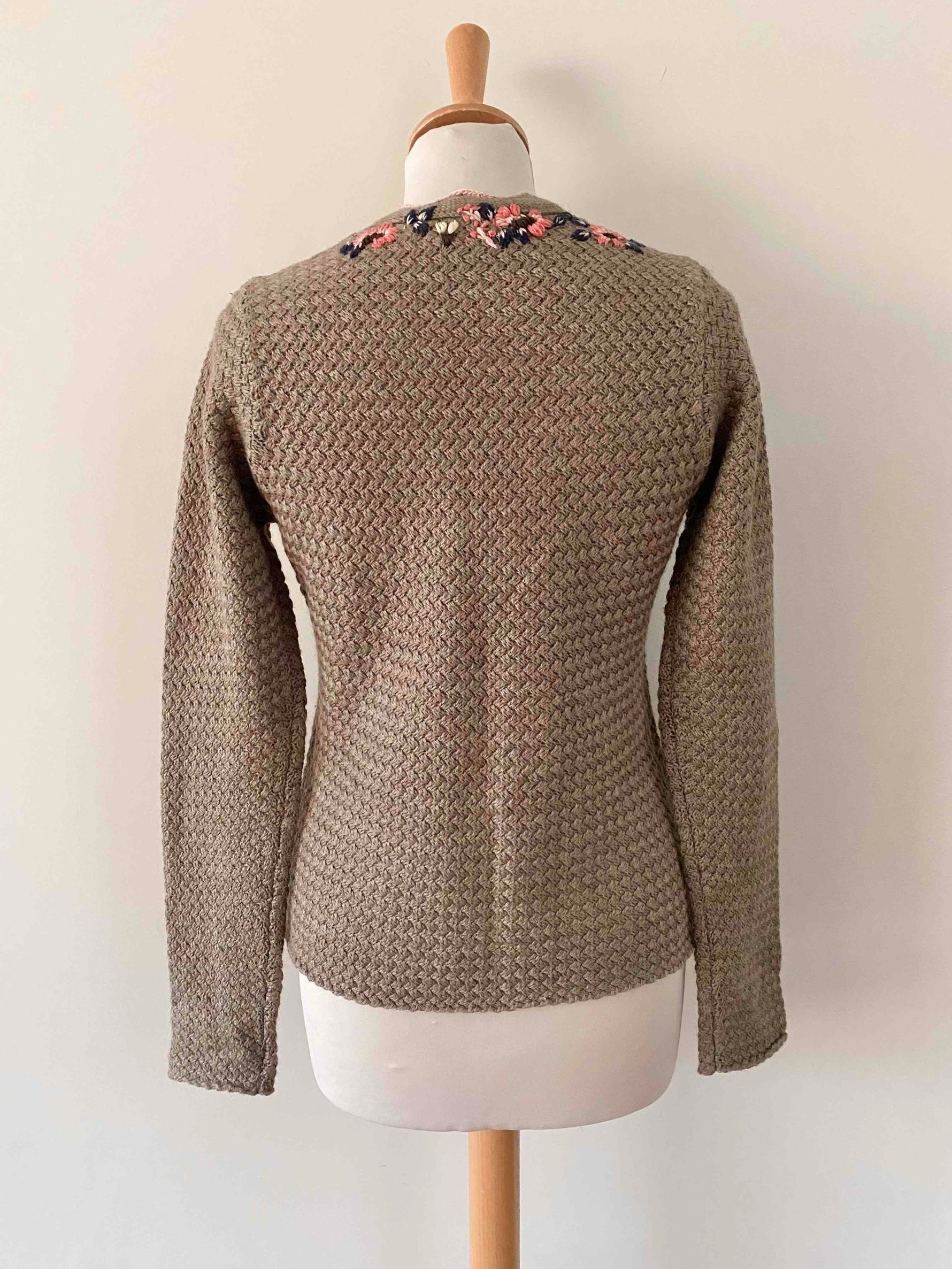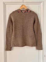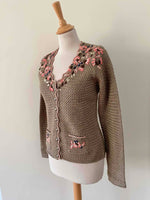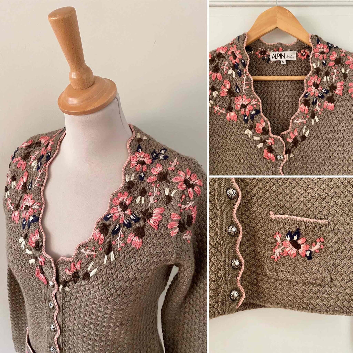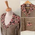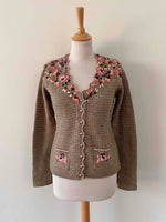 Prix unitaire parCardigan autrichien en laine et soie beige camel brodé de fleurs roses, encolure pétales, boutons bijoux argentés fleuris, fabriqué en Autriche.
