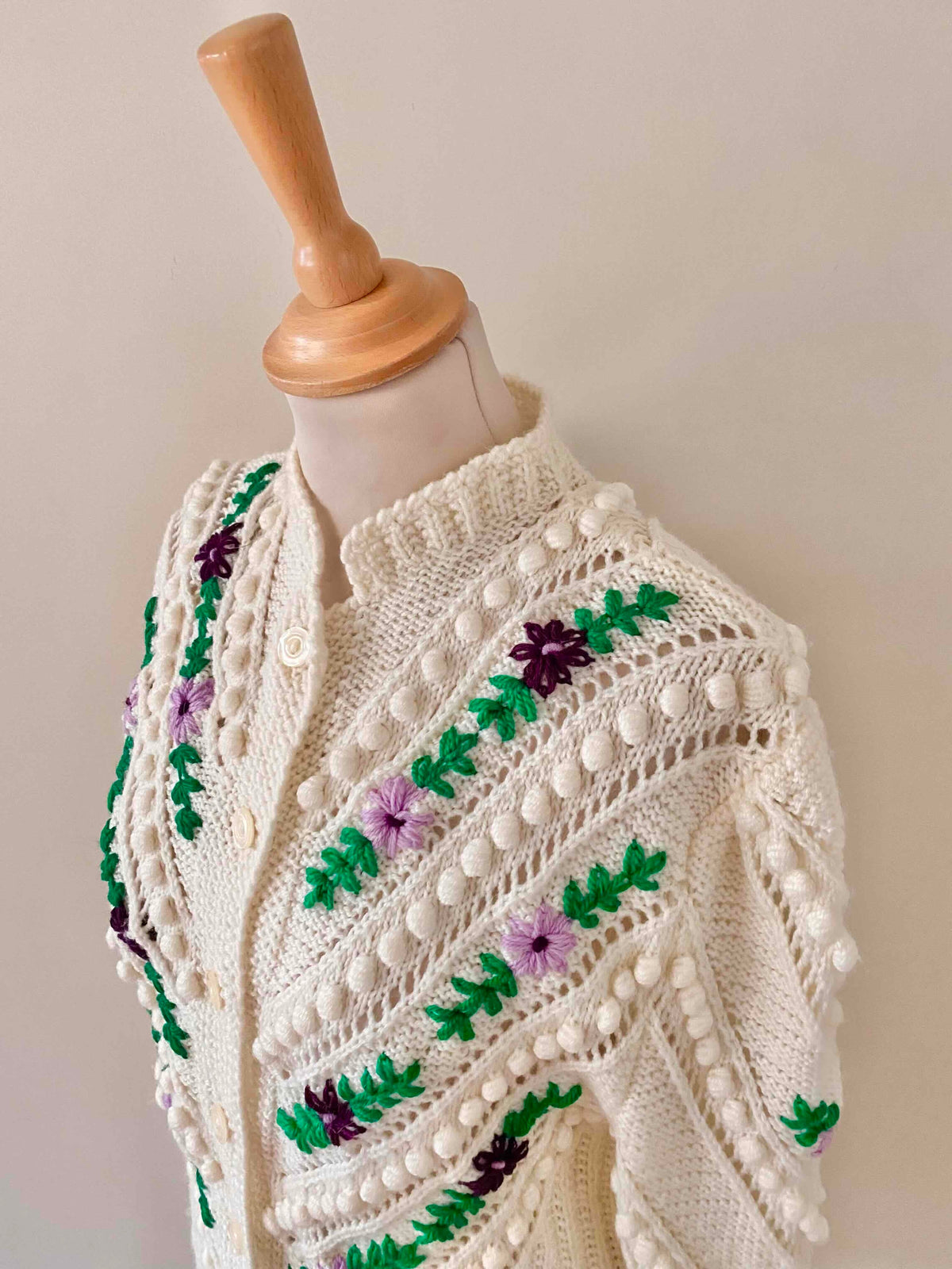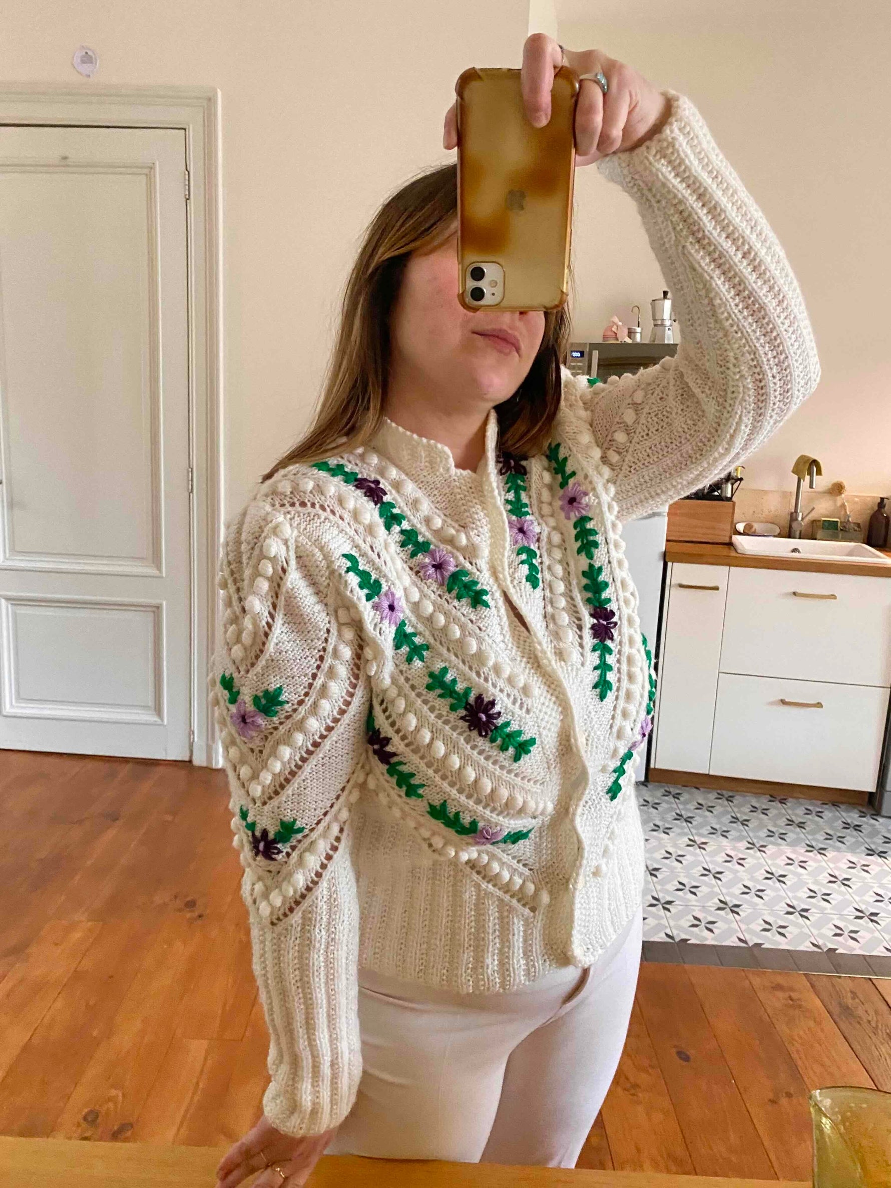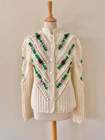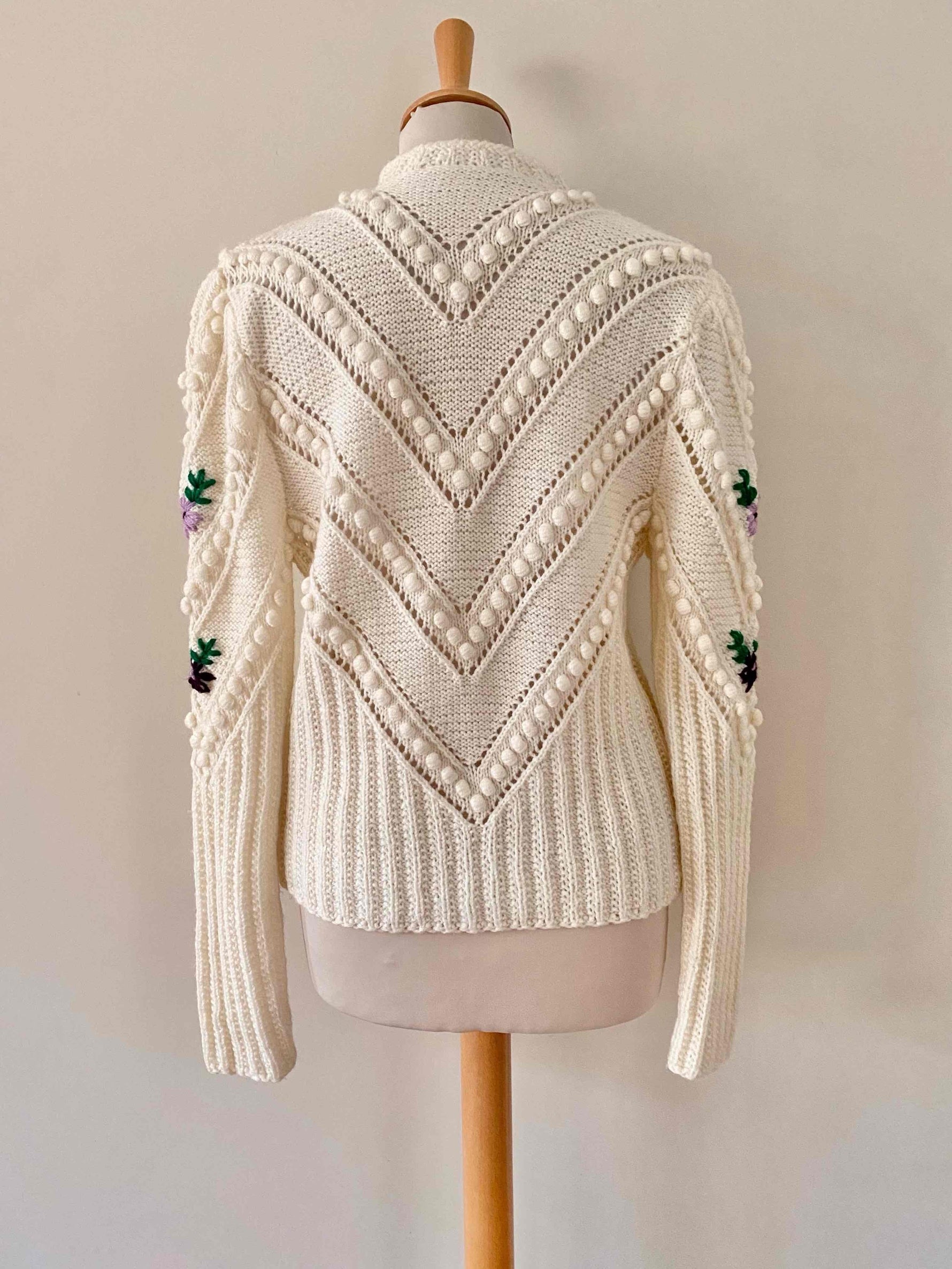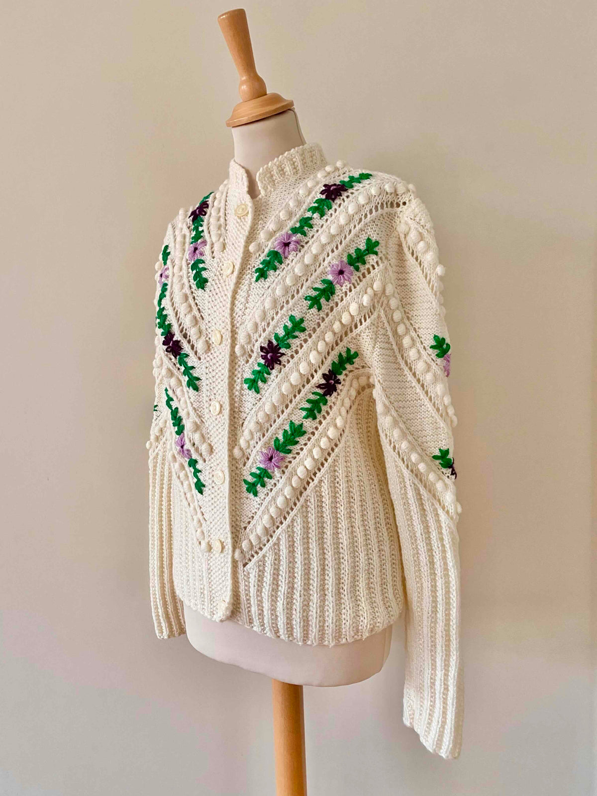 Prix unitaire parCardigan autrichien en laine mélangée blanche, brodé de fleurs lilas, violettes, et vert gazon, maille popcorn pompons brodés et ajourés, manches ballons brodées, tricoté et brodé mains en Autriche, taille 38 porté ici sur un mannequin T36 et une personne T40.