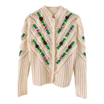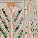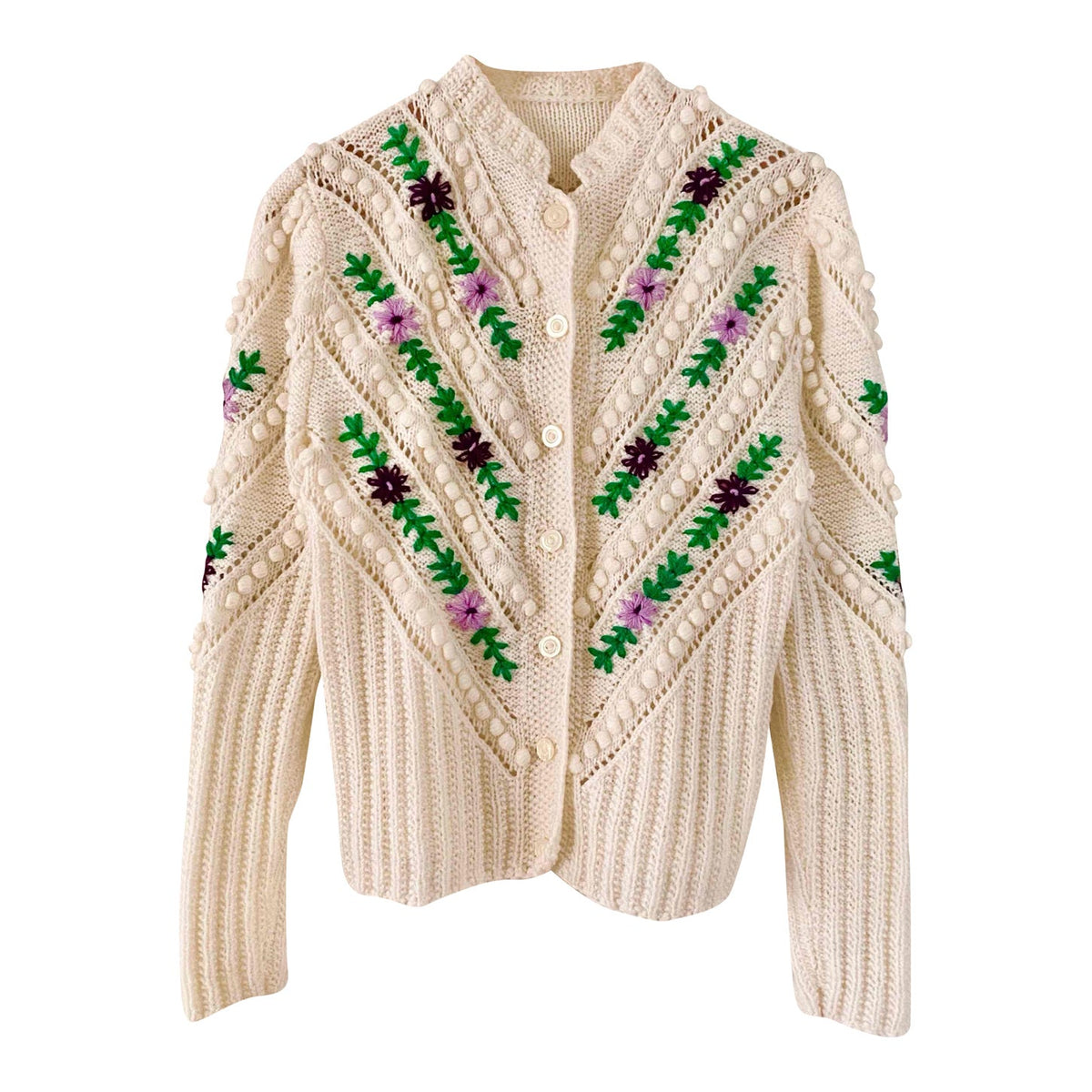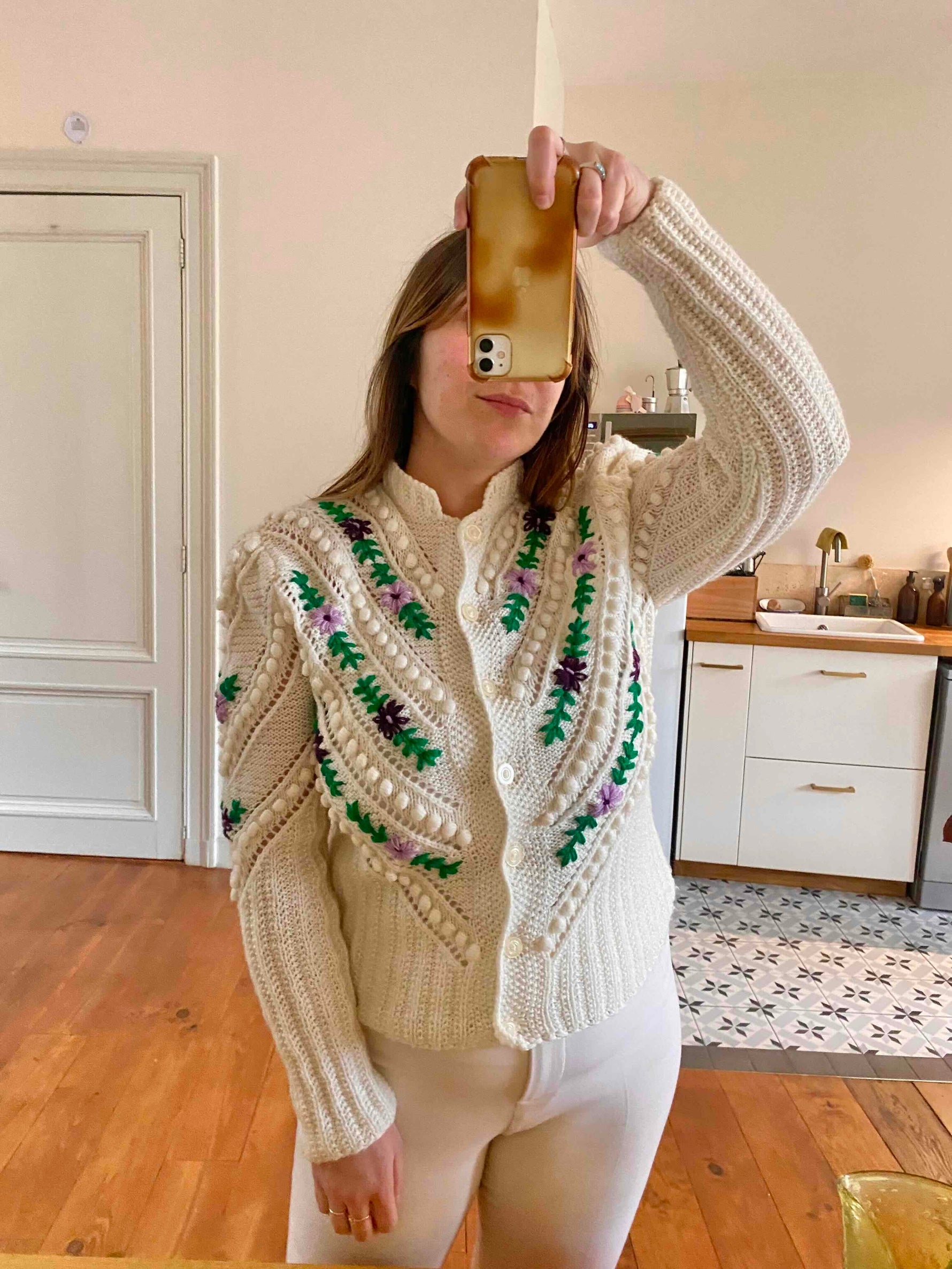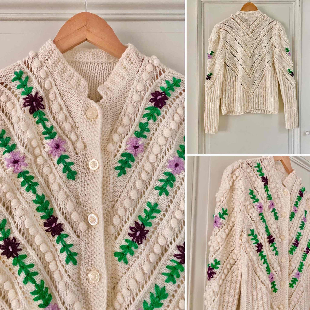 Prix unitaire parCardigan autrichien en laine mélangée blanche, brodé de fleurs lilas, violettes, et vert gazon, maille popcorn pompons brodés et ajourés, manches ballons brodées, tricoté et brodé mains en Autriche, taille 38 porté ici sur un mannequin T36 et une personne T40.