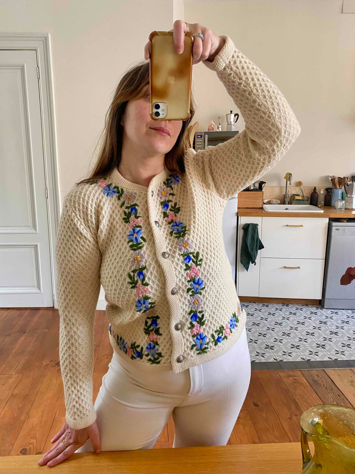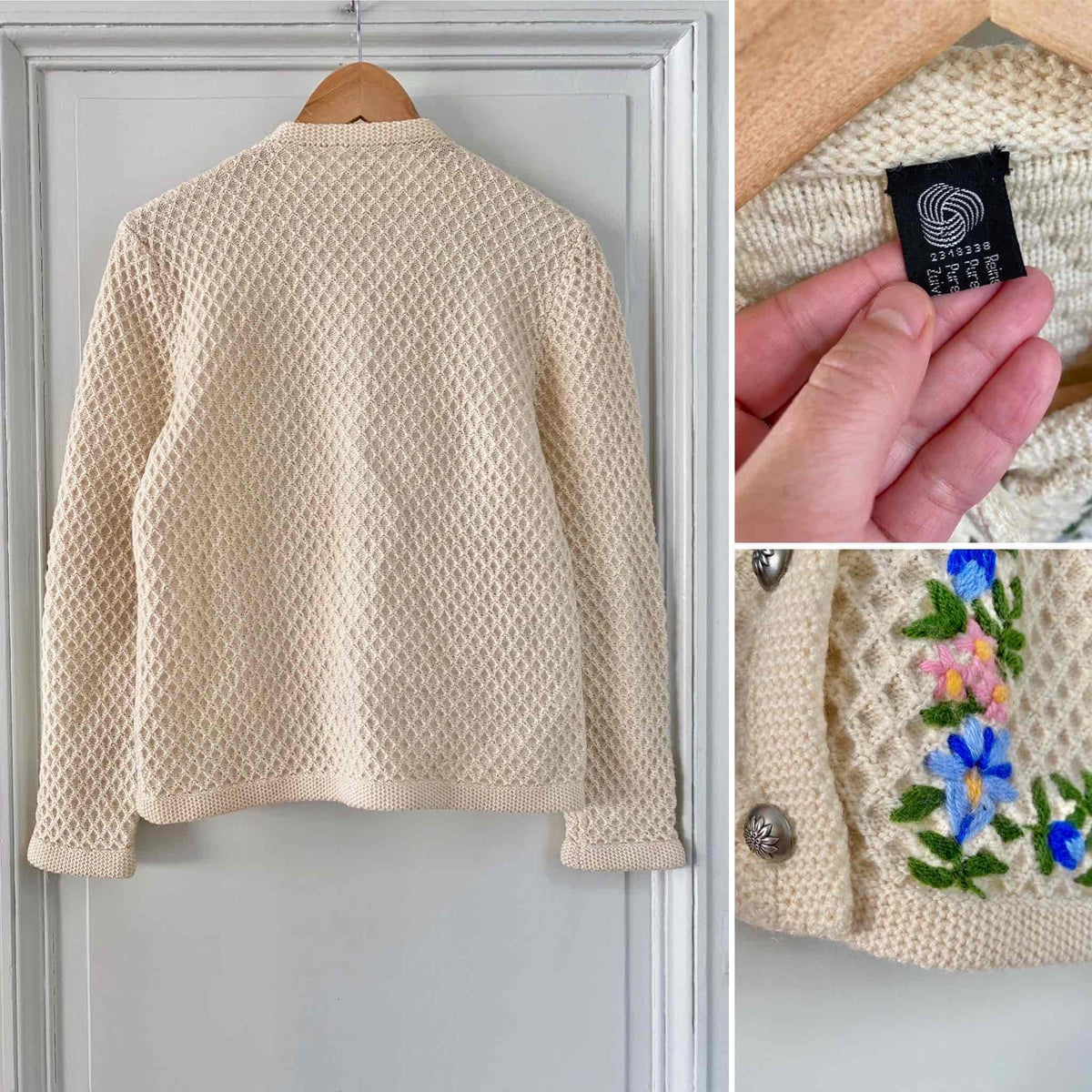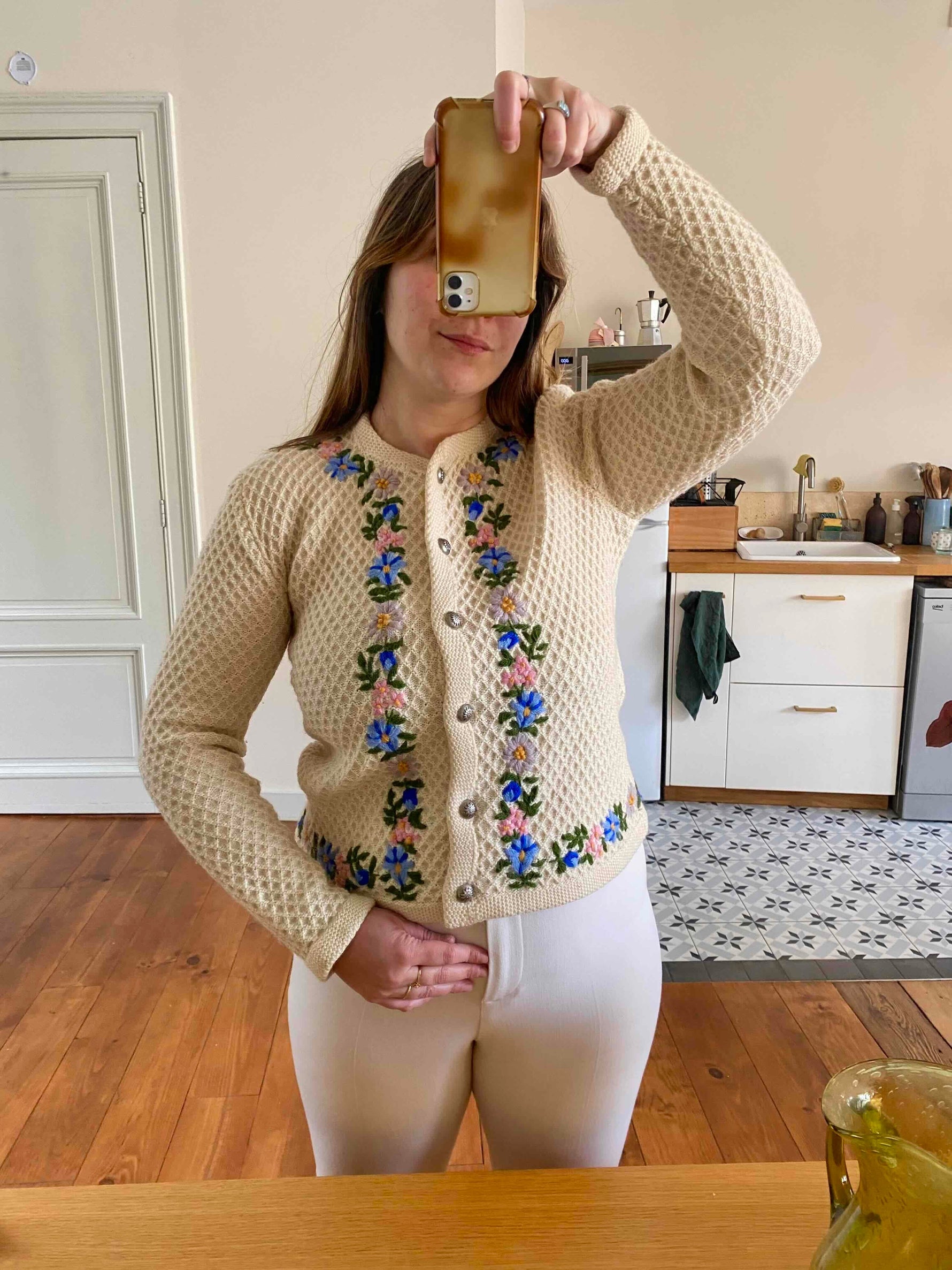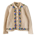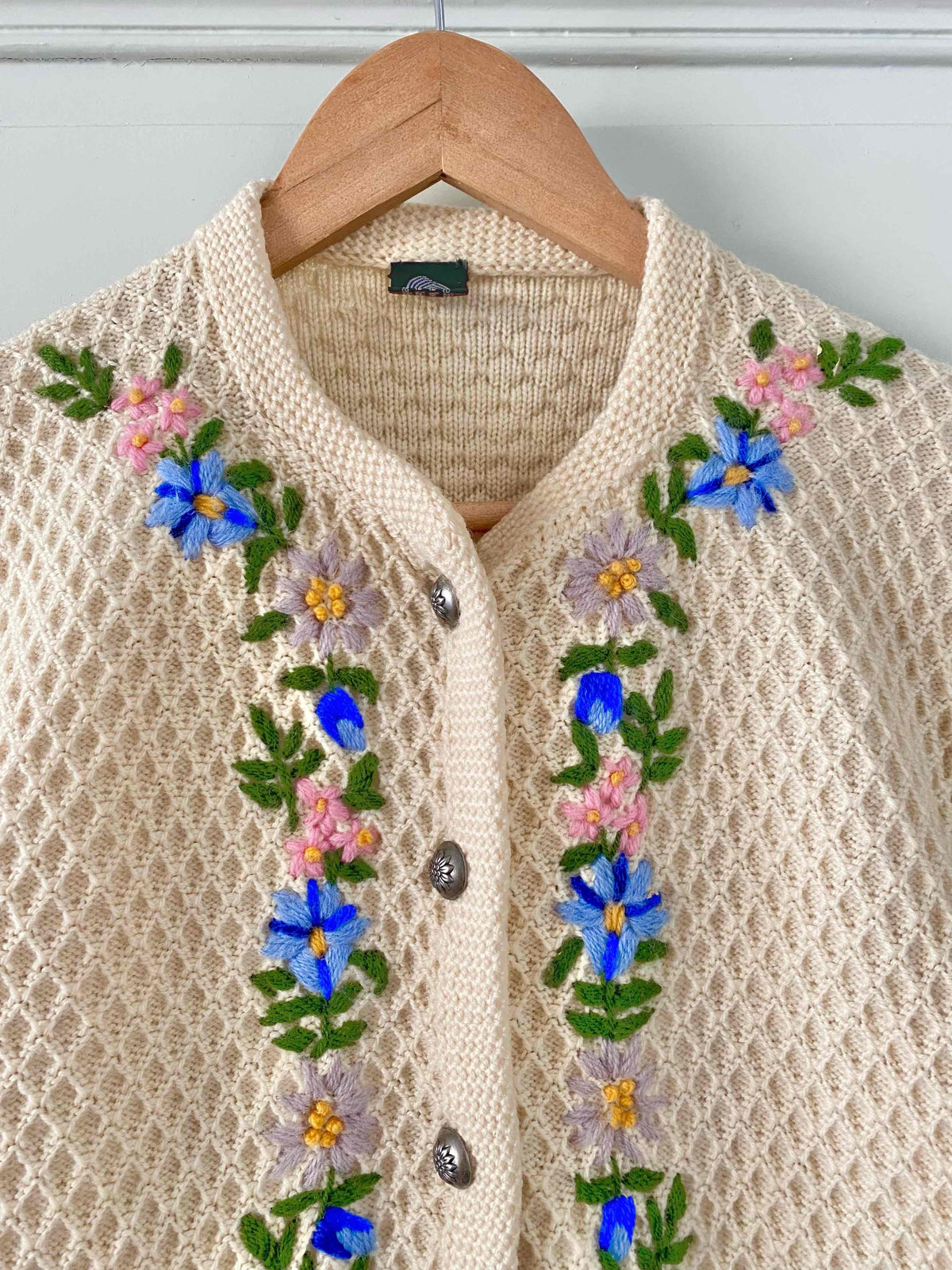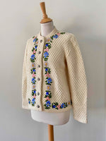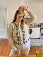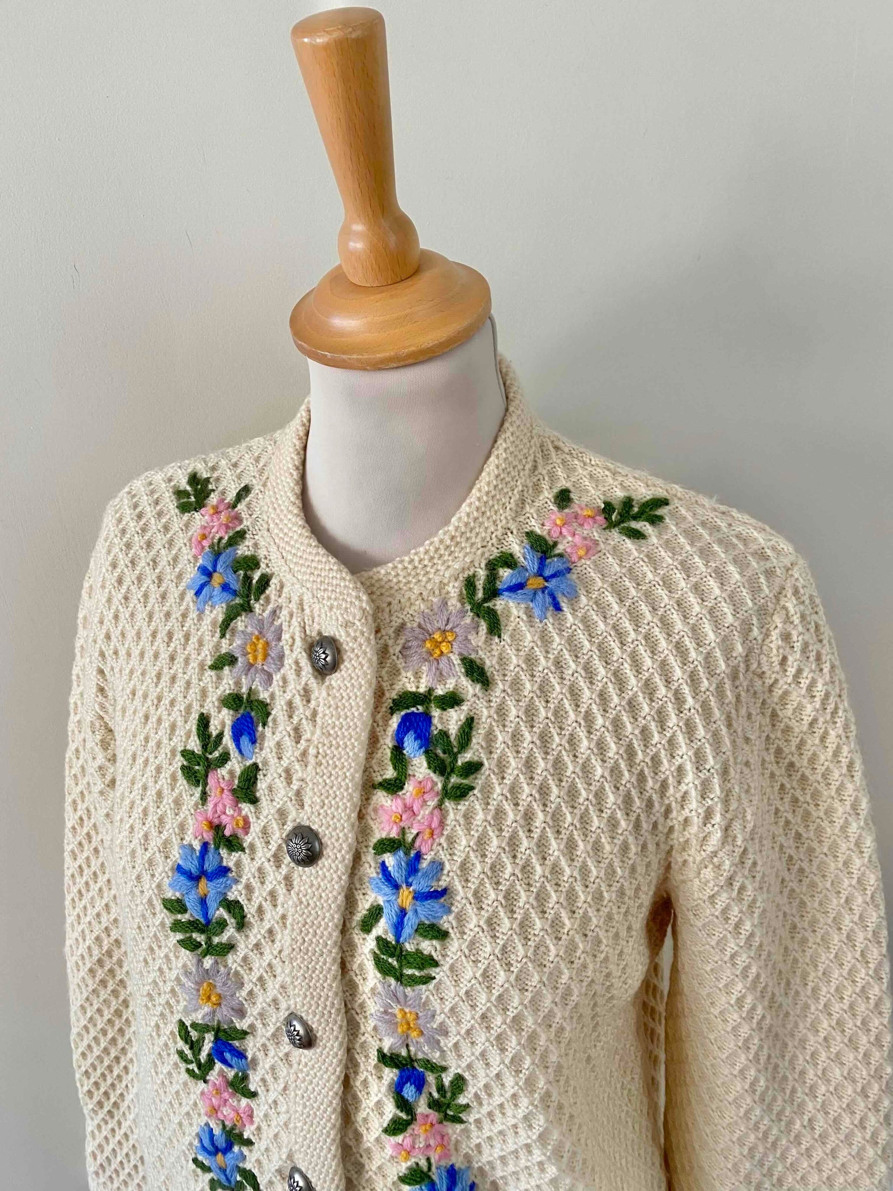 Prix unitaire parCardigan autrichien en pure laine écrue maille nid d'abeille croisillons, brodé de fleurs multicolores pastels, lilas, roses, jaunes, bleues roi et vertes, boutons bijoux argentés fleuris, fabriqué en Autriche, taille 38 porté ici sur un mannequin T36 et serré sur une personne T40.