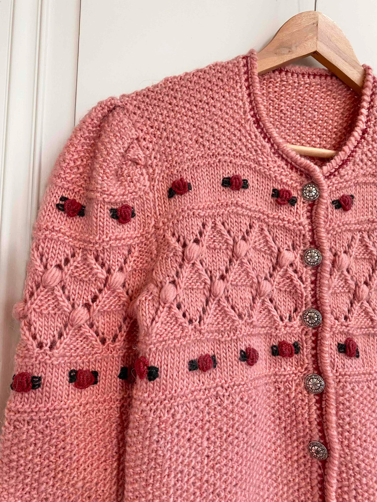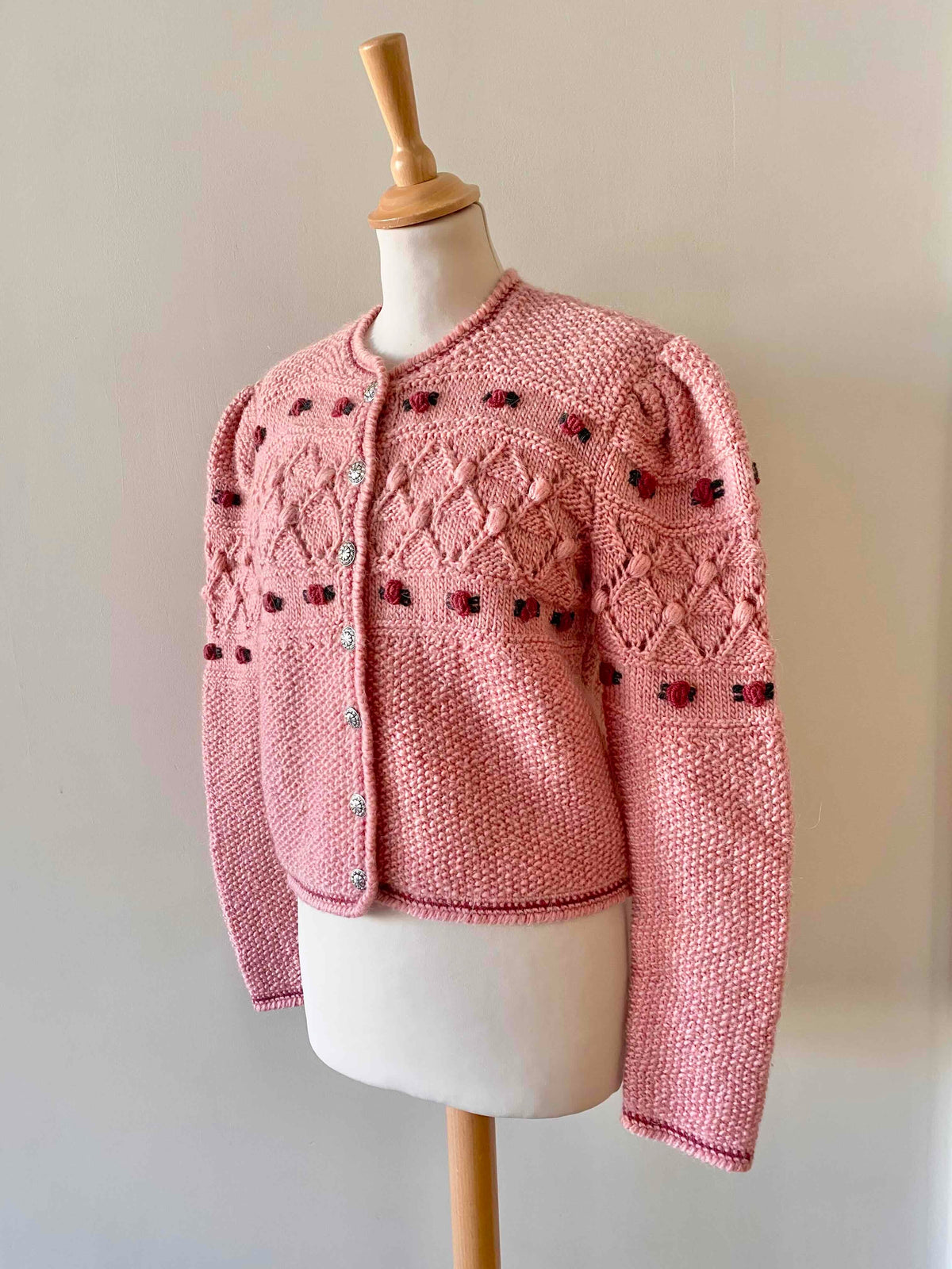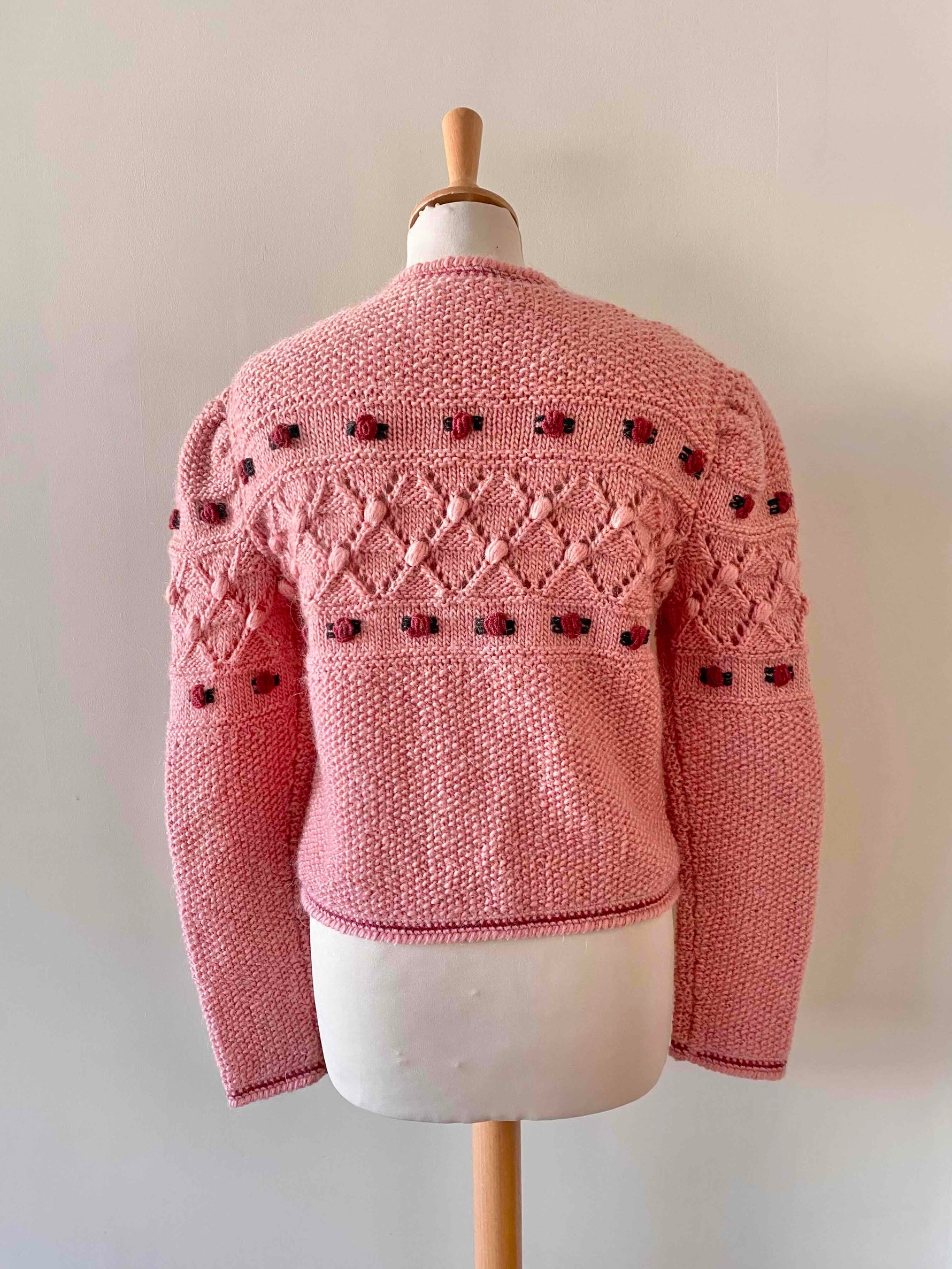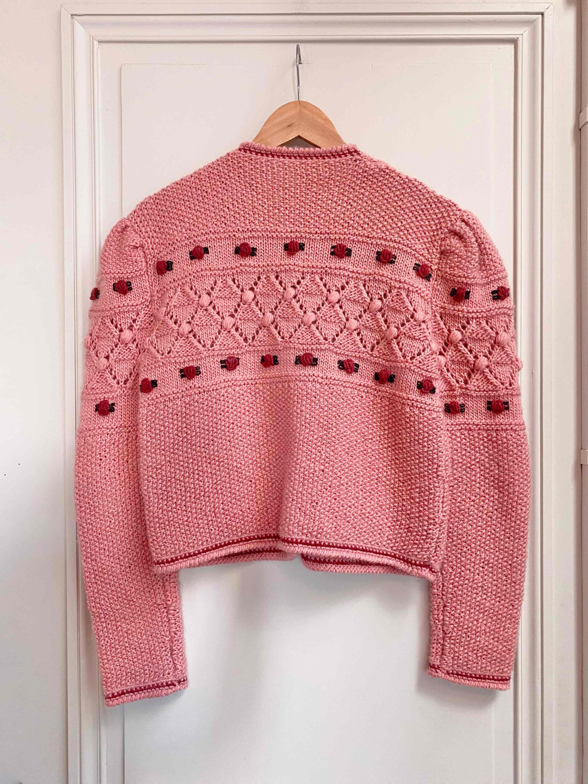 Cardigan Autrichien en pure laine duveteuse et fluffly rose poudré, maille popcorn pompons brodés croisillons ajourés, fleurs brodées boutons de roses rouge grenat et vert foncé, boutons bijoux argentés fleuris, manches ballons et forme cropped, tricotté et brodé mains en Autriche, taille 36 et 38 porté ici sur un mannequin T36 et serré sur une personne T40.