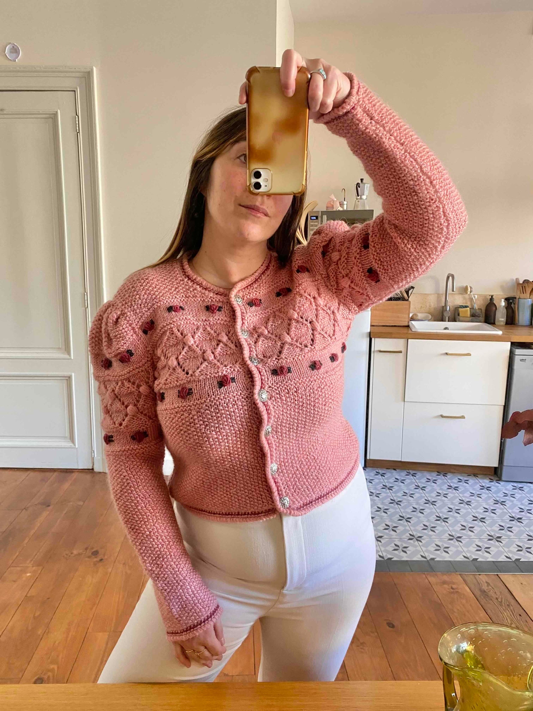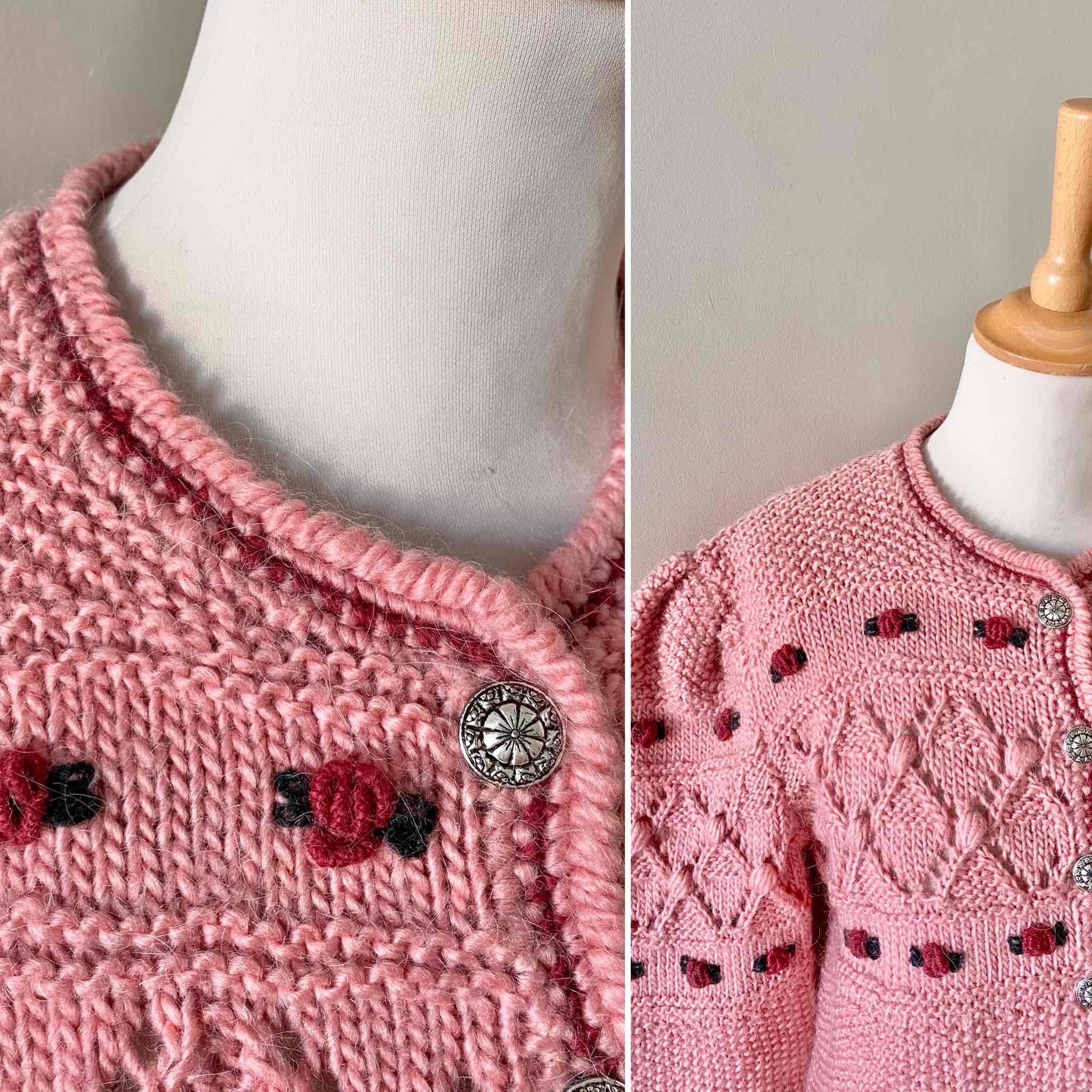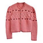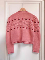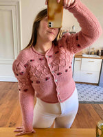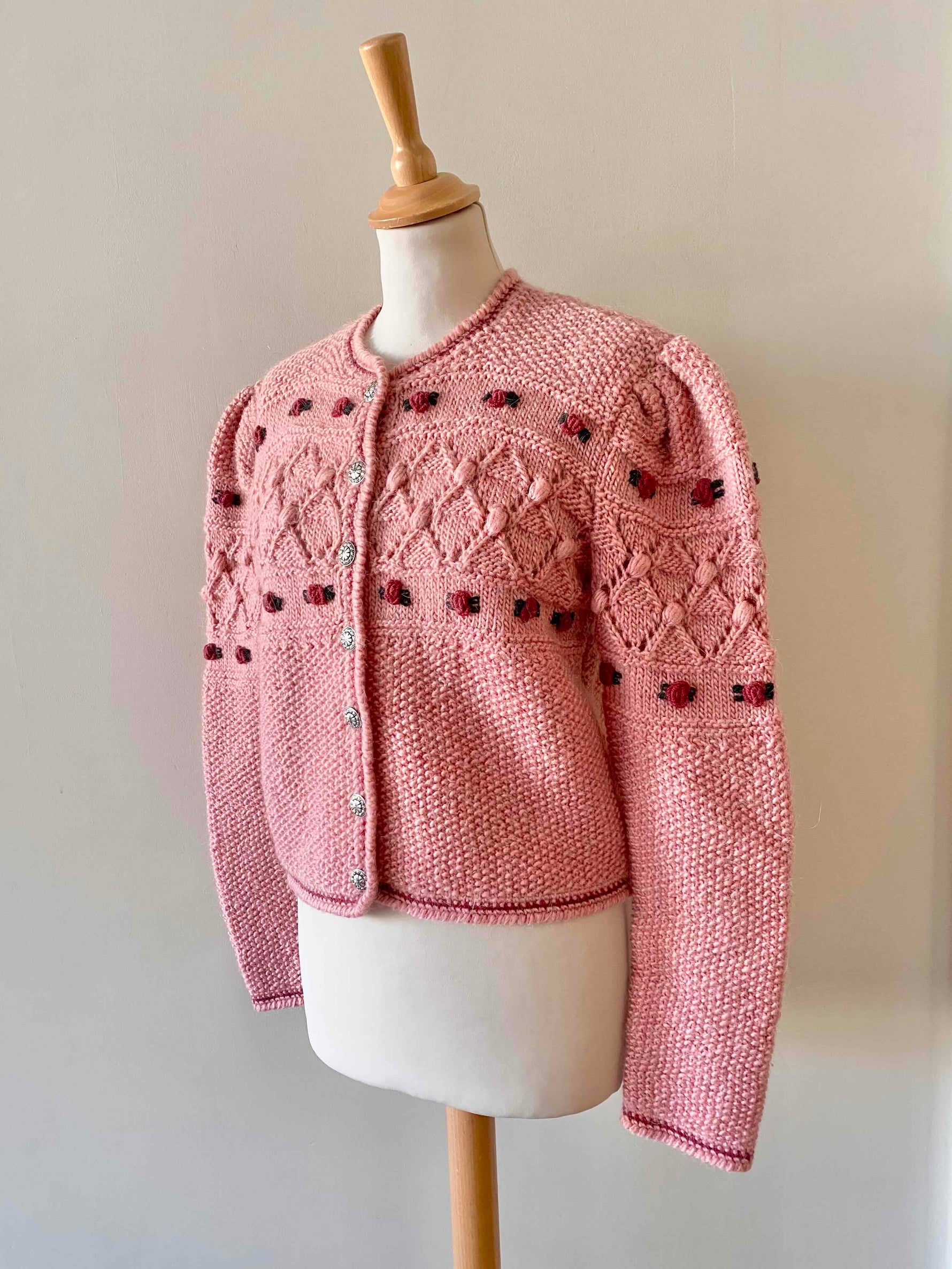 Cardigan Autrichien en pure laine duveteuse et fluffly rose poudré, maille popcorn pompons brodés croisillons ajourés, fleurs brodées boutons de roses rouge grenat et vert foncé, boutons bijoux argentés fleuris, manches ballons et forme cropped, tricotté et brodé mains en Autriche, taille 36 et 38 porté ici sur un mannequin T36 et serré sur une personne T40.
