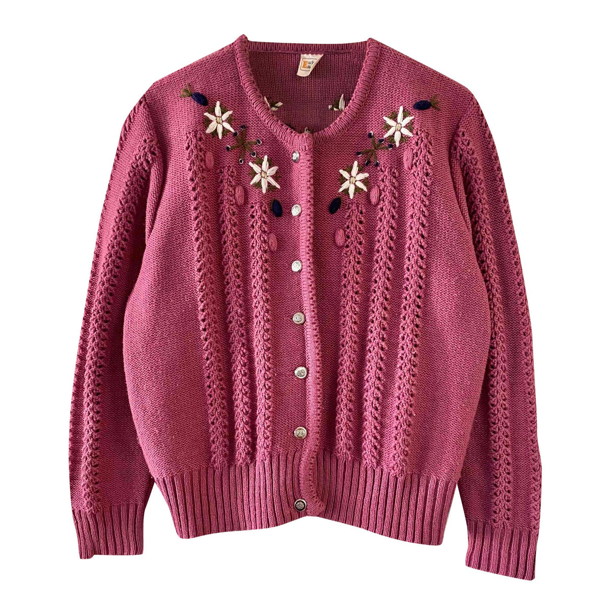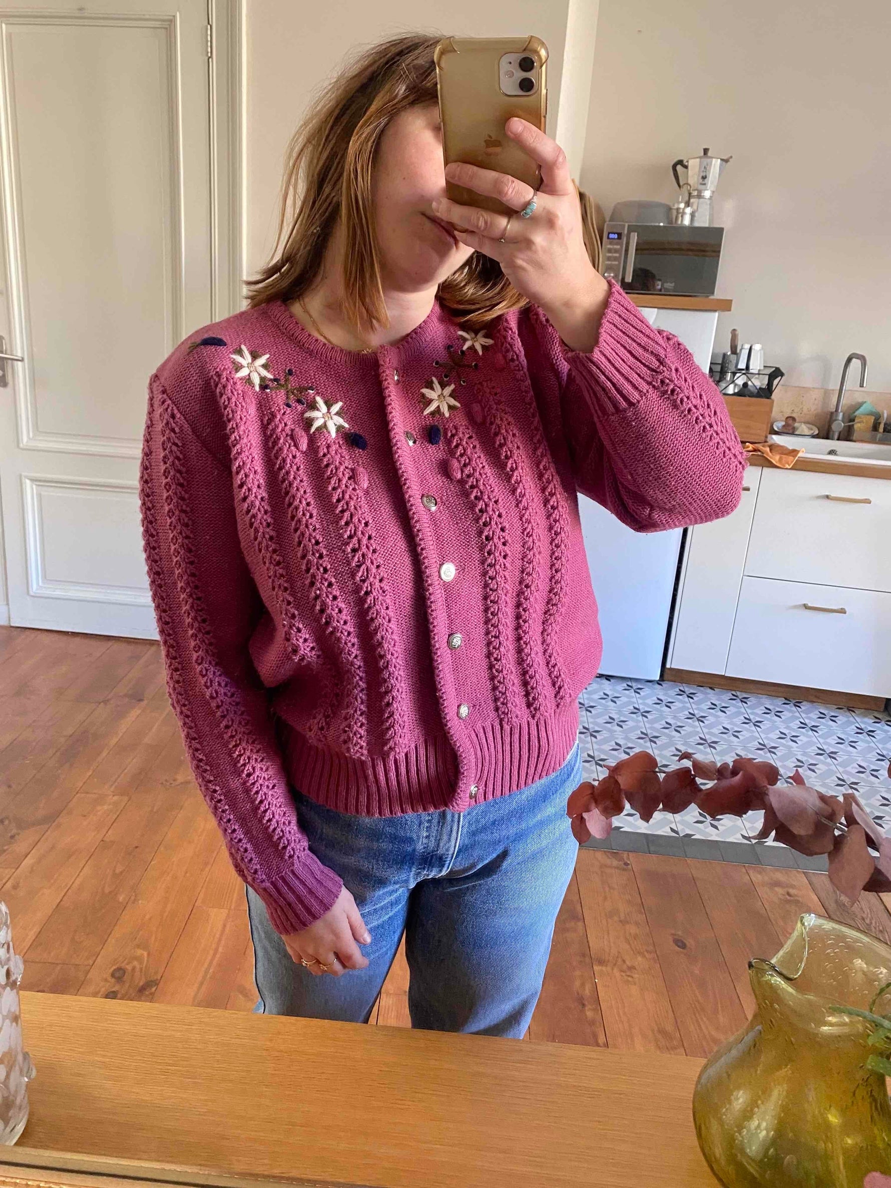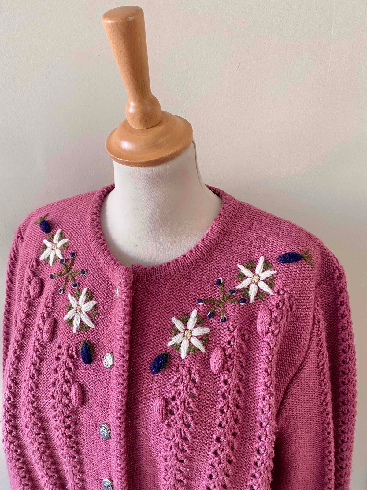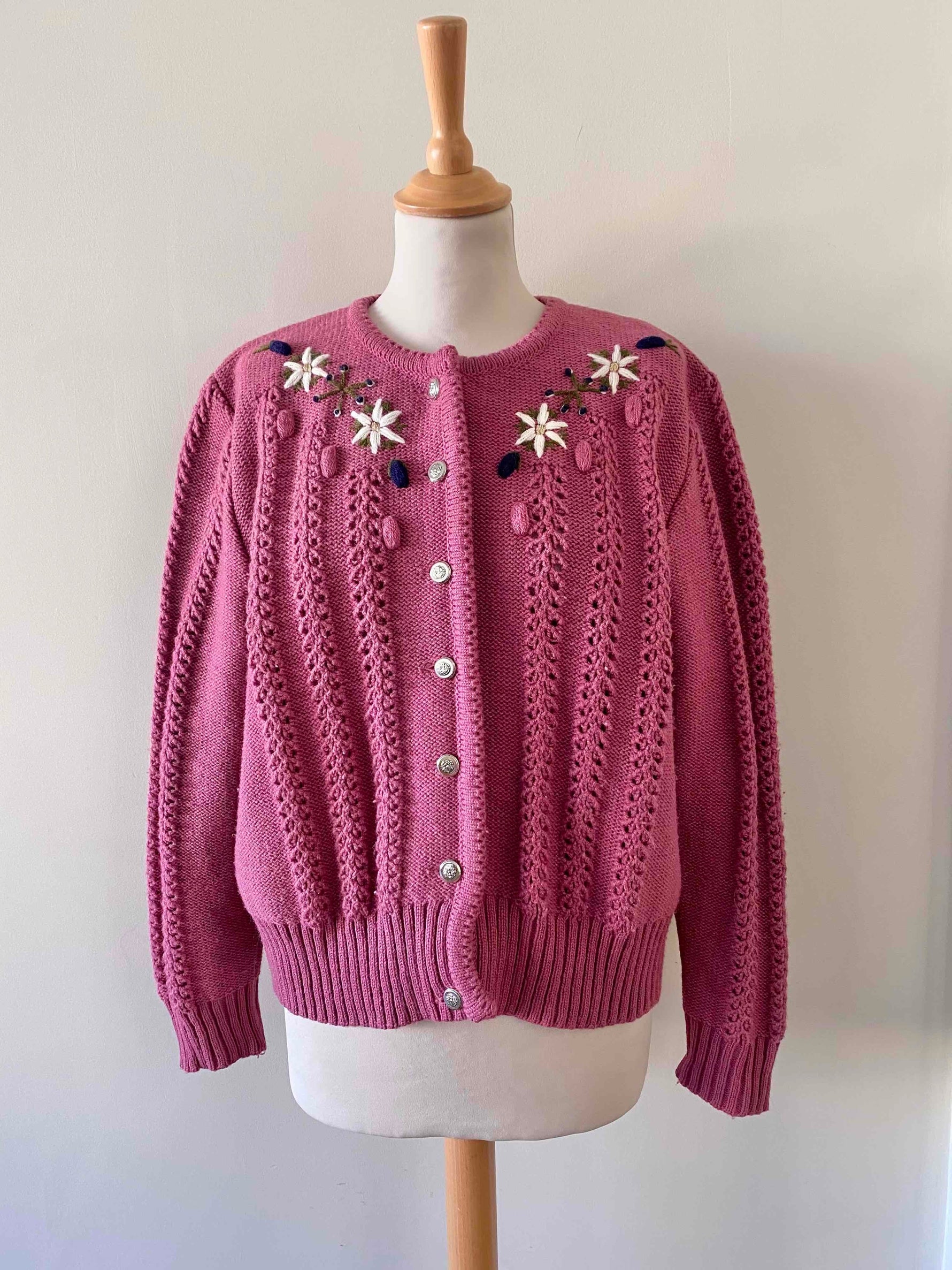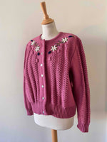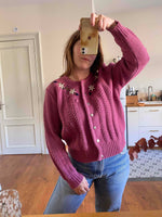 Prix unitaire parCardigan autrichien en laine mélangée acrylique bois de rose brodé de fleurs blanches,bleues et dorées.