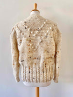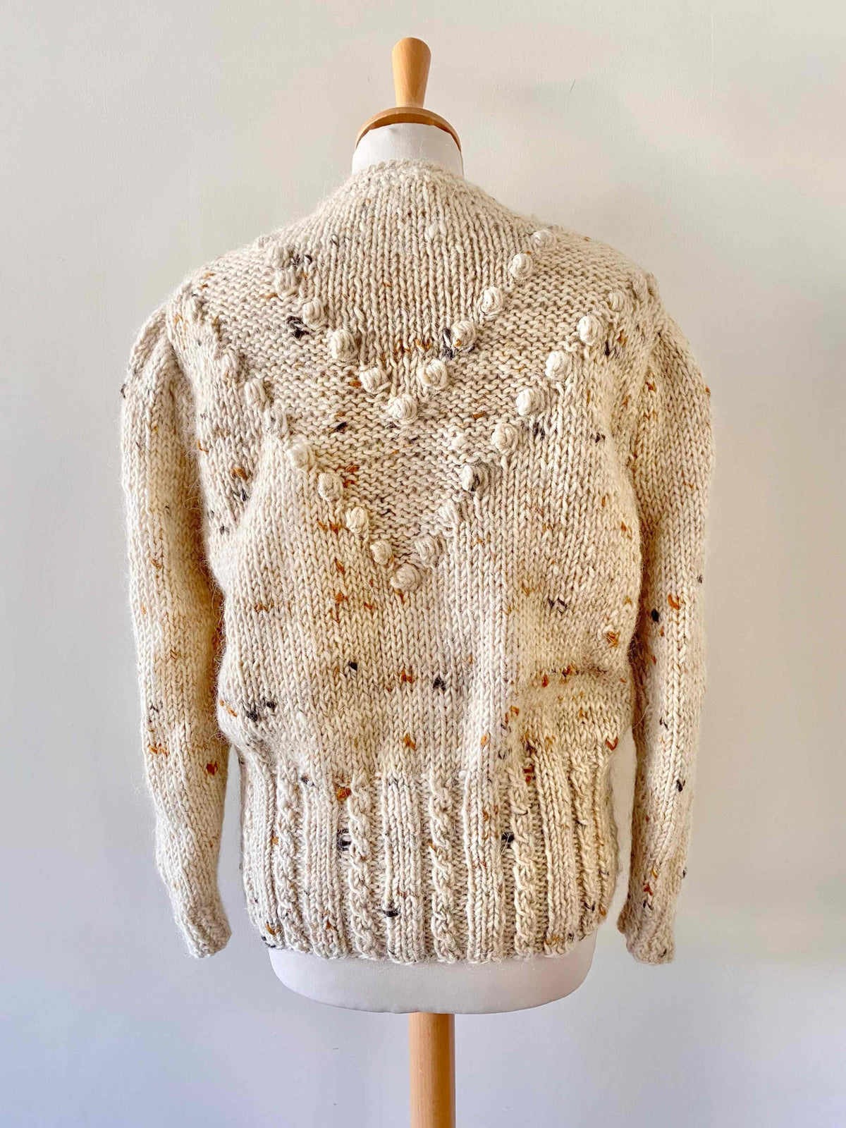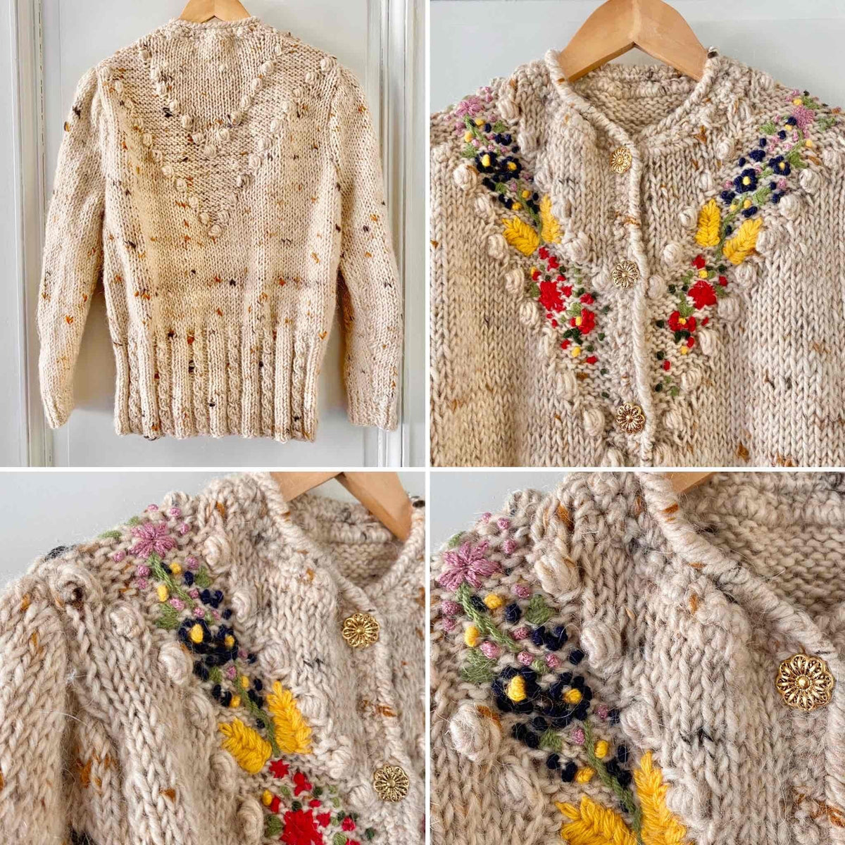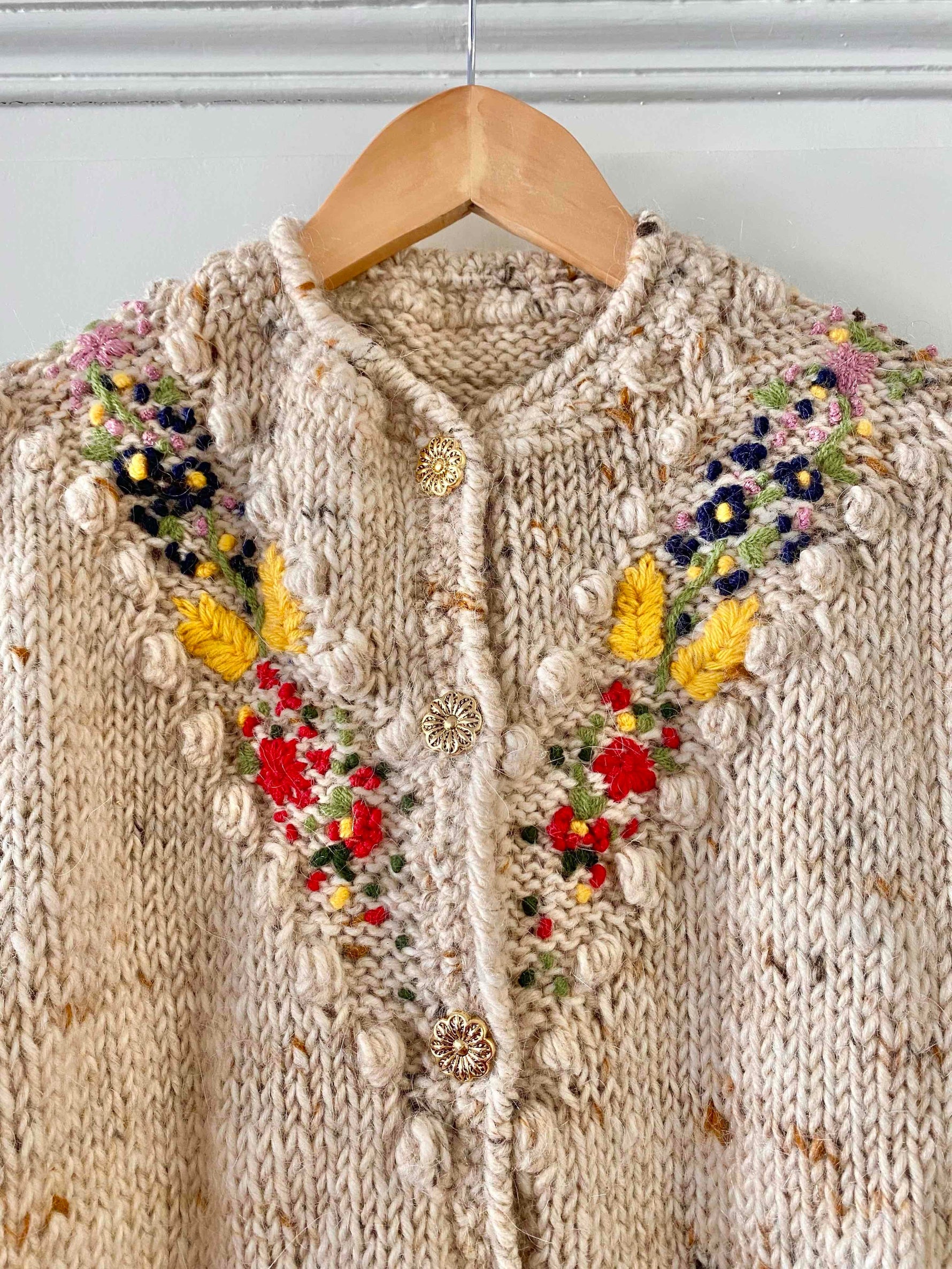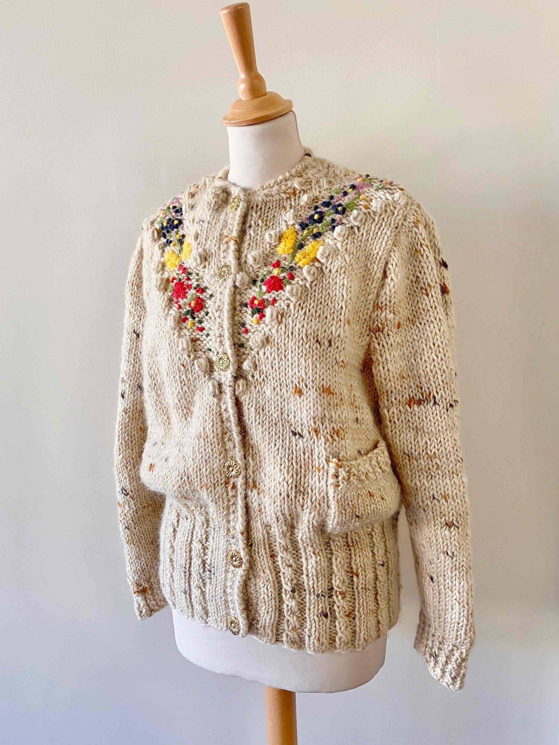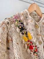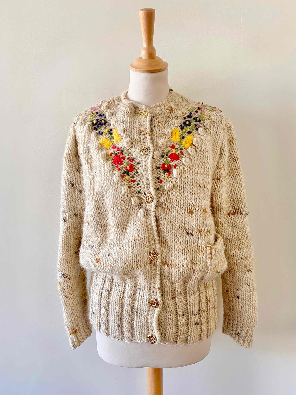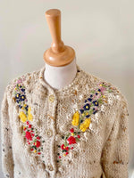 Prix unitaire parCardigan autrichien en pure laine écrue chinée beige, camel et brodé de fleurs multicolores jaunes, rouges, vertes roses et lurex doré, manches ballons torsadées, boutons bijoux marguerites dorées, tricoté à la main en Autriche.
