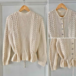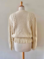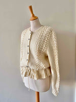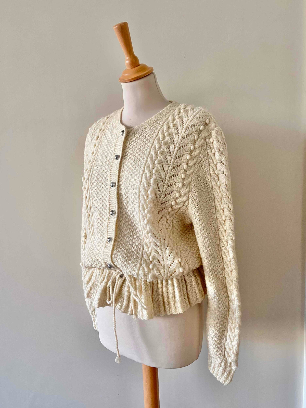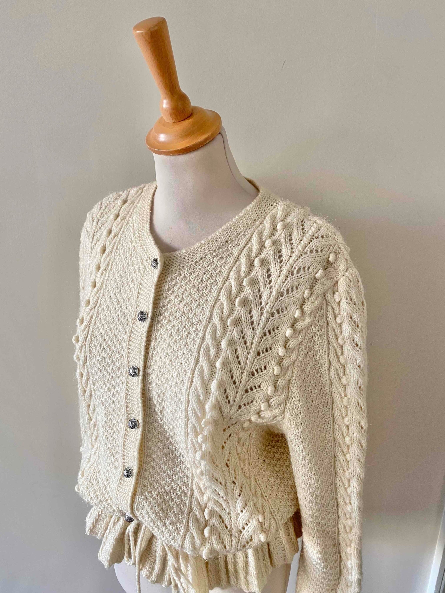Prix unitaire parCardigan Autrichien en laine et mohair blanc écru, maille travaillée en torsades, ajourée et popcorn pompons brodés, cordon à nouer taille, boutons bijoux argentés, tricoté mains en Autriche.