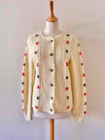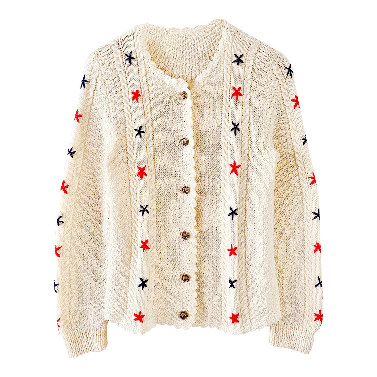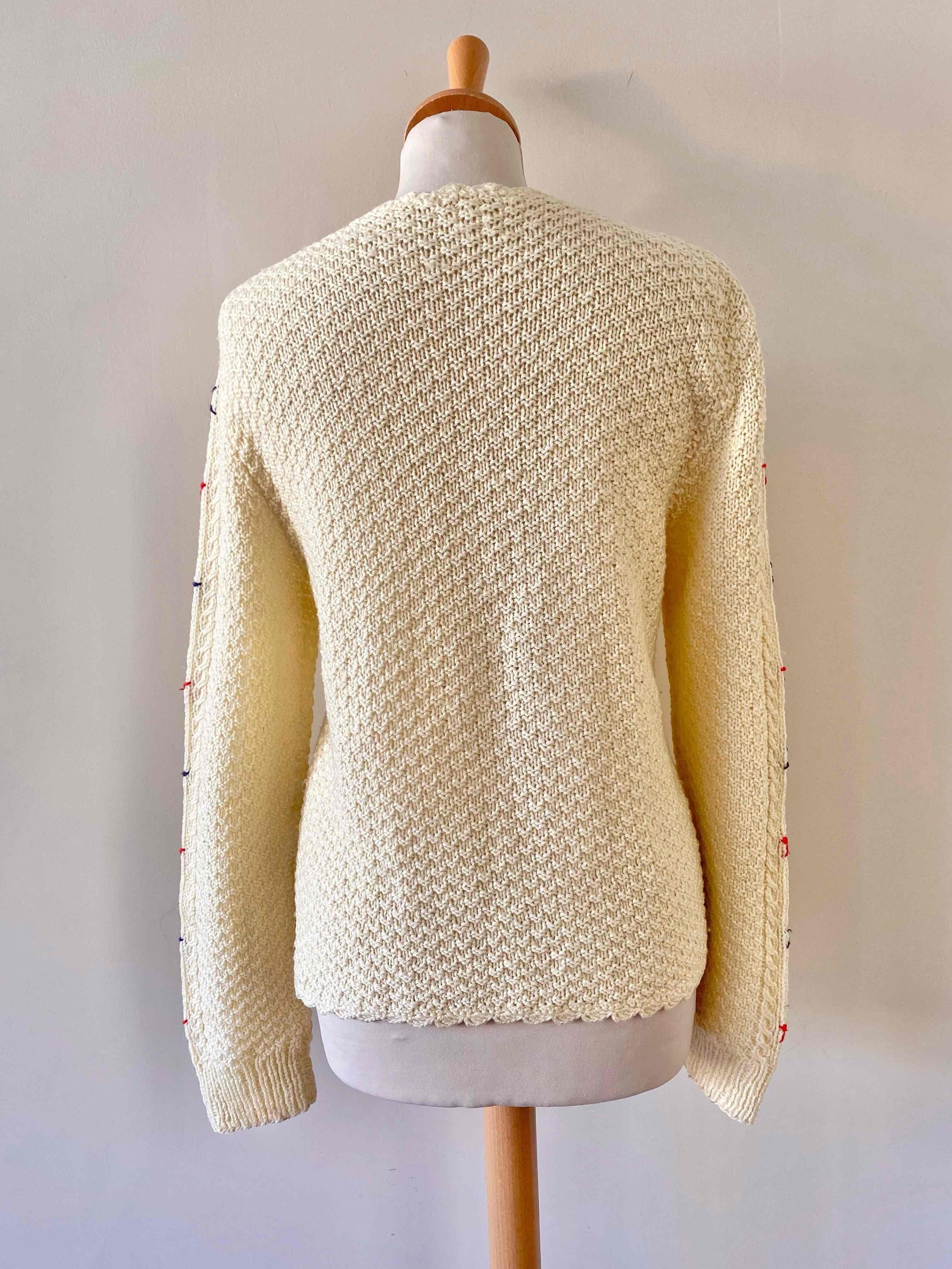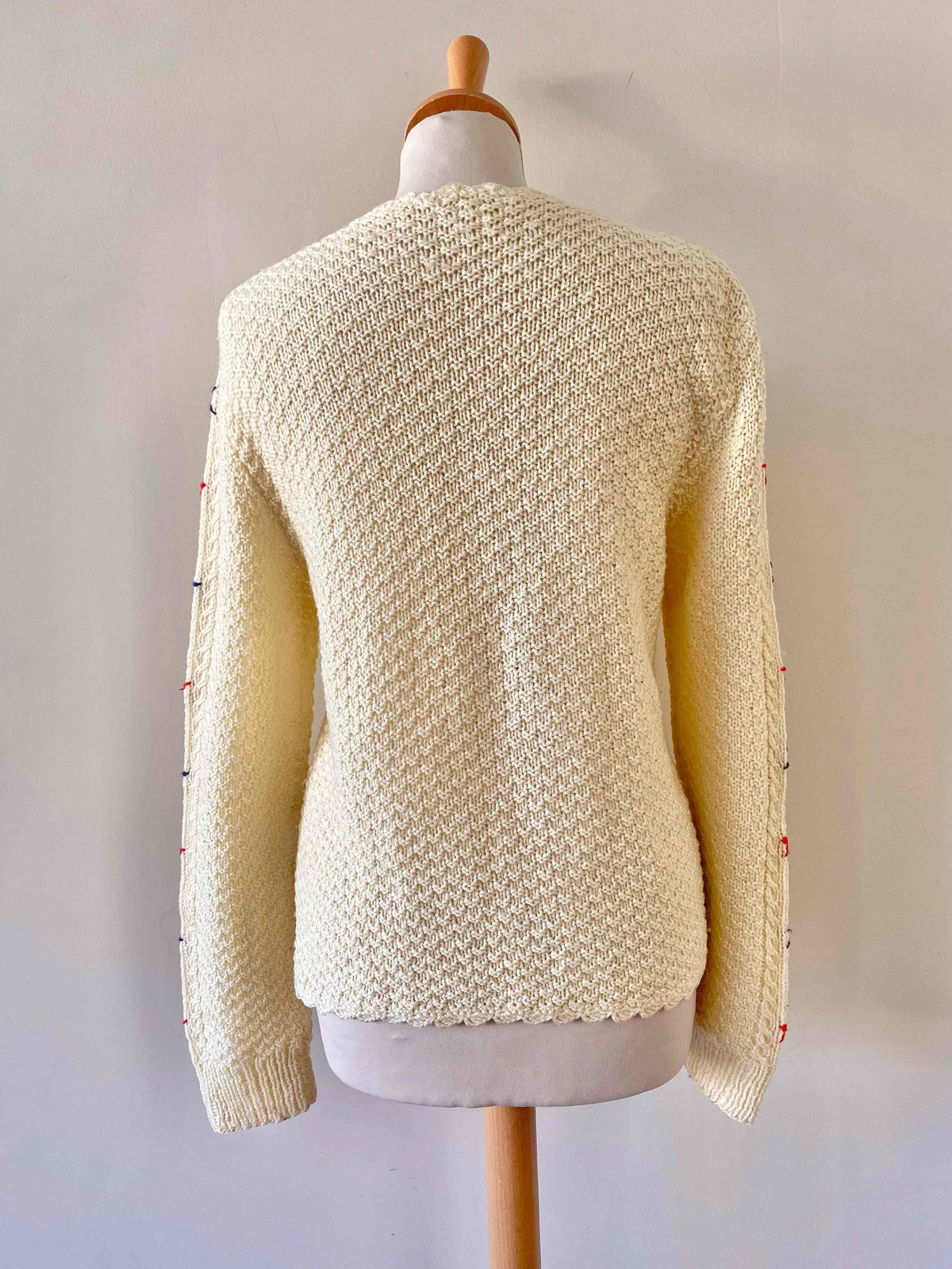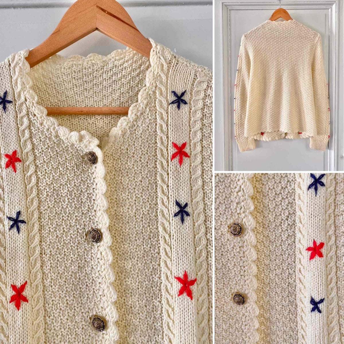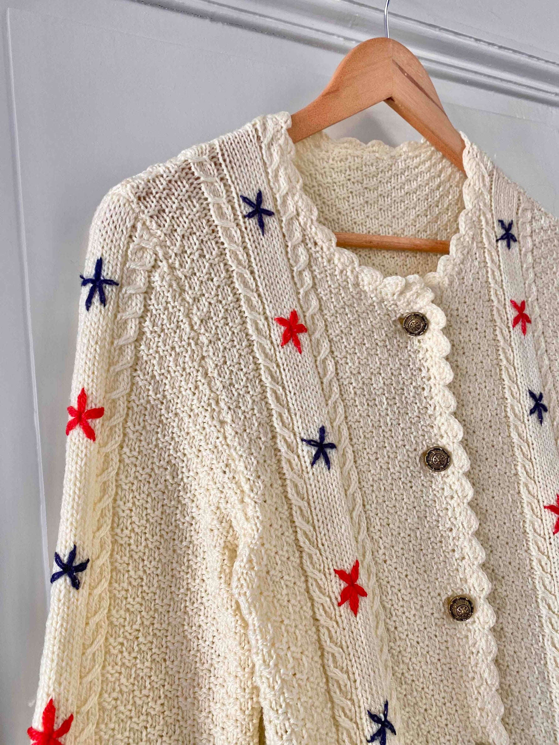 Prix unitaire parCardigan Autrichien en acrylique écrue brodé de fleurs rouges et bleues, boutons bijoux dorés, tricoté et brodé mains en Autriche.