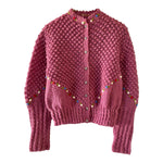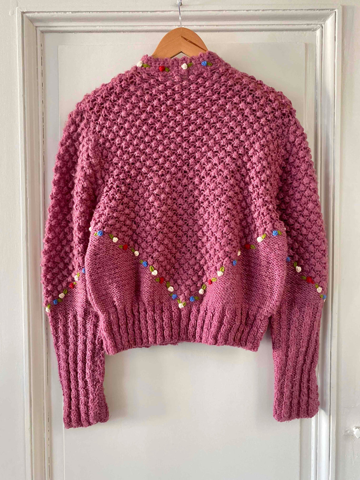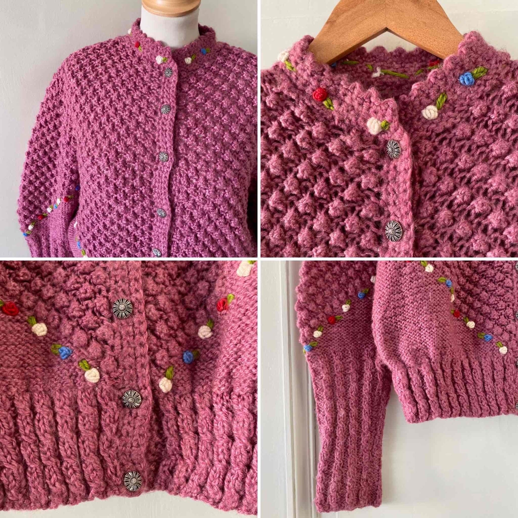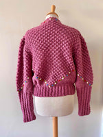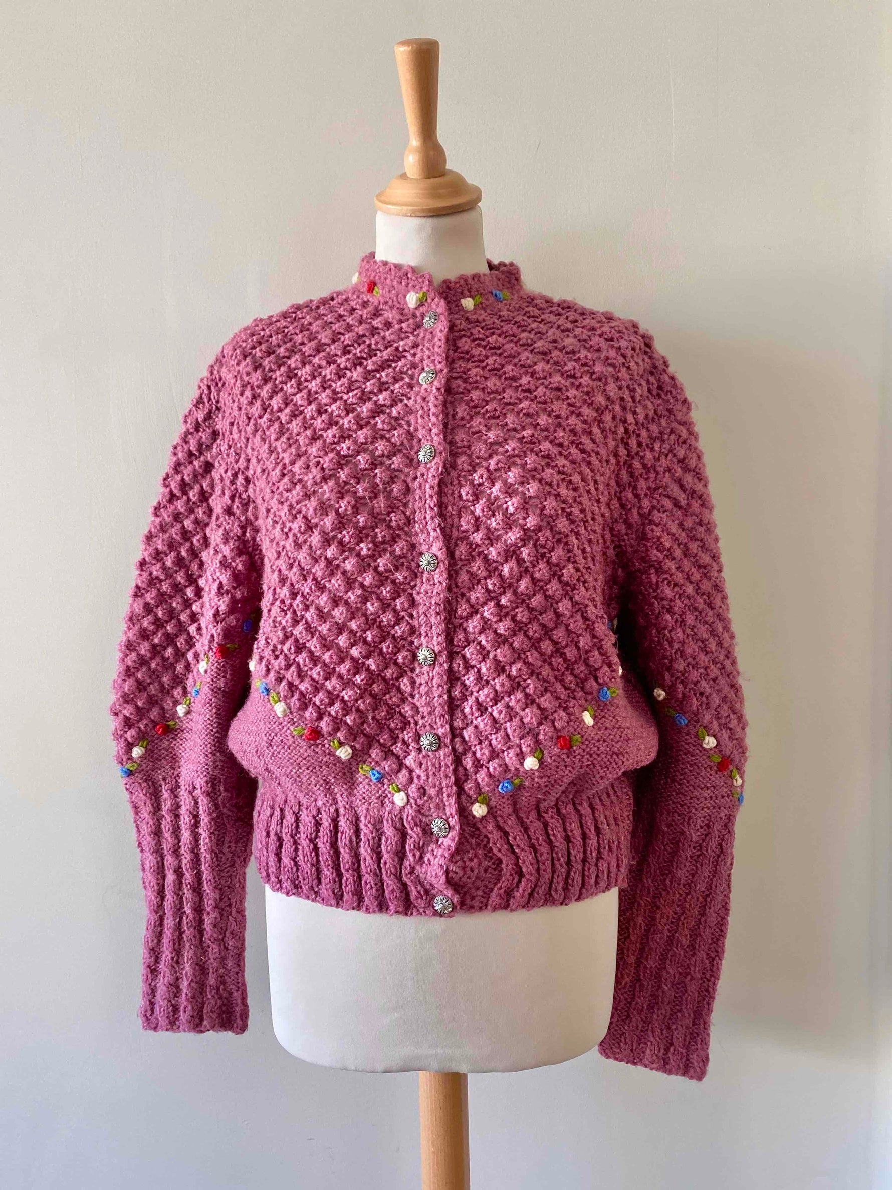 Cardigan Autrichien en laine bois de rose lilas maille popcorn pompons brodés, fleurs rouges, bleues, blanches et vertes brodées, manches ballons brodées, boutons bijoux argentés fleuris, tricoté et brodé mains en Autriche.