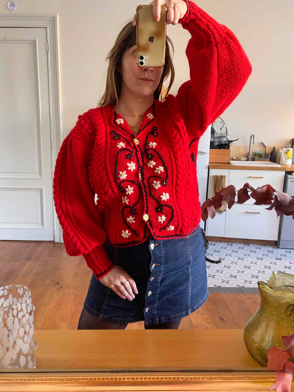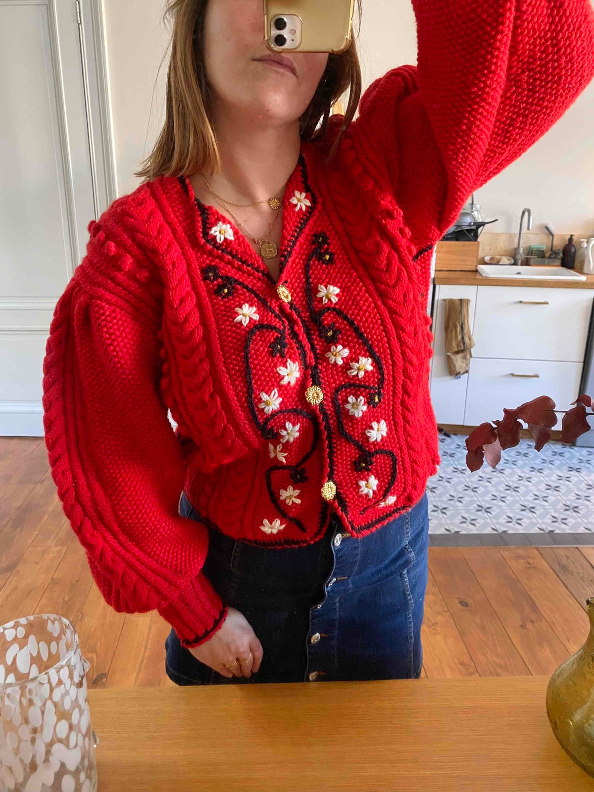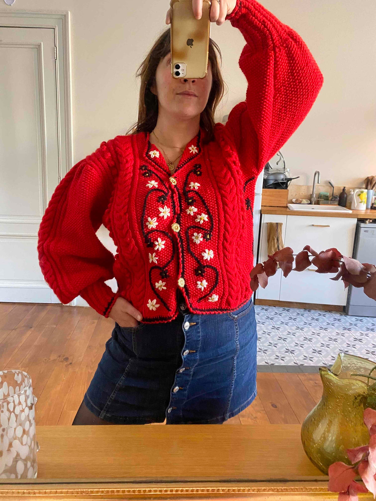 En laine rouge vermillon, brodé de fleurs noires, blanches et jaunes.