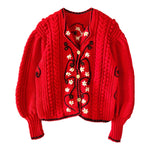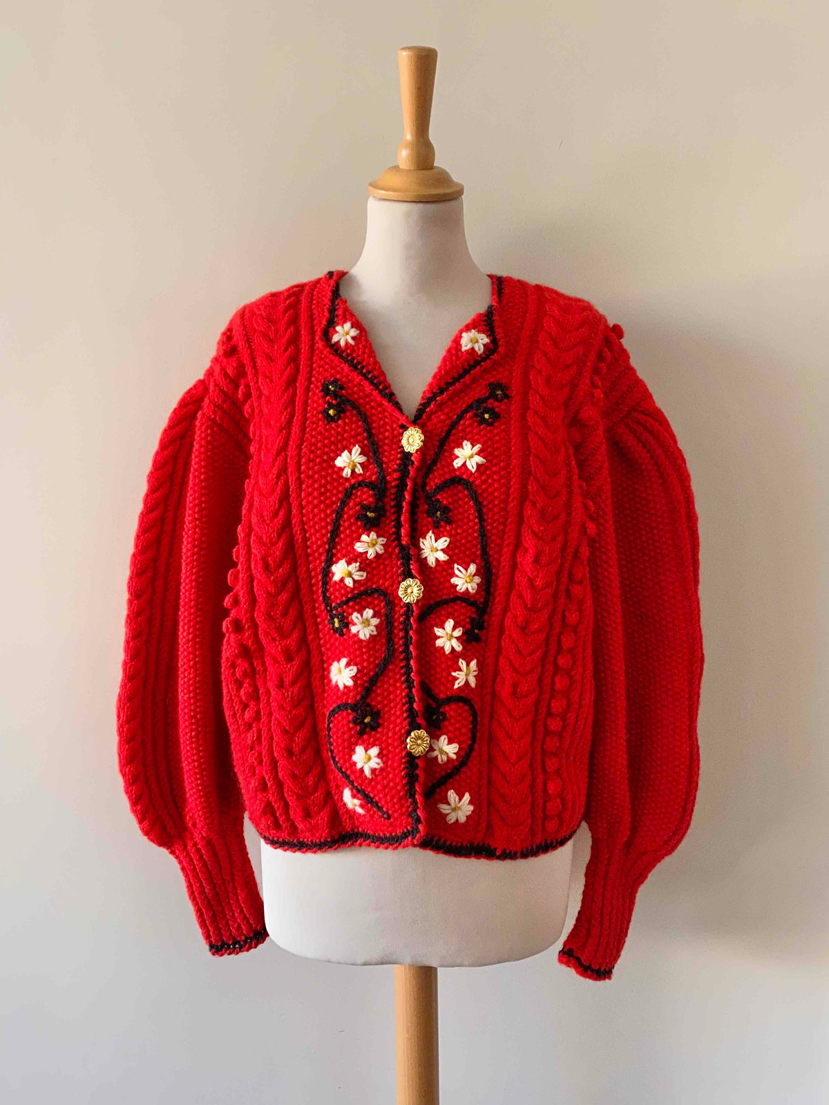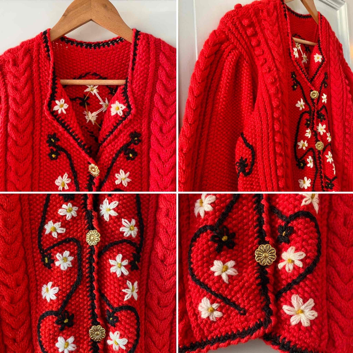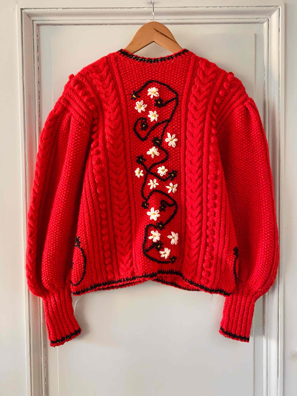 En laine rouge vermillon, brodé de fleurs noires, blanches et jaunes.