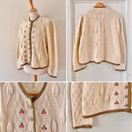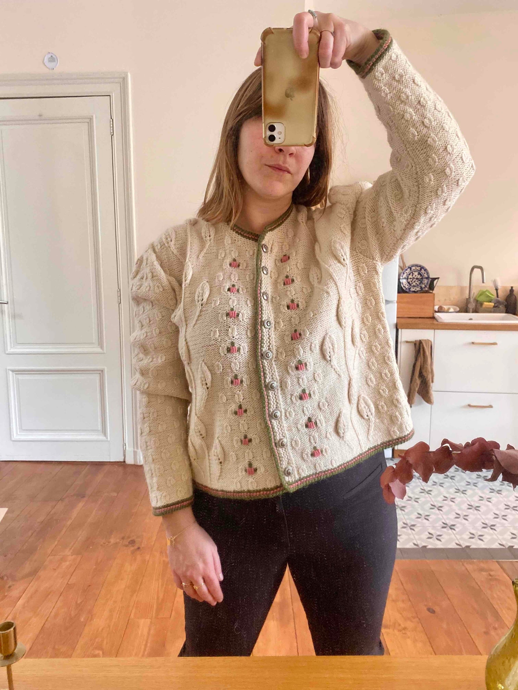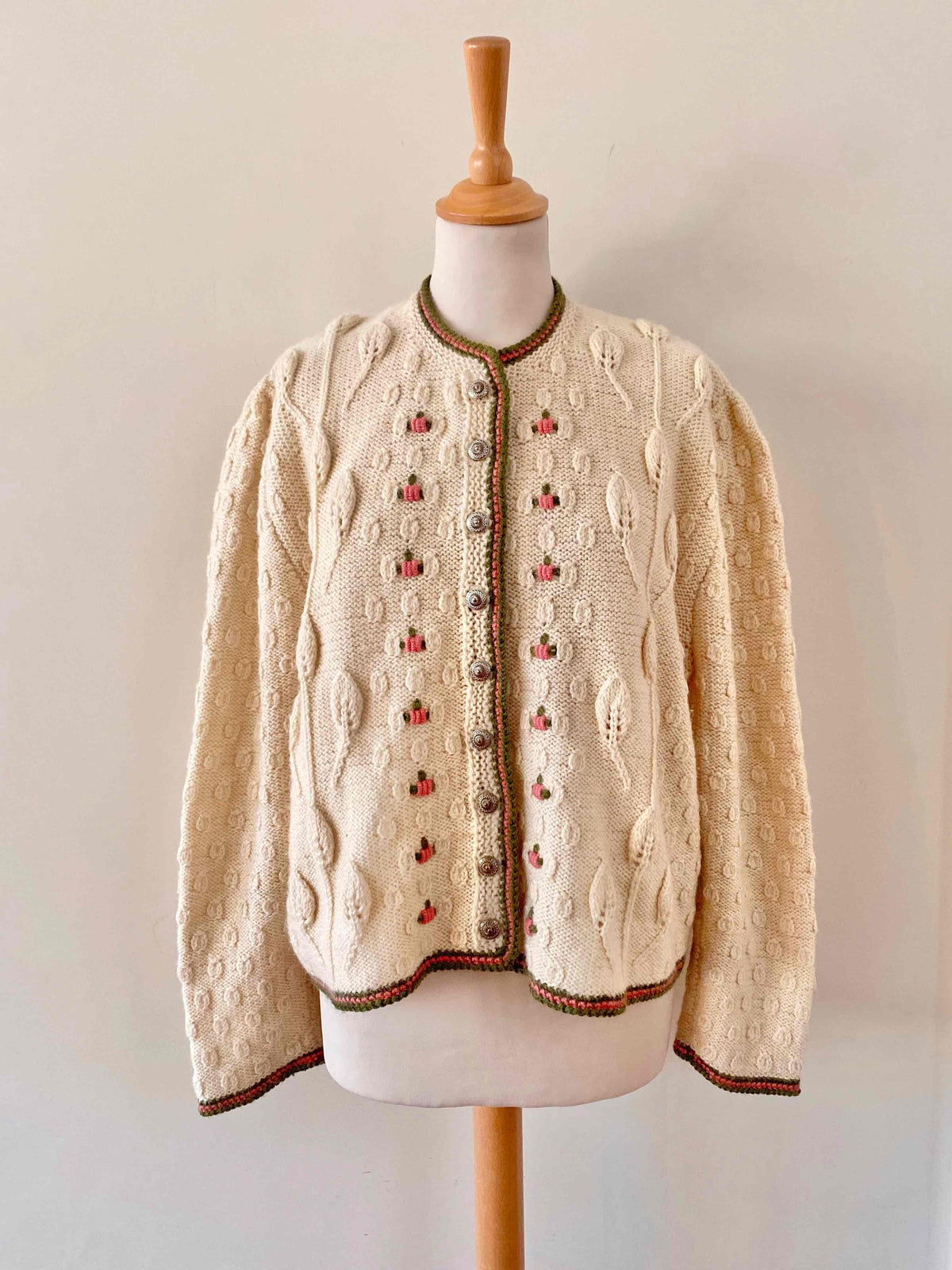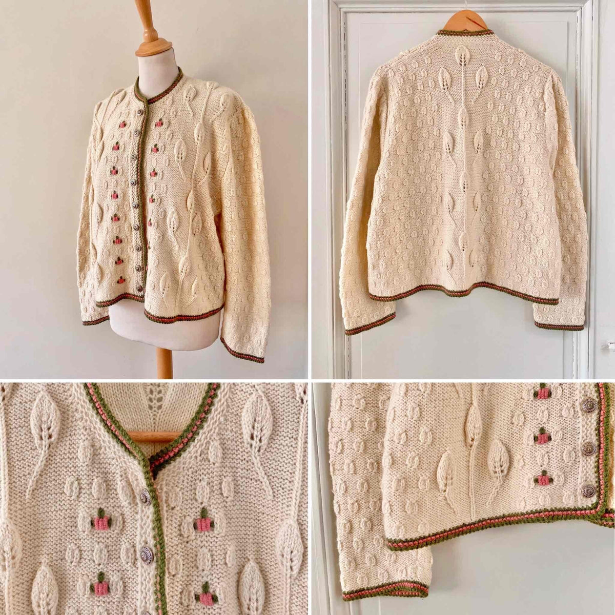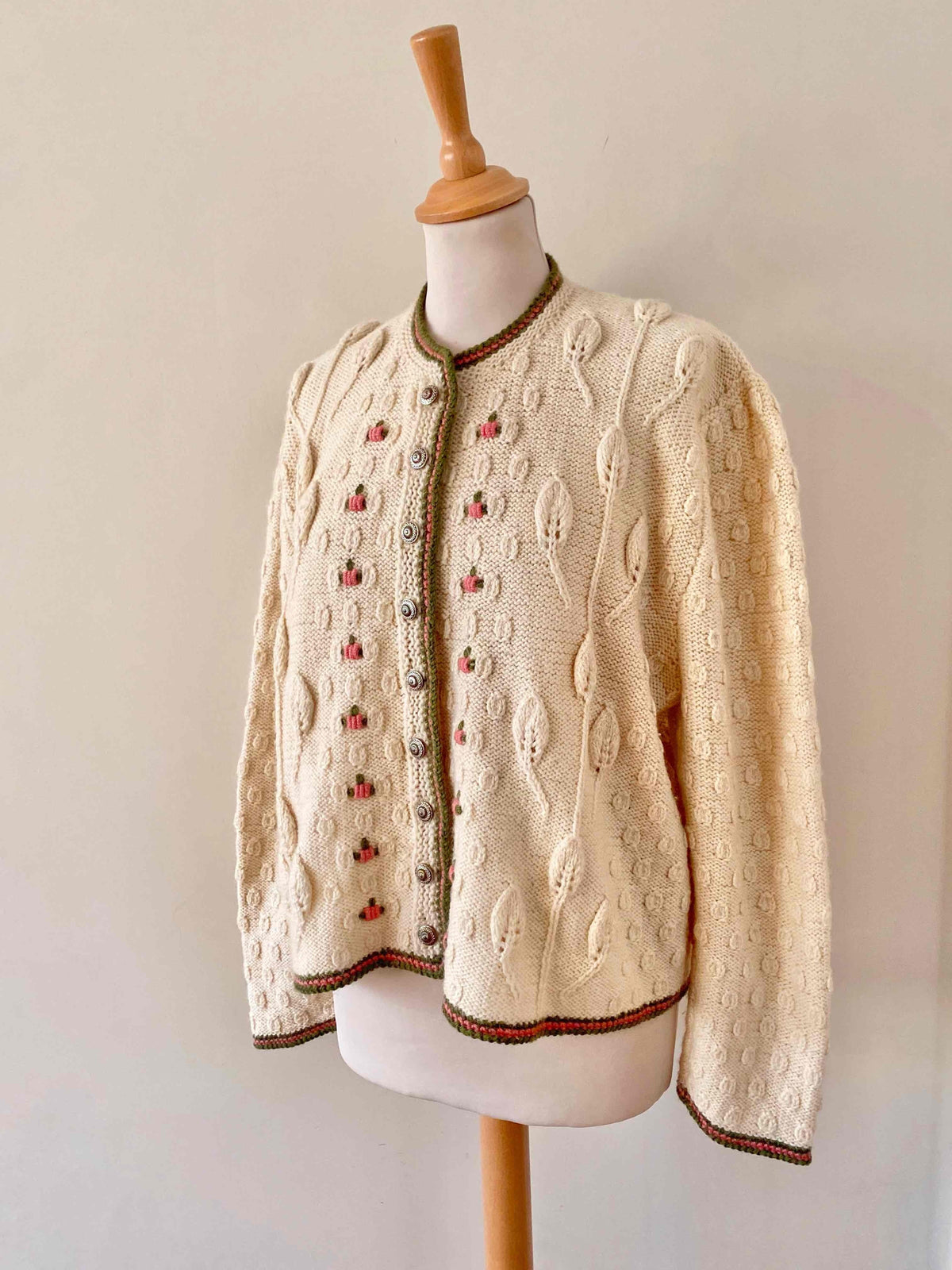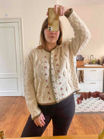 Cardigan autrichien en pure laine maille torsadée, popcorn pompons brodés et feuillages, brodé de fleurs roses pastels et vert prairie, boutons bijoux argentés fleuris, forme boîte, taille 38/40 porté ici sur un mannequin T36 et une personne T40.