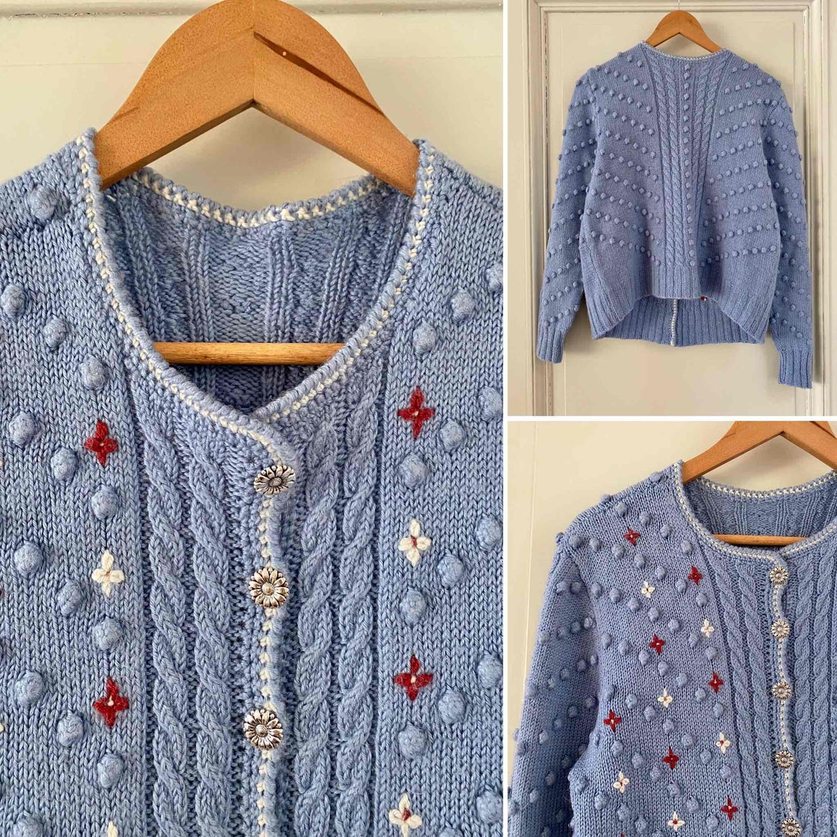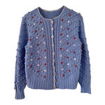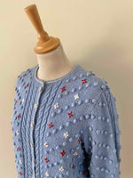 Maille popcorn pompons brodés et brodé de fleurs blanches et rouge terre.