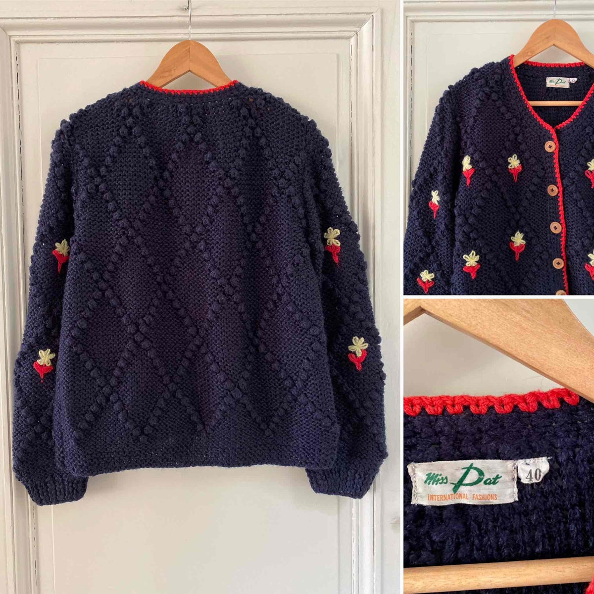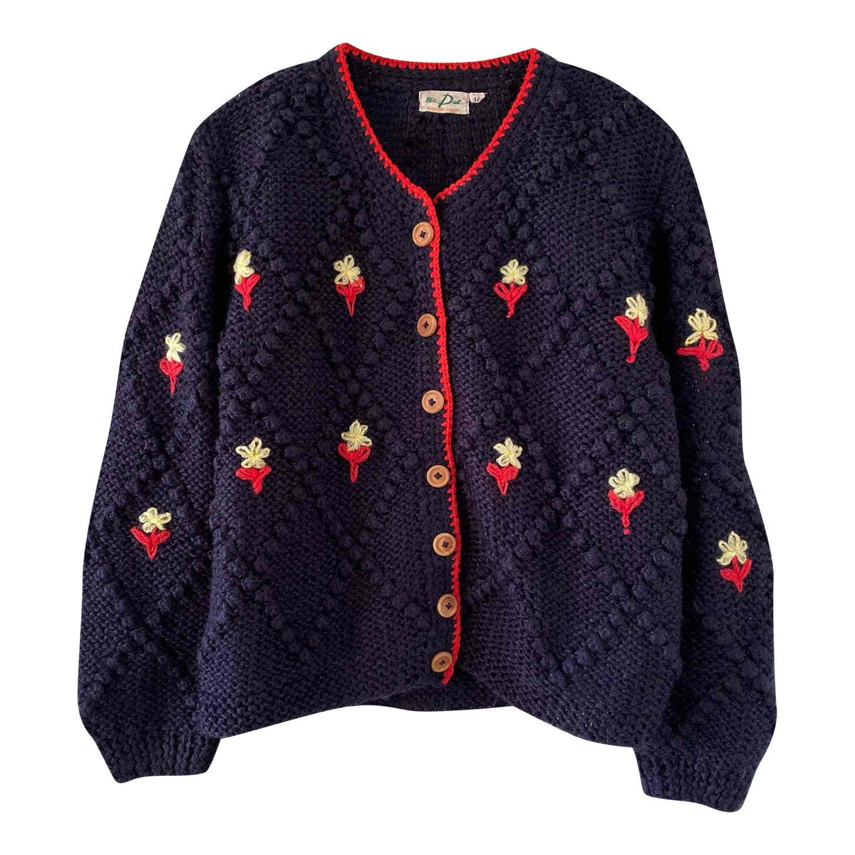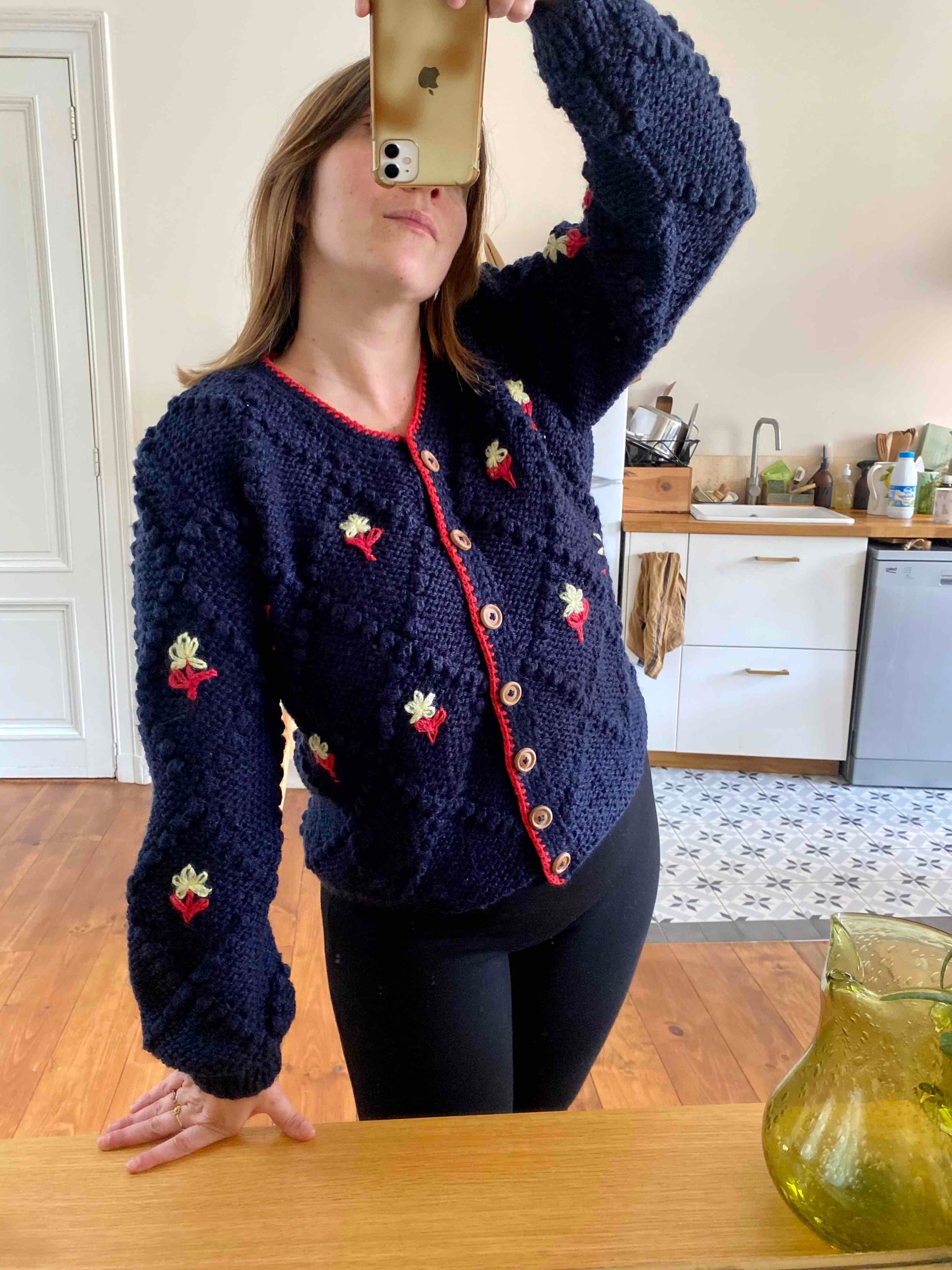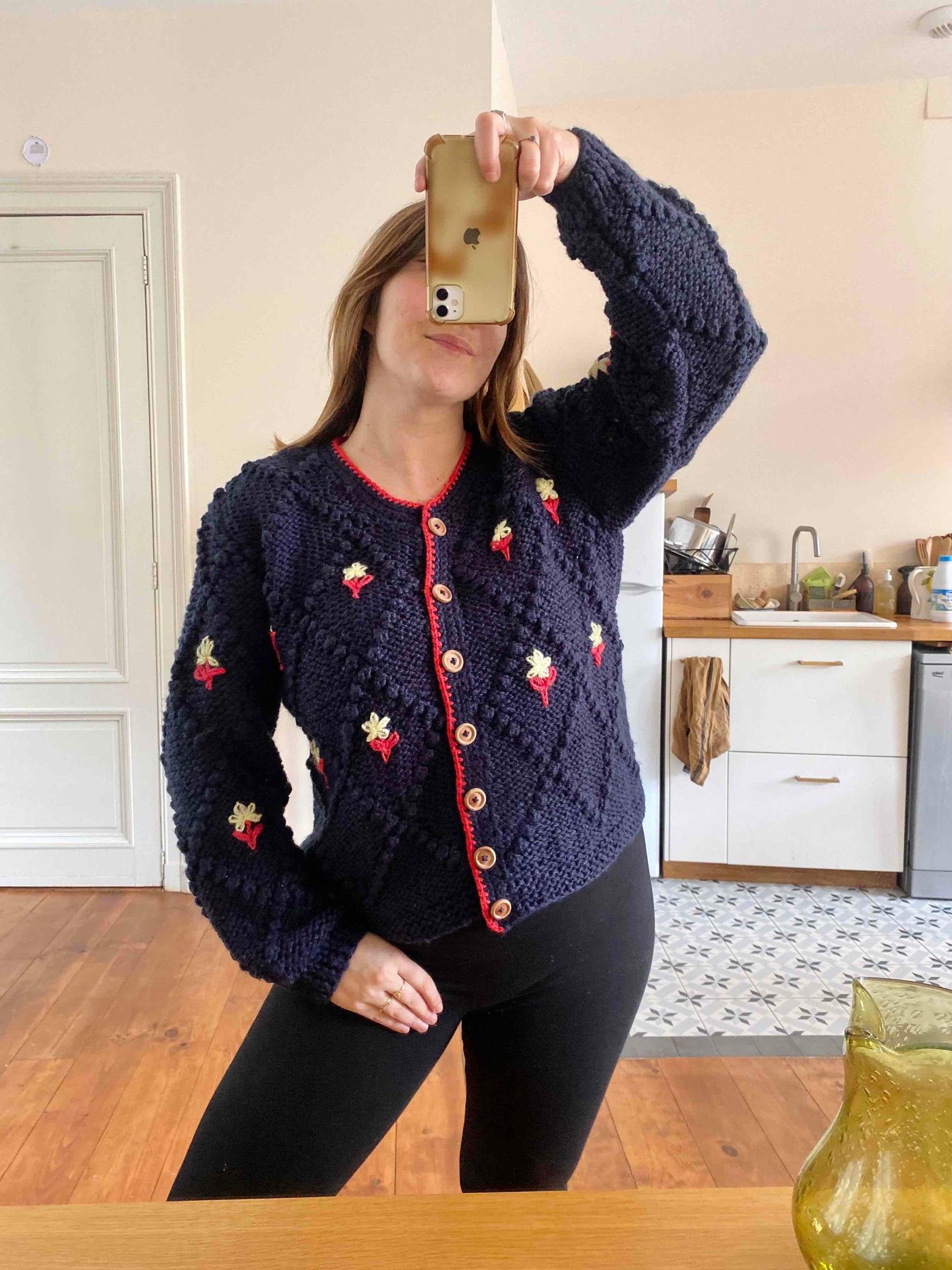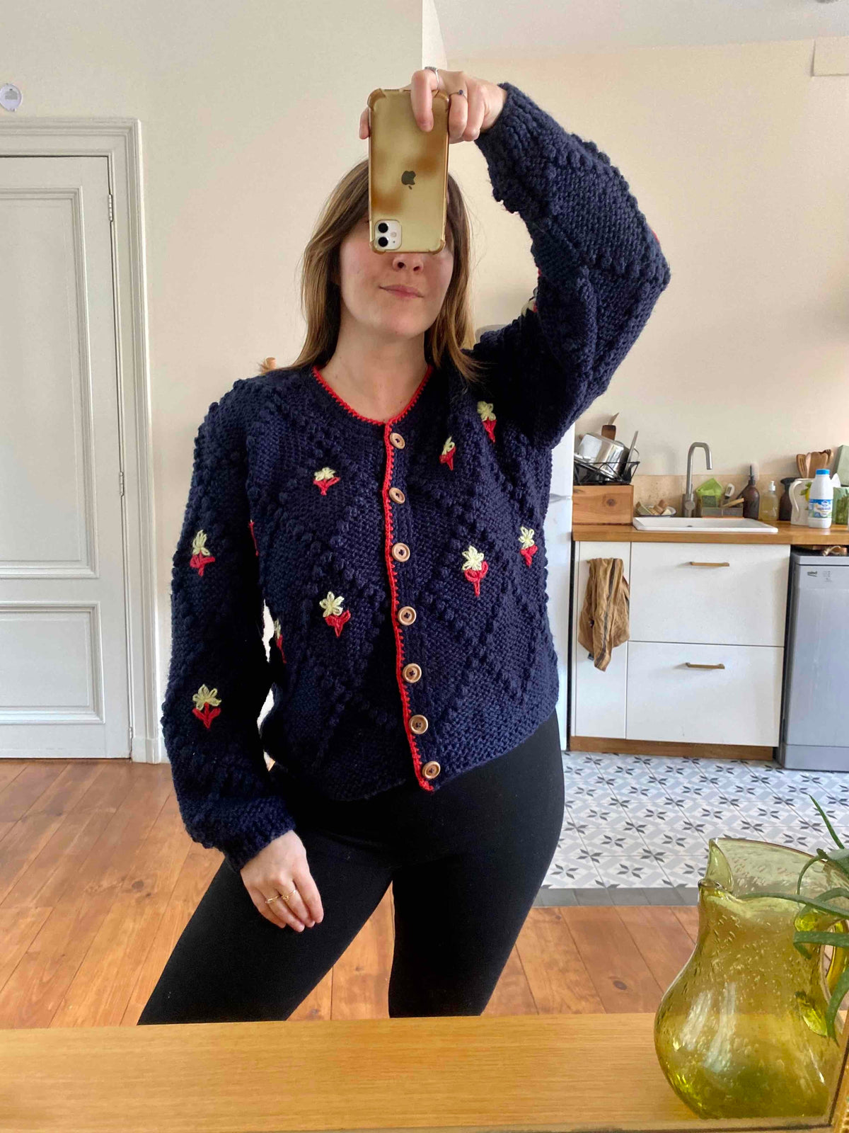 Prix unitaire parCardigan autrichien en laine mélangée acrylique bleu nuit presque noir brodé de fleurs jaunes citron pastel et rouges, maille popcorn pompons brodés, boutons en bois, taille 40 porté ici sur un mannequin T36 et une personne T40, fabriqué en Autriche.