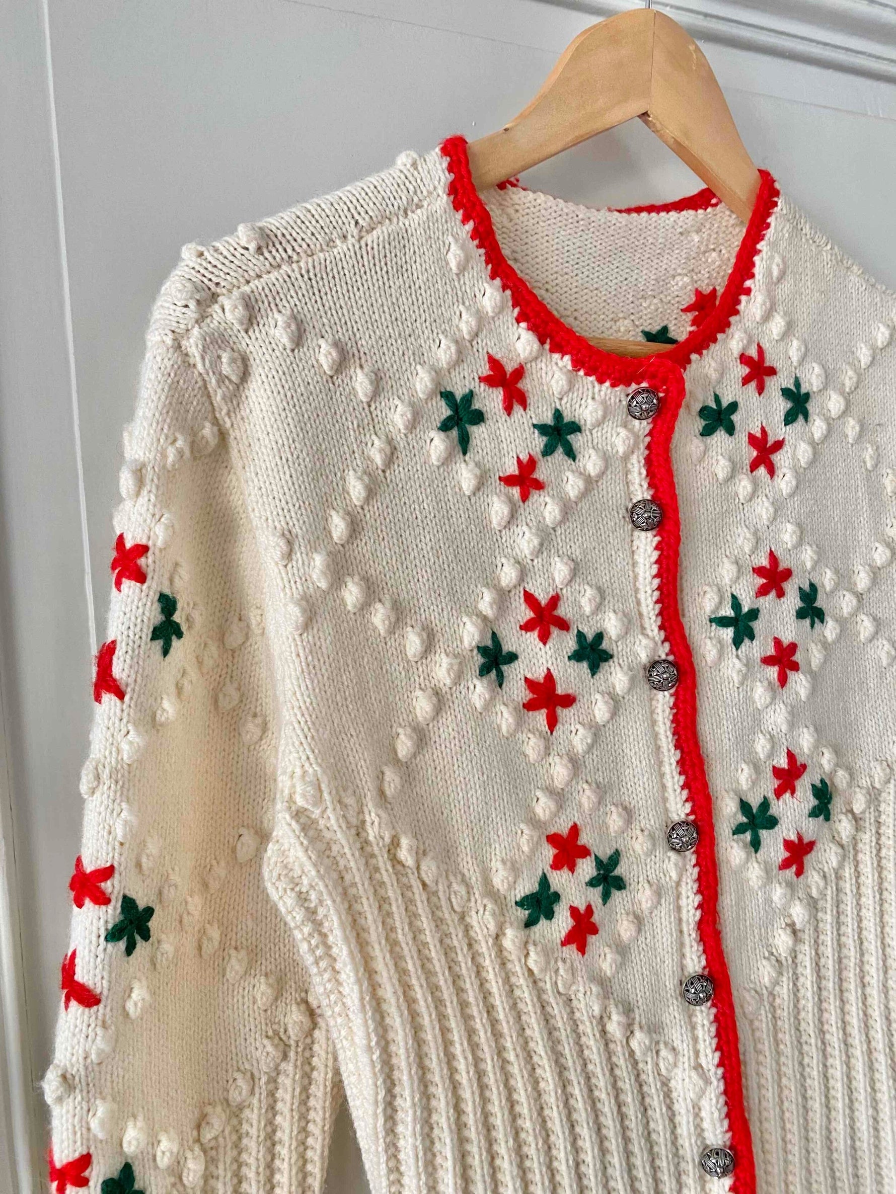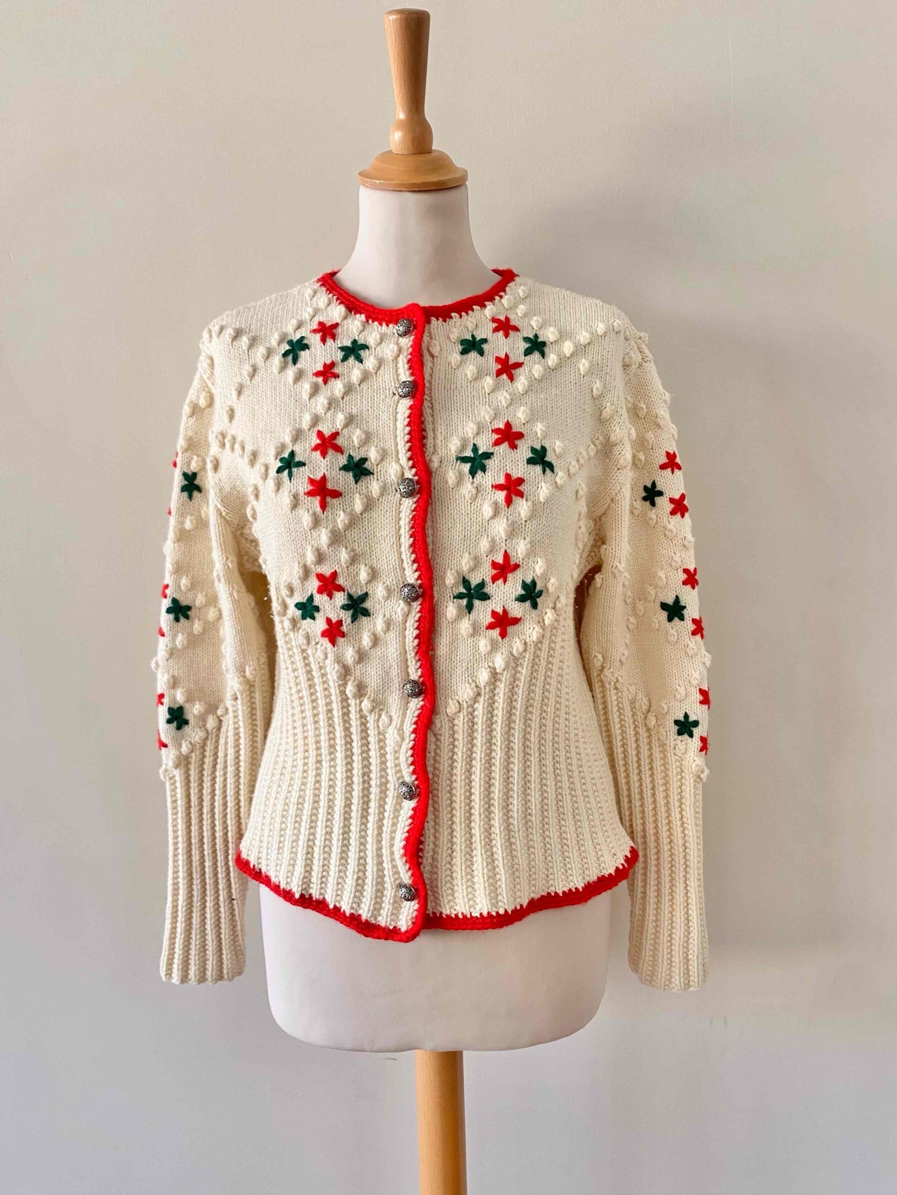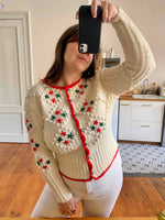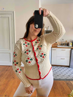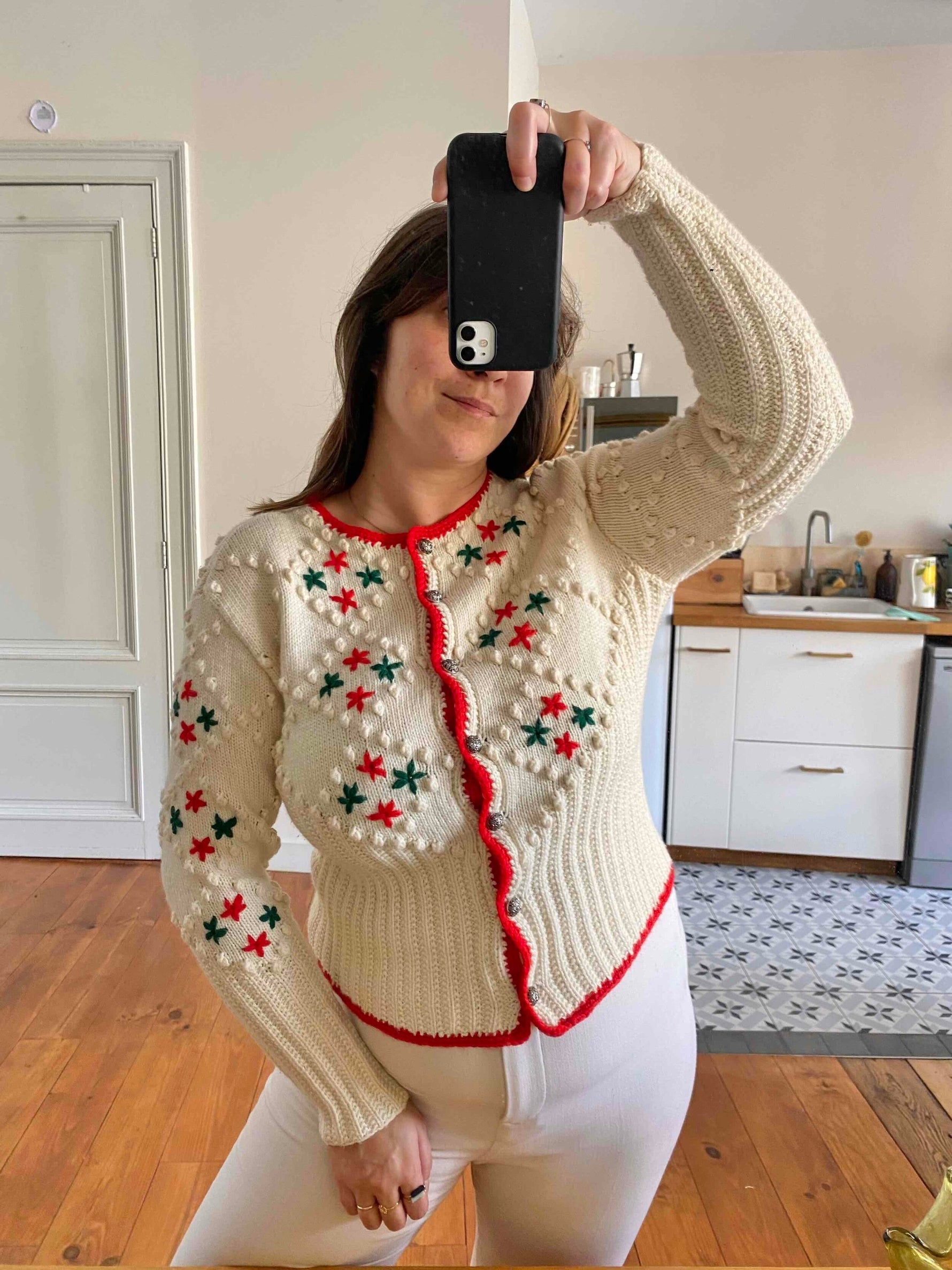 Prix unitaire parCardigan Autrichien en laine mélangée écrue, bordures liseré rouge vermillon, maille popcorn pompons brodés, fleurs brodées rouges et vertes, manches ballons brodées, boutons bijoux argentés fleuris, taille 38 porté ici sur un mannequin T36 et serré sur une personne T40.
