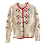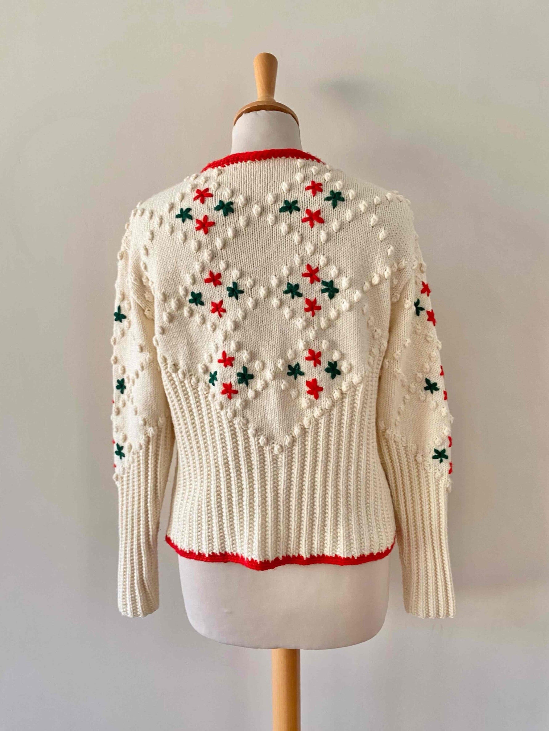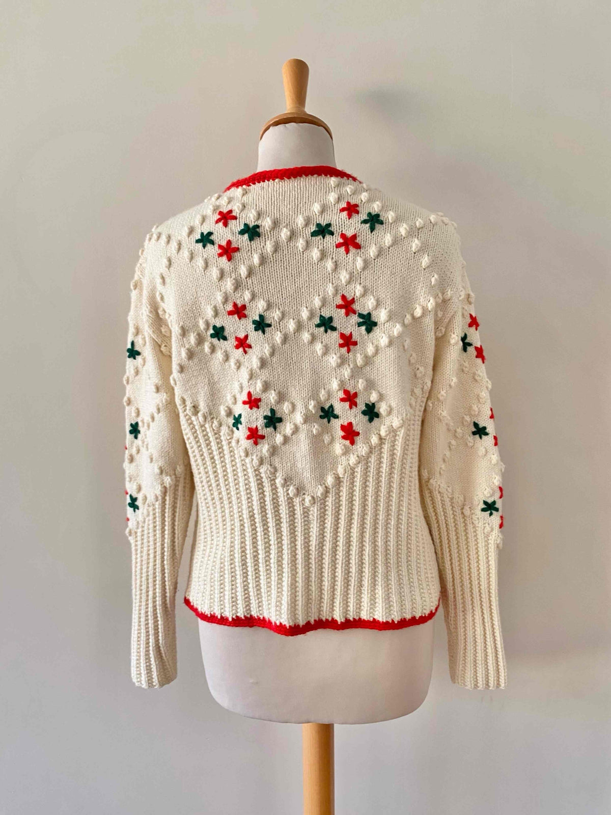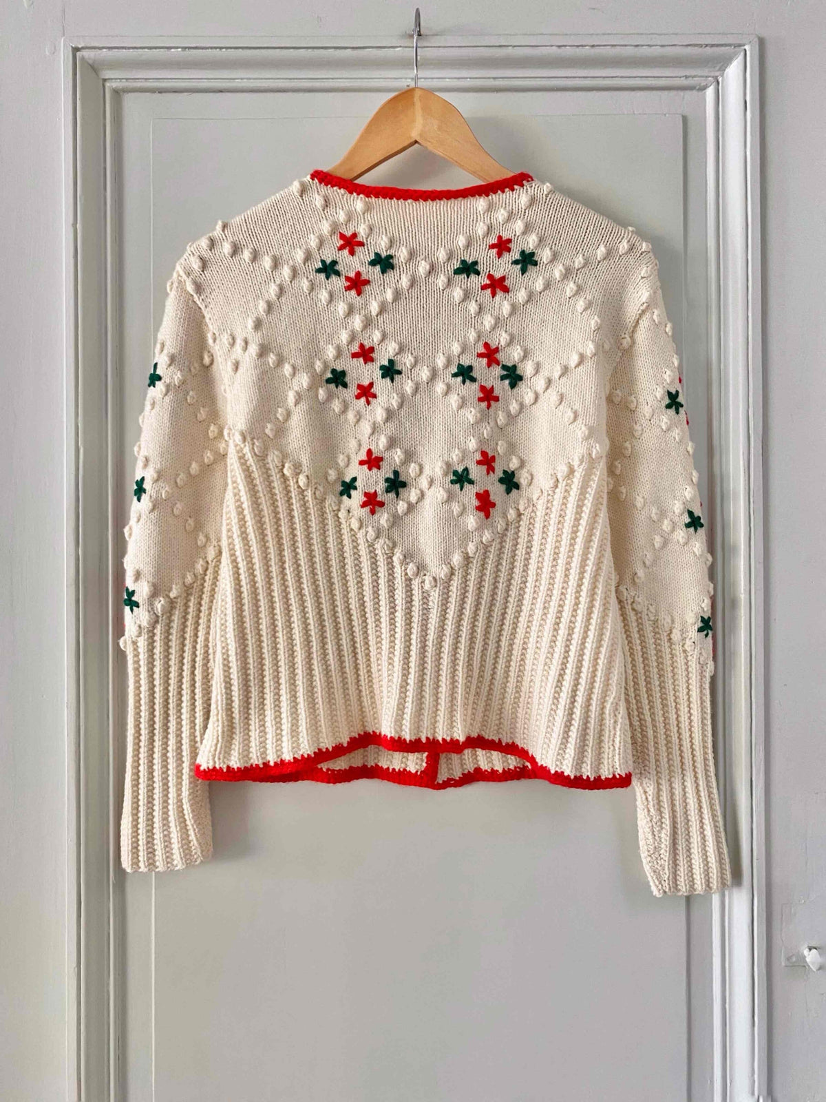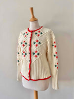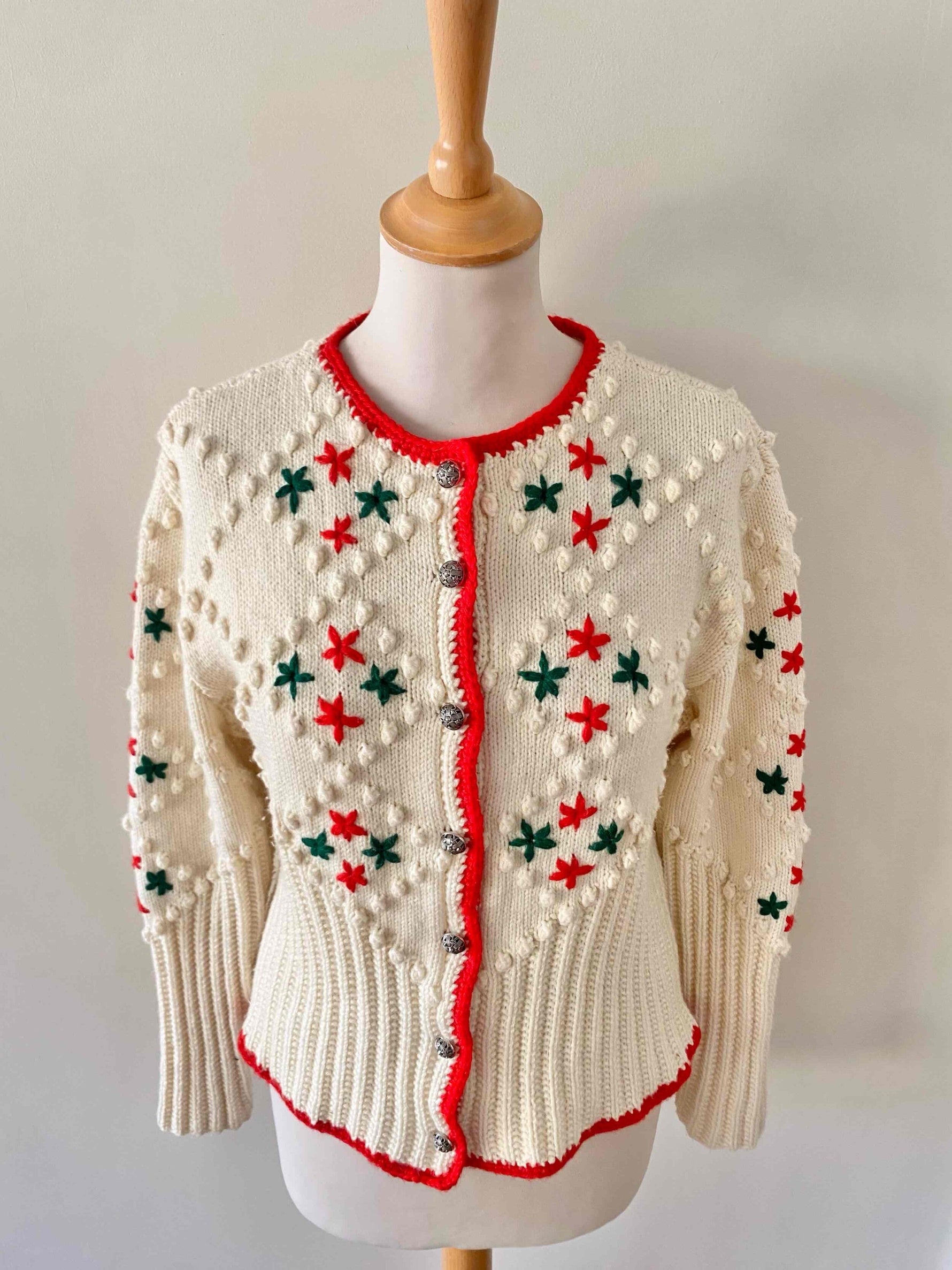 Prix unitaire parCardigan Autrichien en laine mélangée écrue, bordures liseré rouge vermillon, maille popcorn pompons brodés, fleurs brodées rouges et vertes, manches ballons brodées, boutons bijoux argentés fleuris, taille 38 porté ici sur un mannequin T36 et serré sur une personne T40.