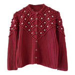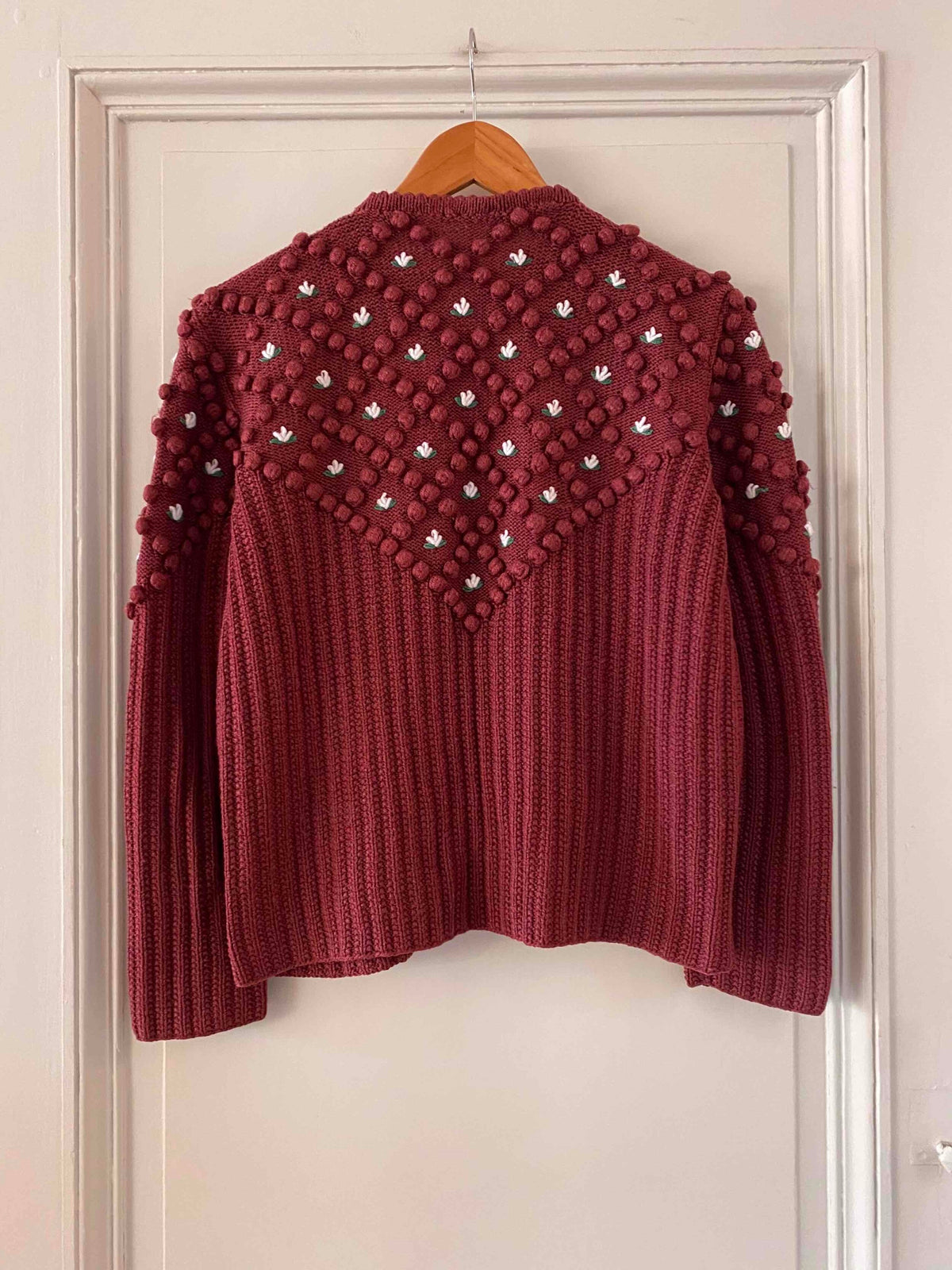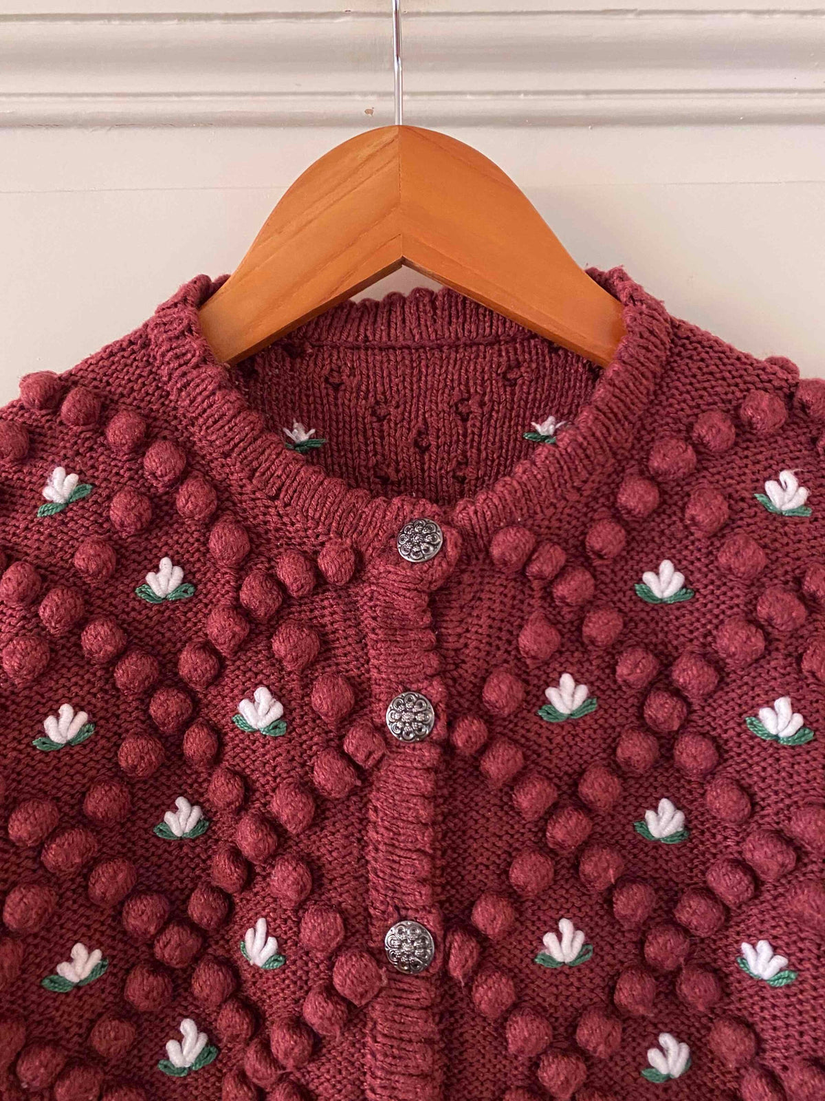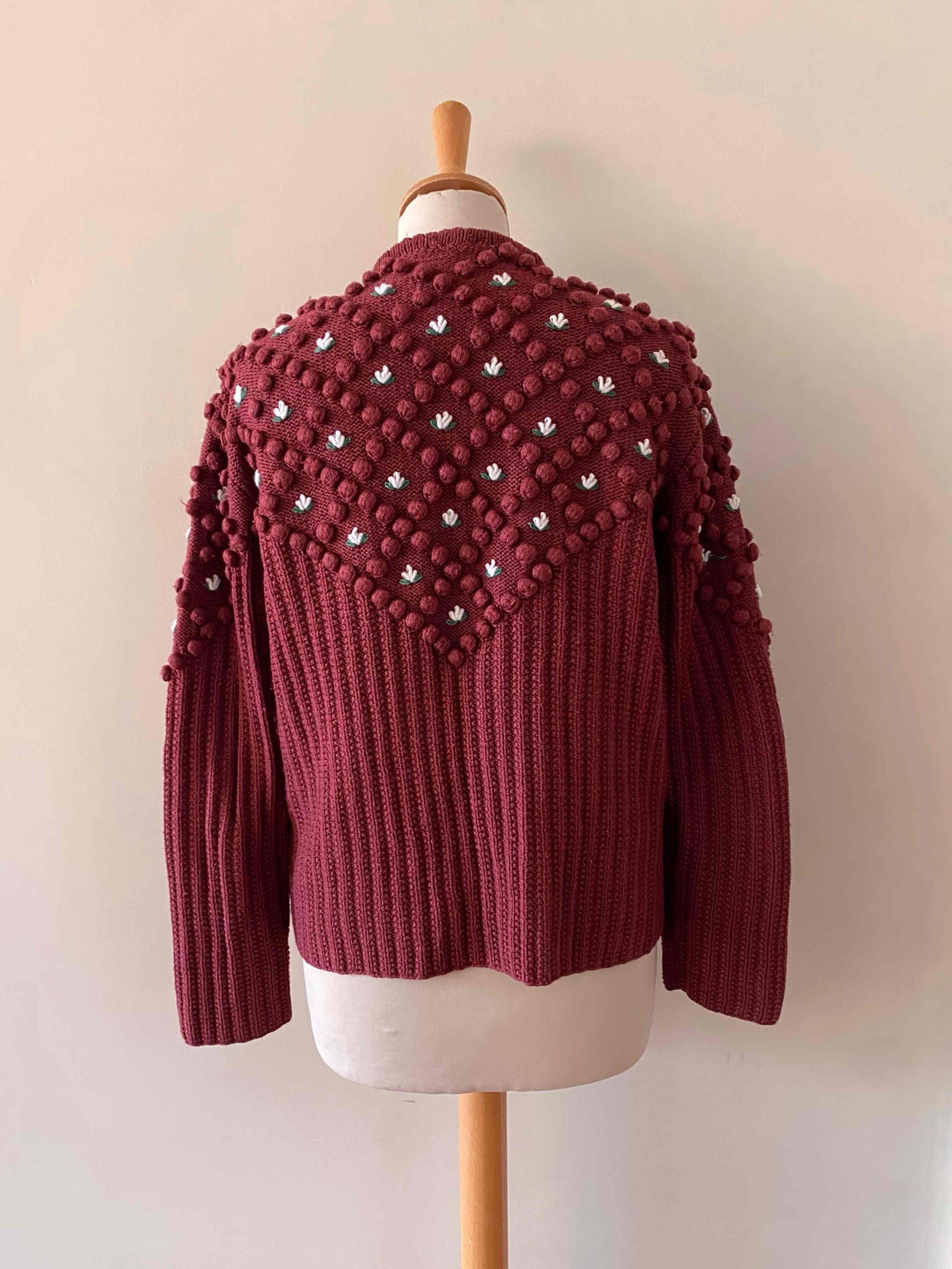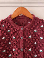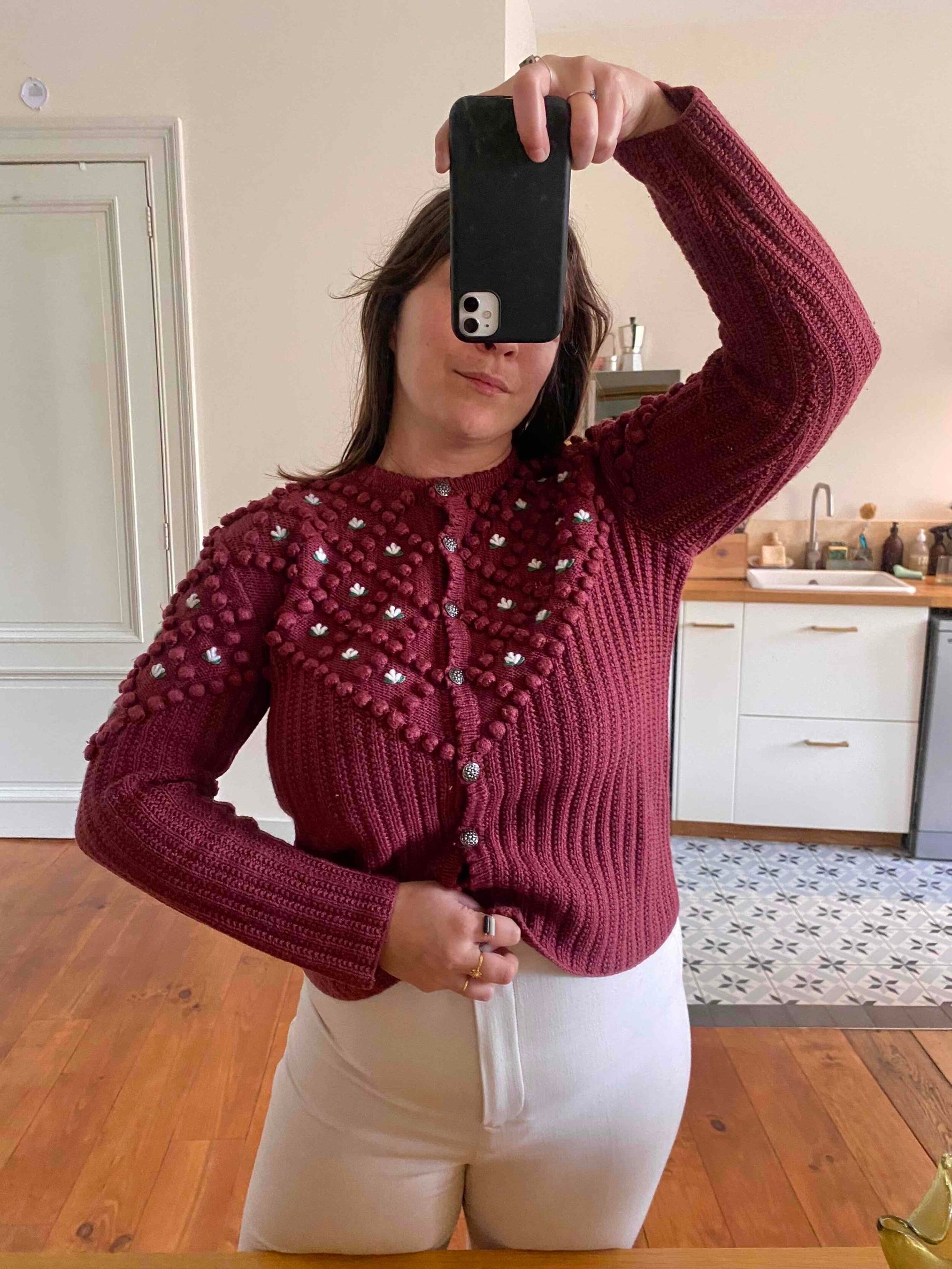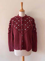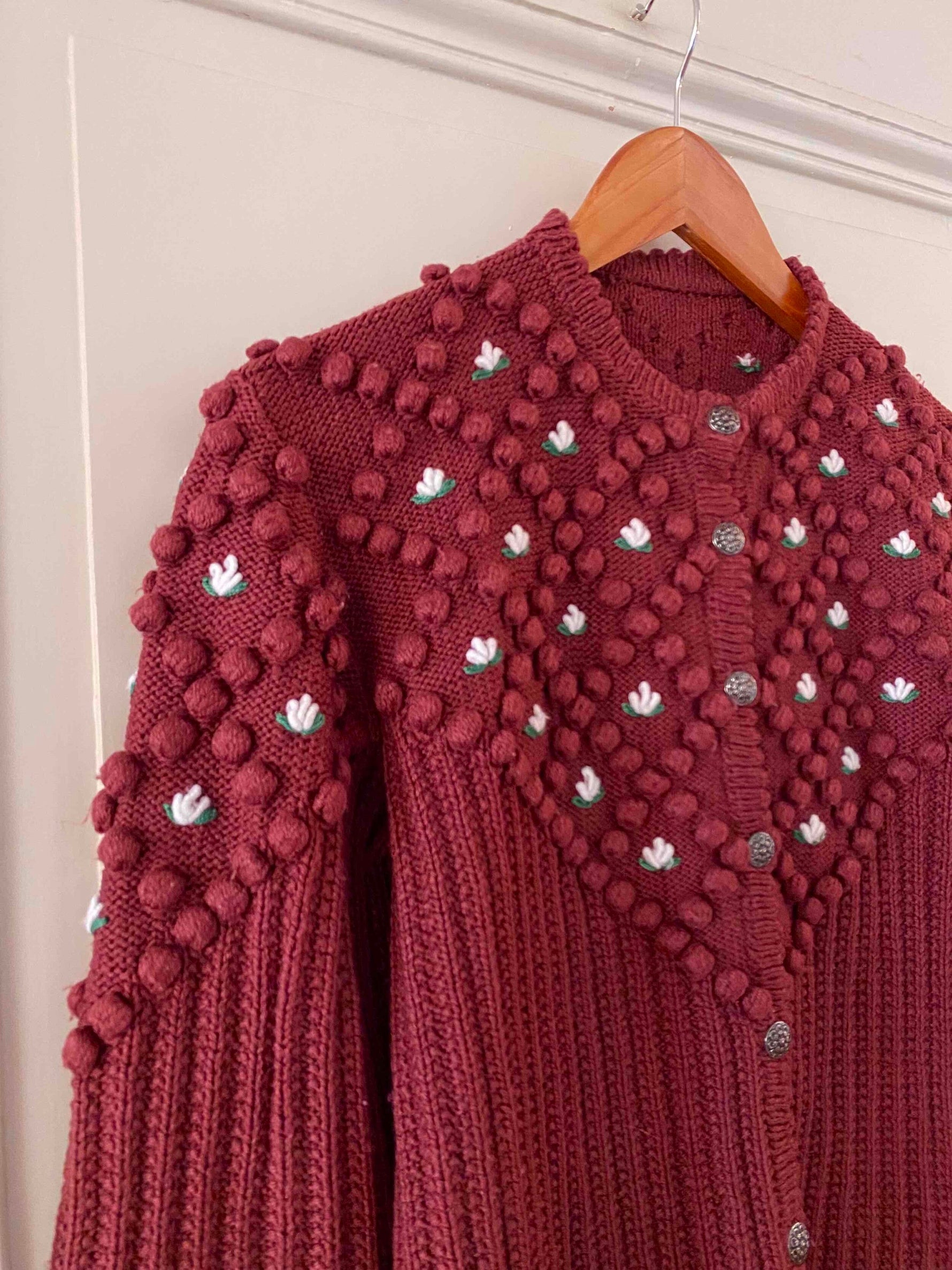 Cardigan Autrichien en laine mélangée acrylique violet prune lis de vin, maille popcorn pompons brodés, fleurs blanches et vertes brodées, manches ballons brodées, boutons bijoux argentés fleuris, tricotté mains en Autriche, taille 38 et 40 porté ici sur une personne T40 et un mannequin T36.