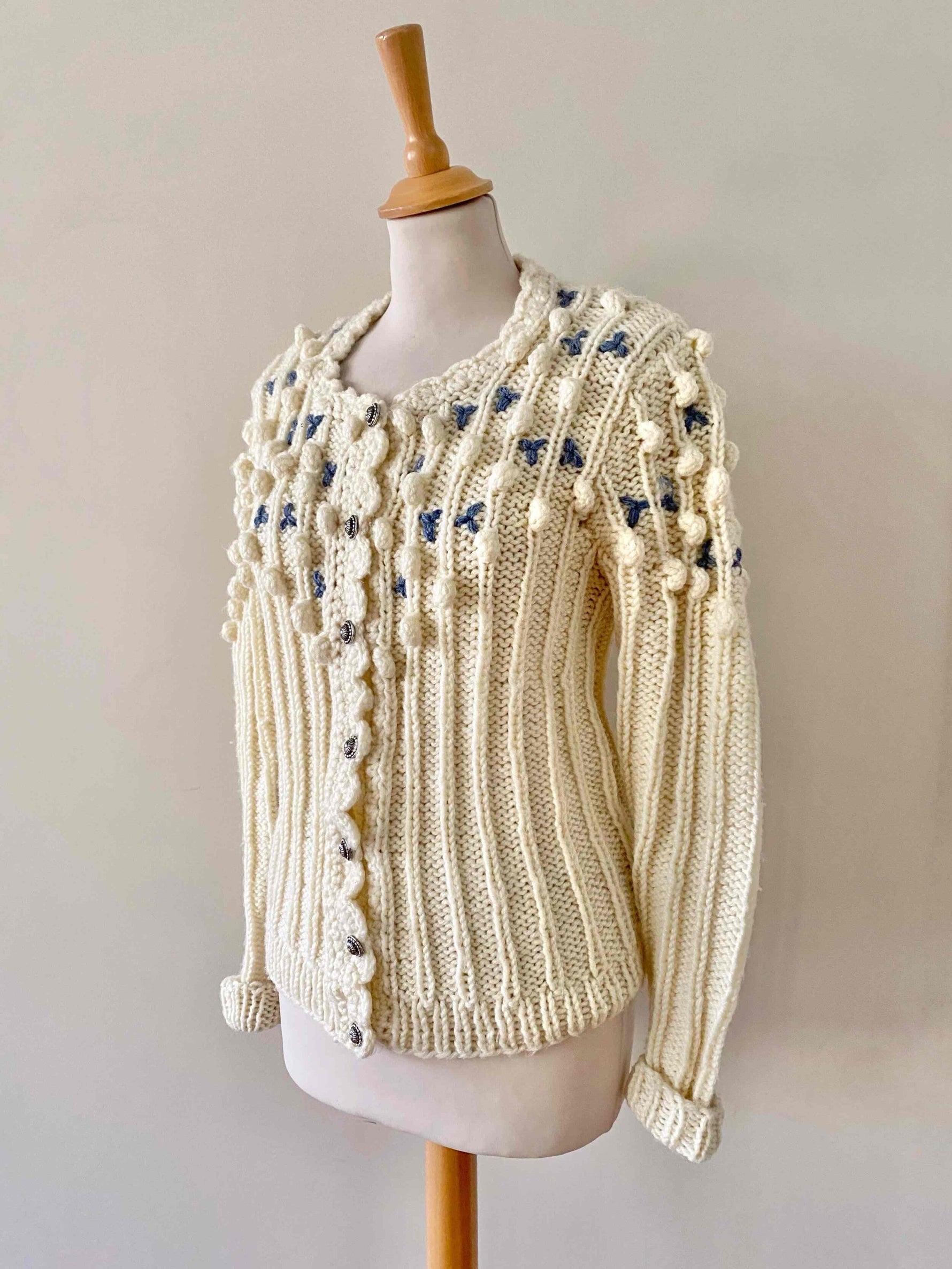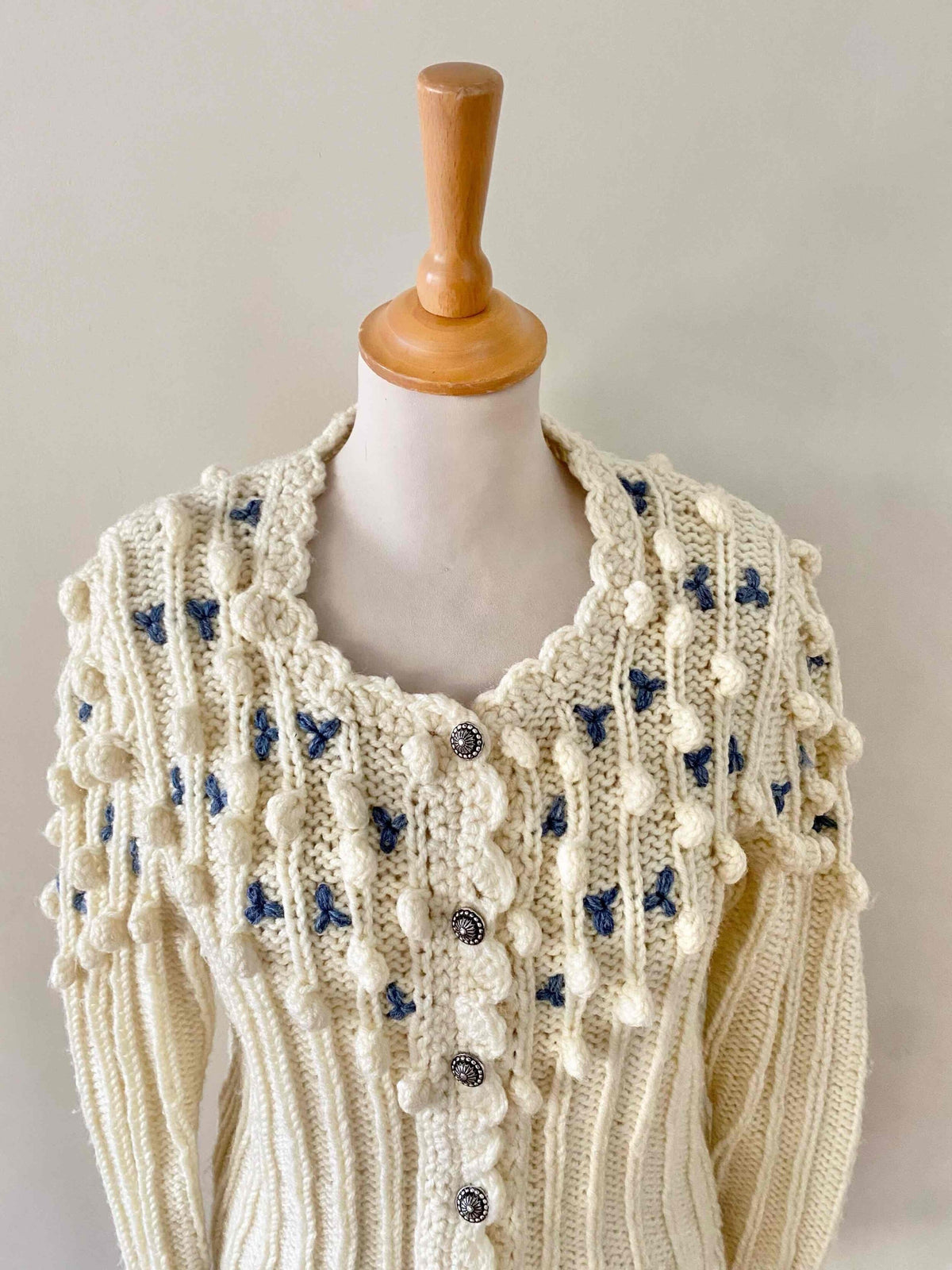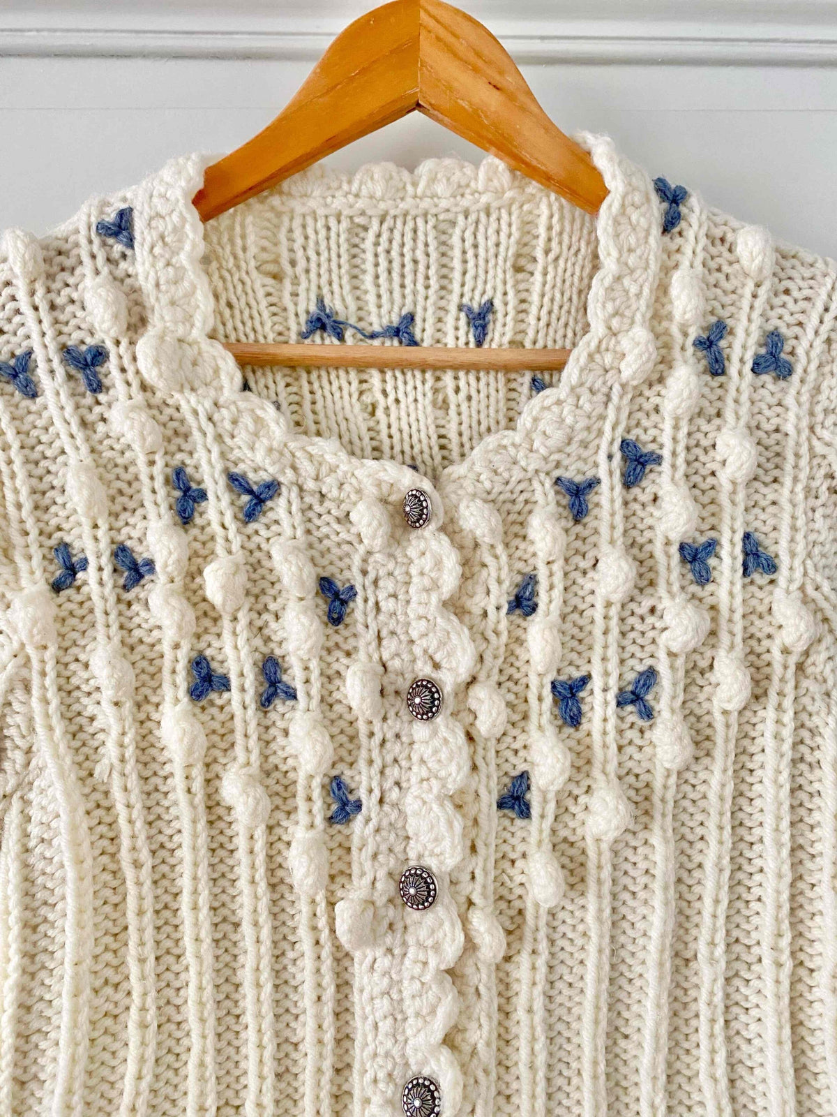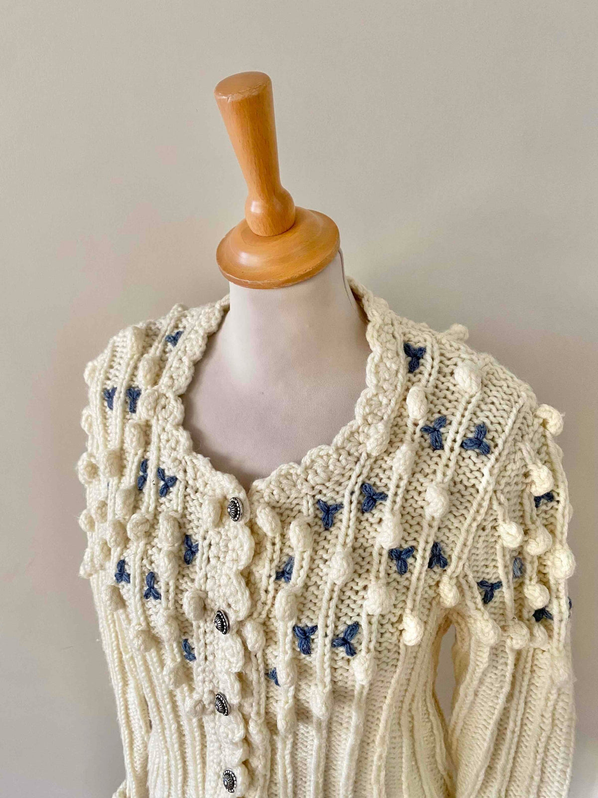 Prix unitaire parCardigan Autrichien en laine mélangée écrue, maille chunky et popcorn pompons brodés, brodé de fleurs bleues ciel, bouton bijoux argentés fleuris, tricotté mains en Autriche, taille 36 porté ici sur un mannequin T36.