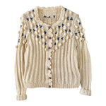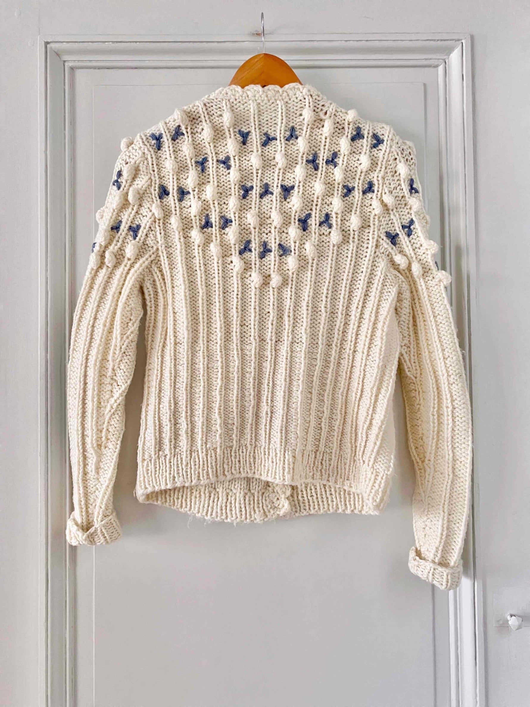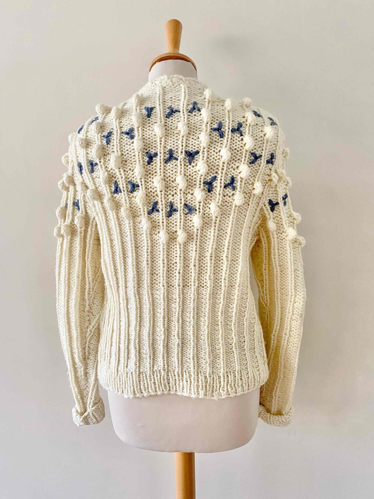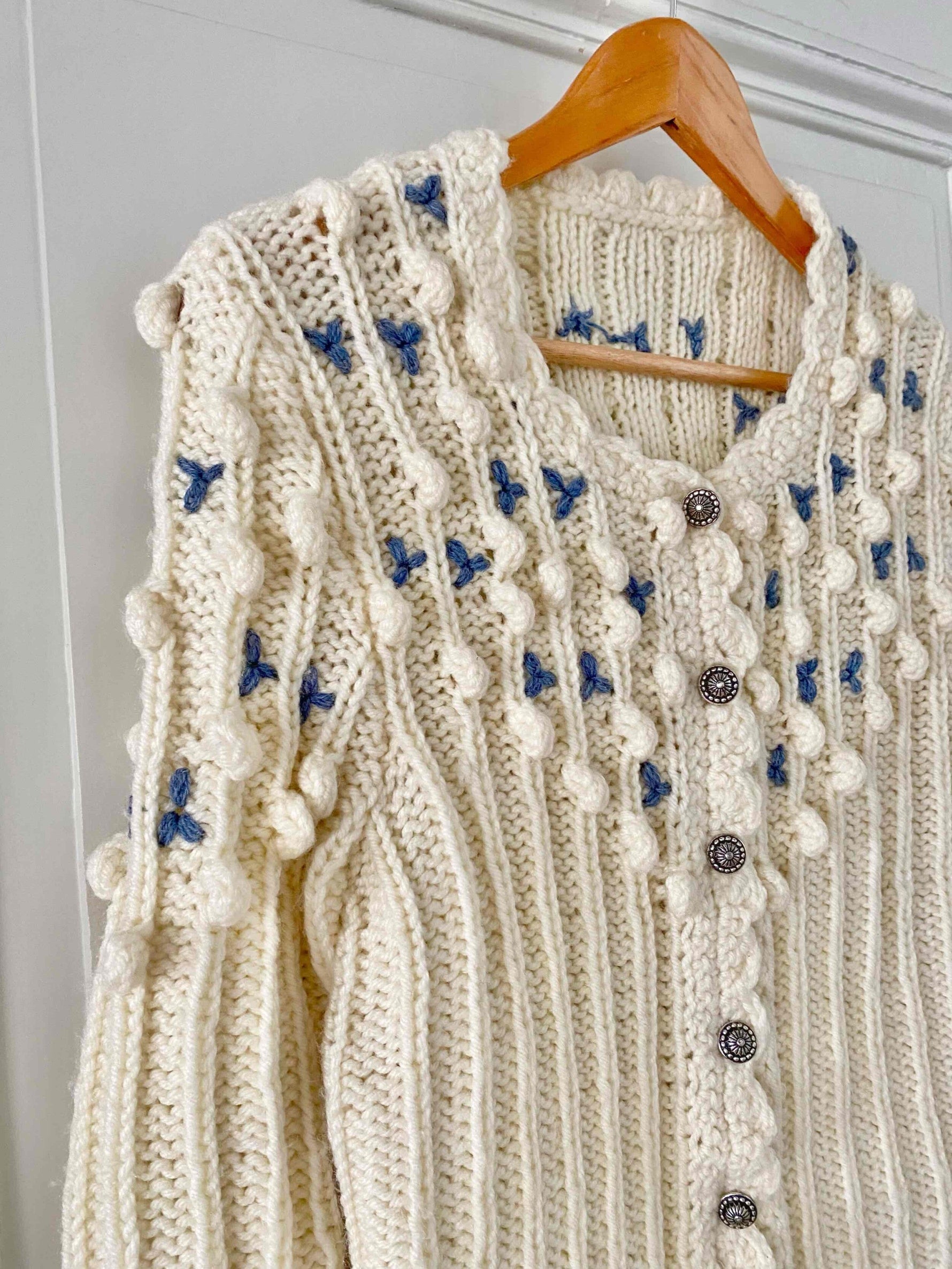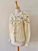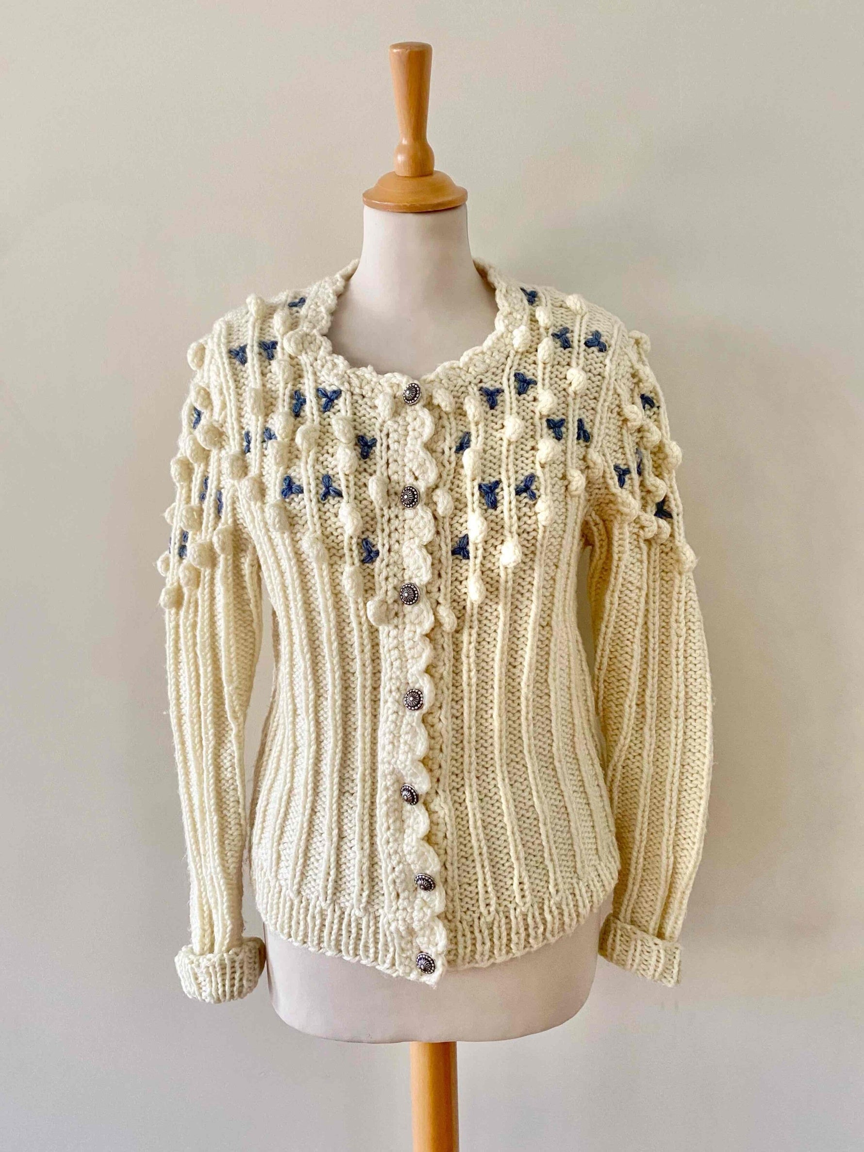 Prix unitaire parCardigan Autrichien en laine mélangée écrue, maille chunky et popcorn pompons brodés, brodé de fleurs bleues ciel, bouton bijoux argentés fleuris, tricotté mains en Autriche, taille 36 porté ici sur un mannequin T36.