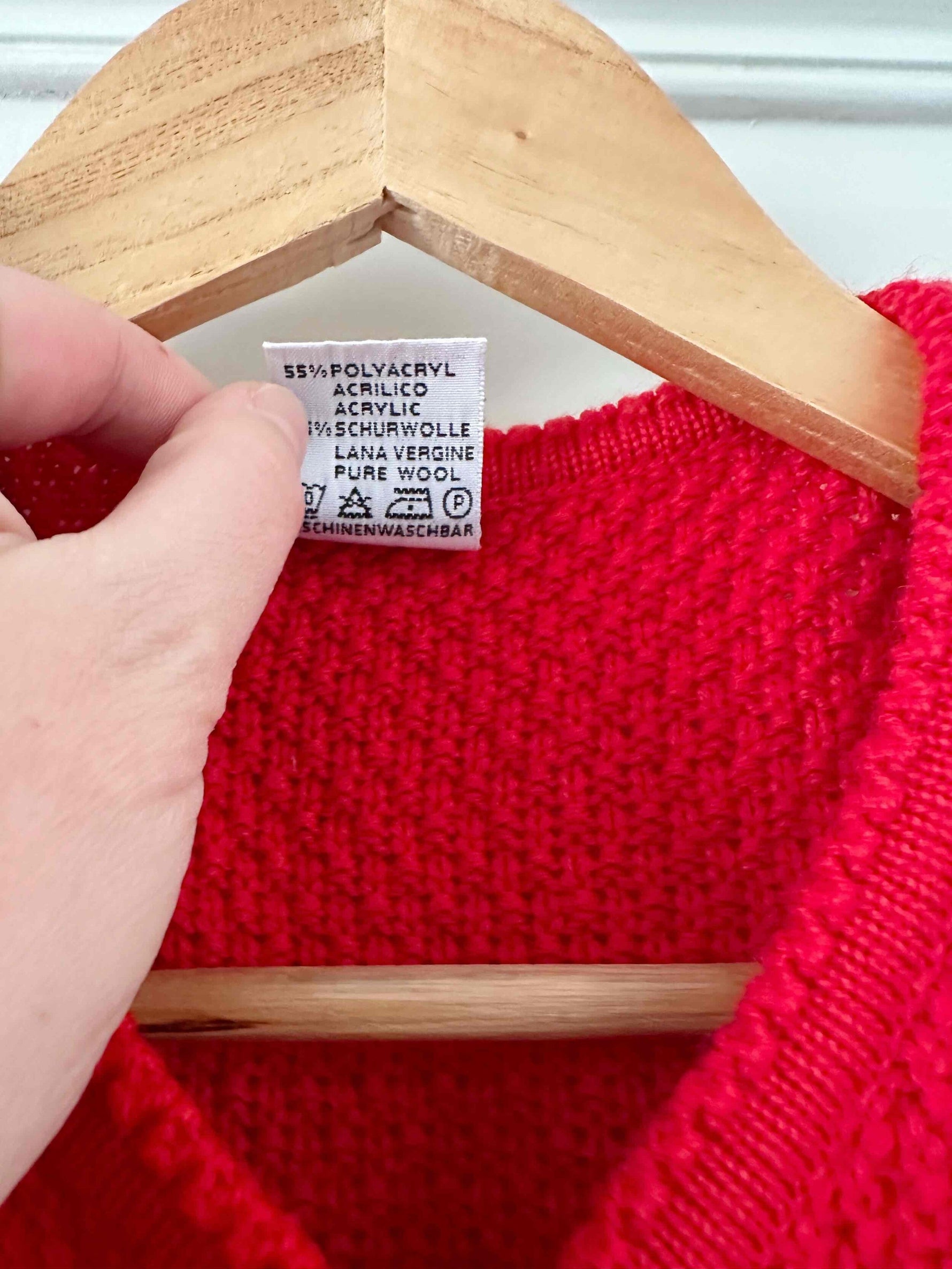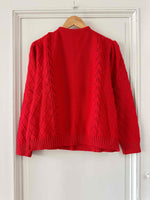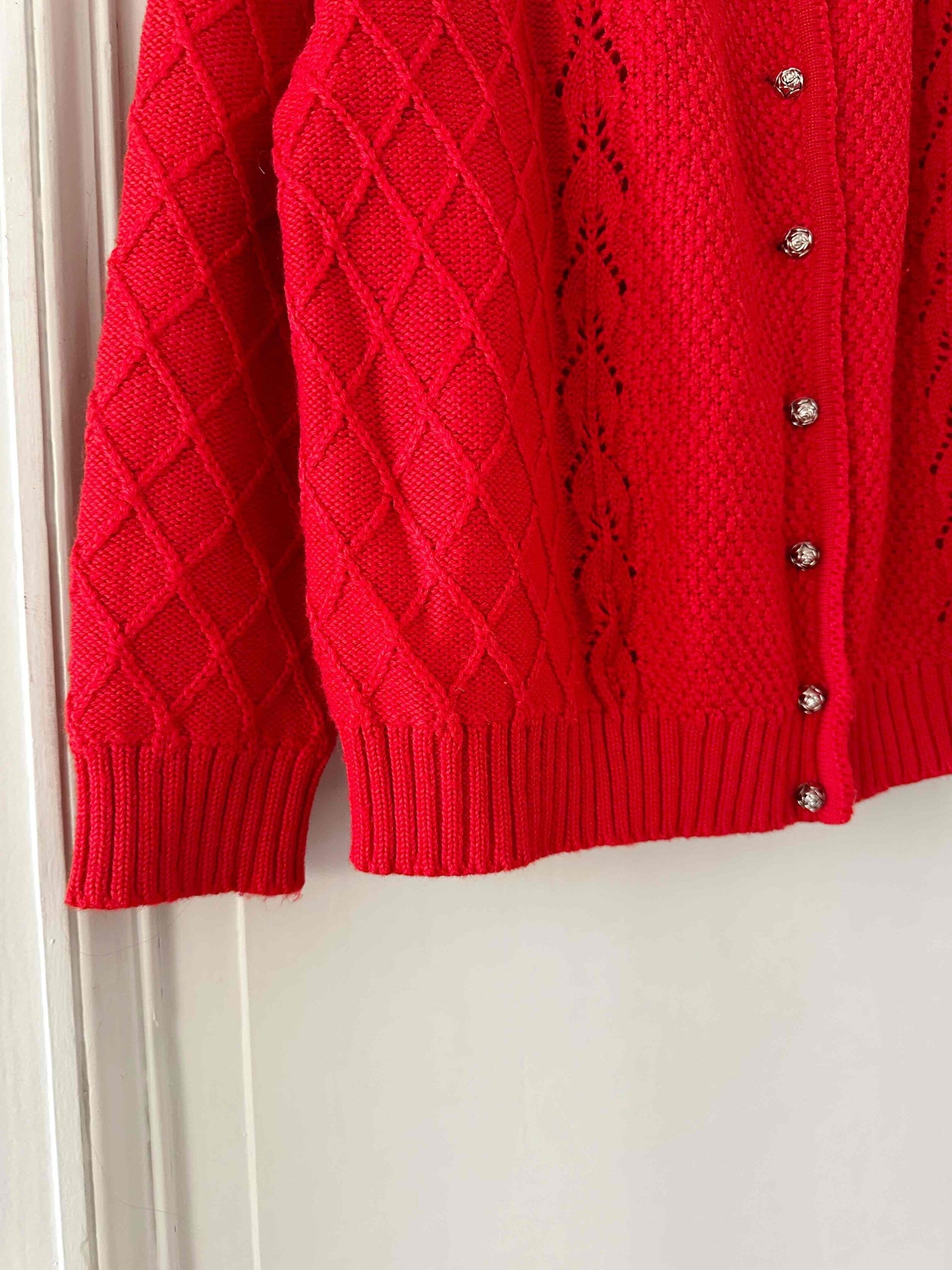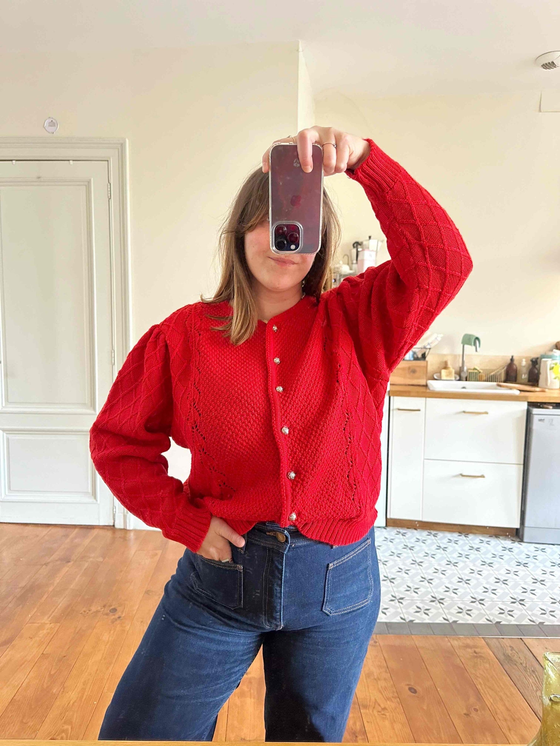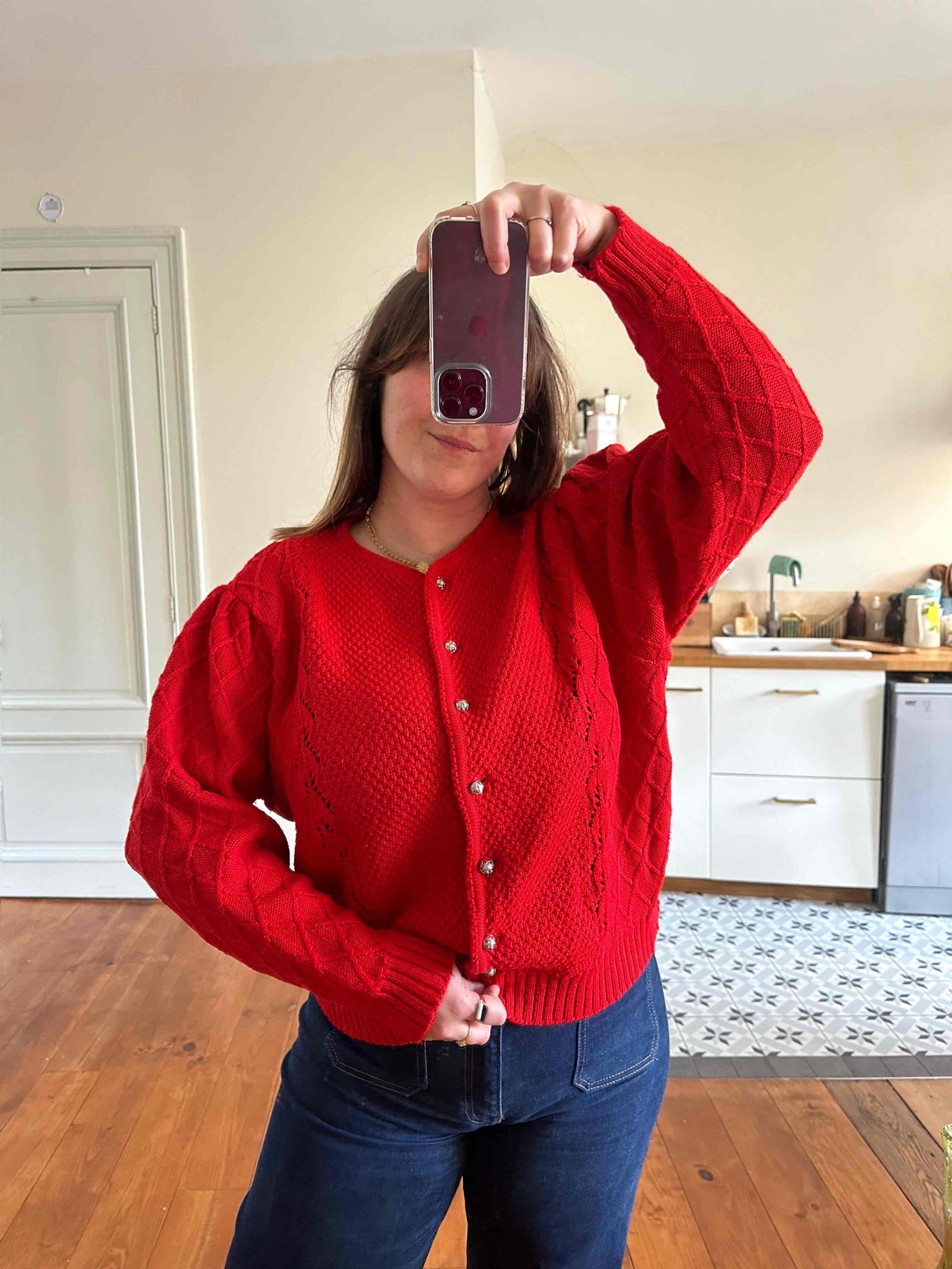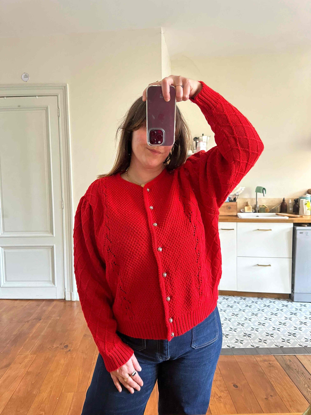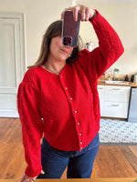 Prix unitaire parCardigan autrichien en laine mélangée rouge vermillon, maille ajourée et torsades en losanges, manches ballons froncées, forme boite, boutons bijoux argentés fleuris, fabriqué en Autriche, taille 42 et 44 porté ici sur une personne T40.