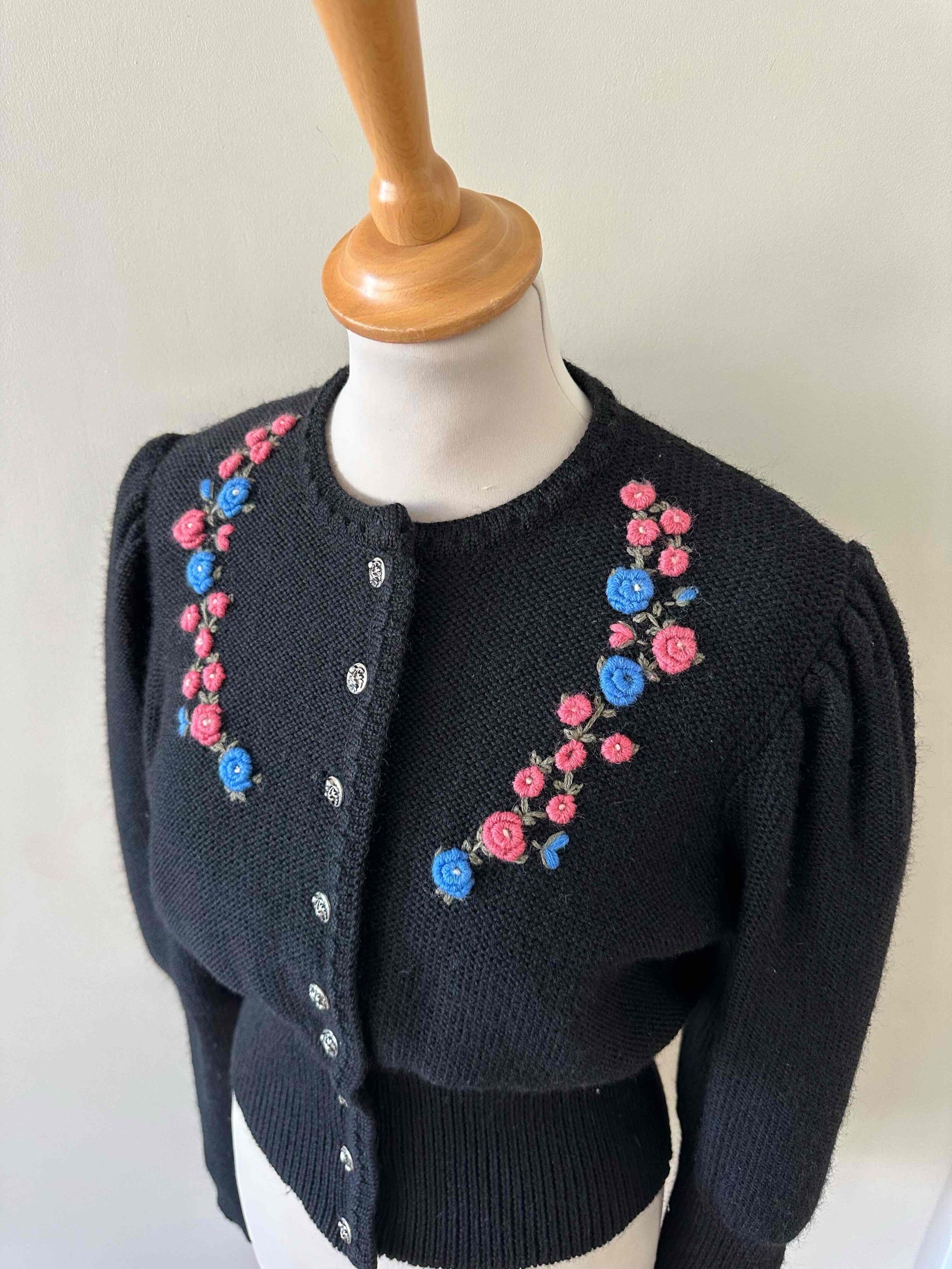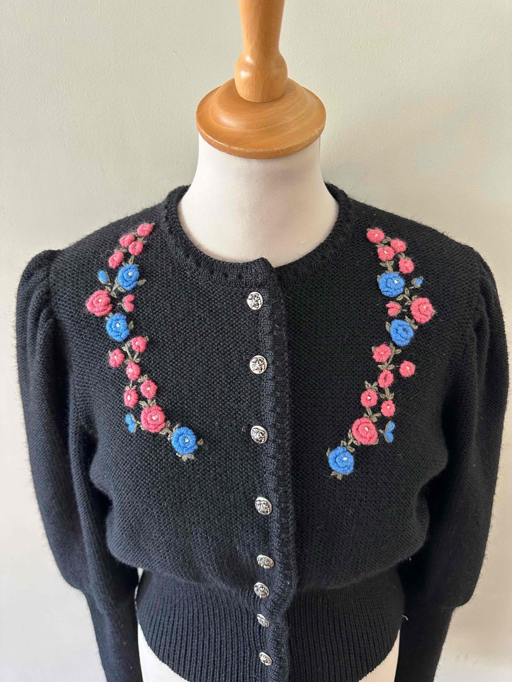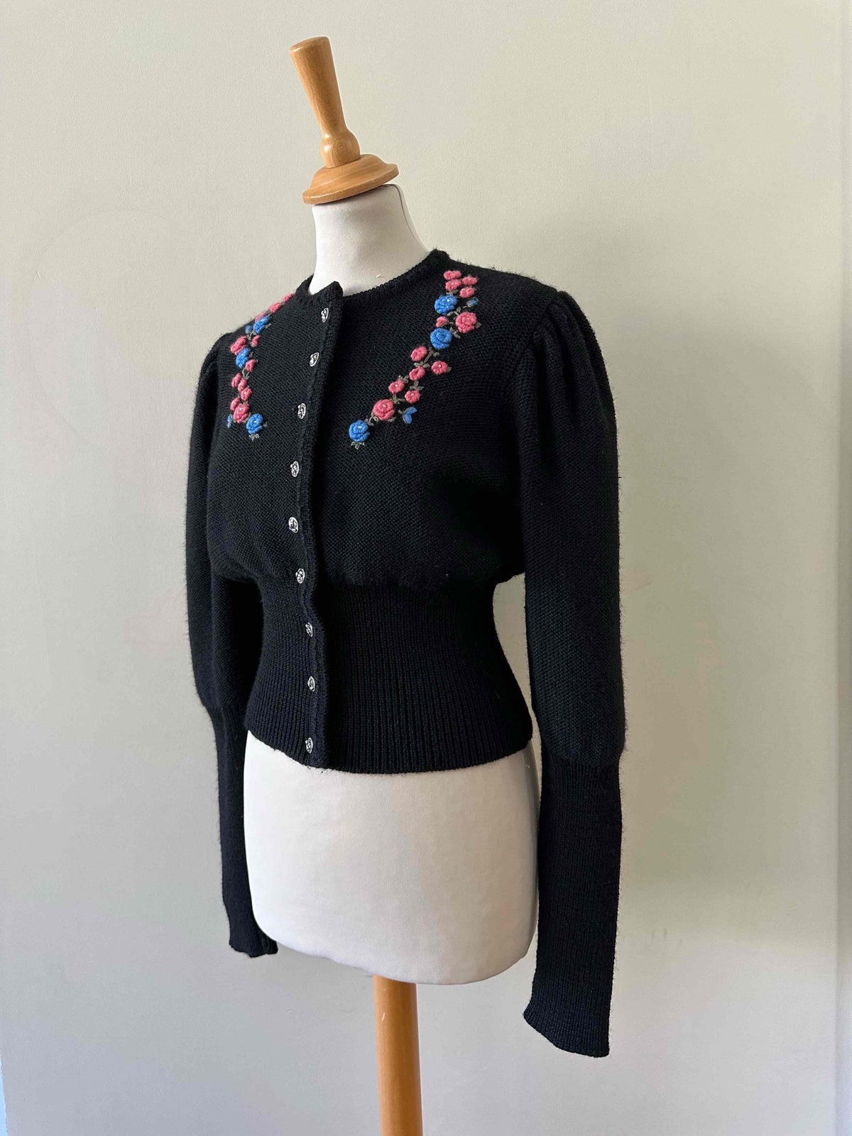Prix unitaire parCardigan autrichien, en pure laine noire brodé de fleurs roses poudrées et bleues ciels, manches ballons aux poignets longs, taille haute côtelée, fabriqué en Autriche, taille 36 porté ici sur un mannequin T36.