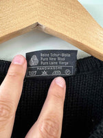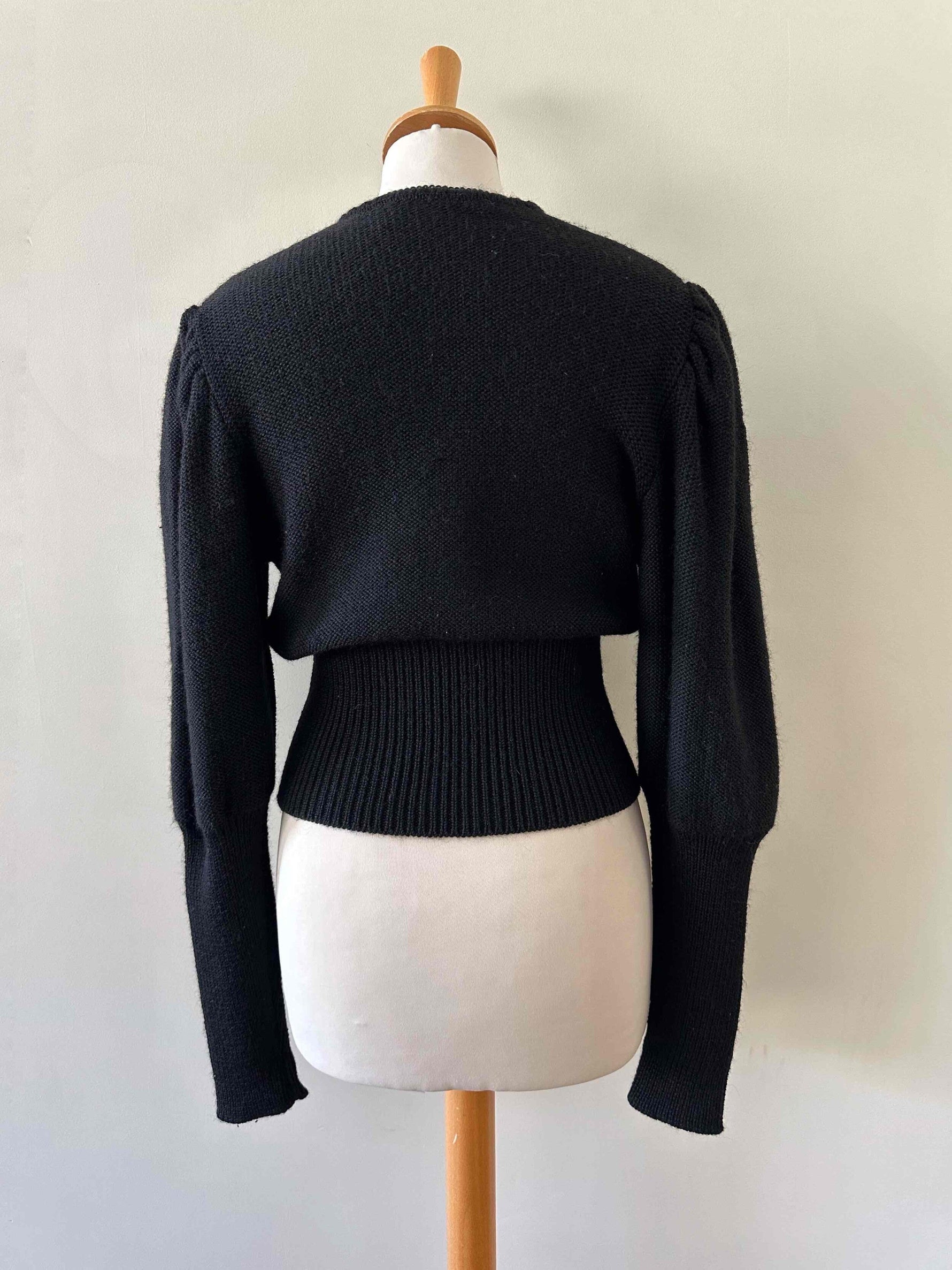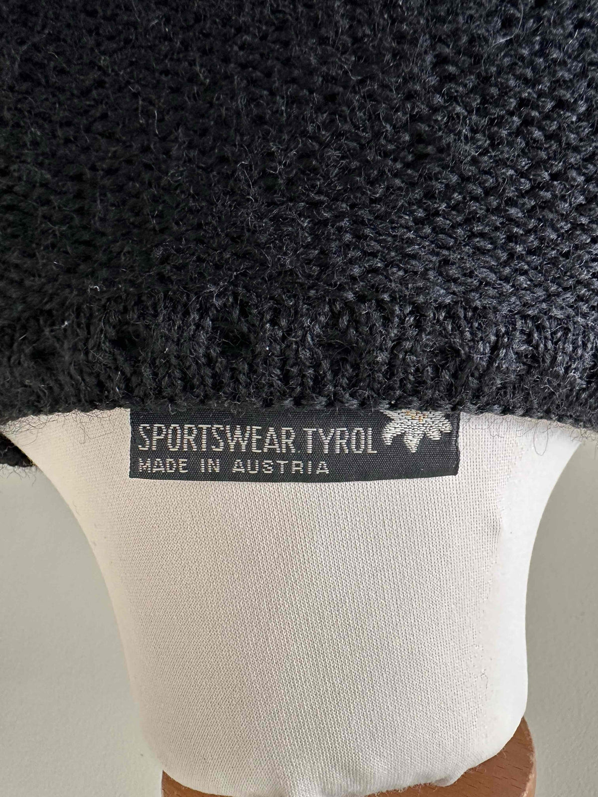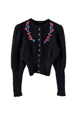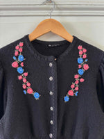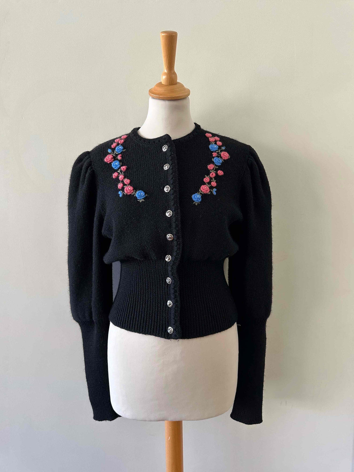 Prix unitaire parCardigan autrichien, en pure laine noire brodé de fleurs roses poudrées et bleues ciels, manches ballons aux poignets longs, taille haute côtelée, fabriqué en Autriche, taille 36 porté ici sur un mannequin T36.